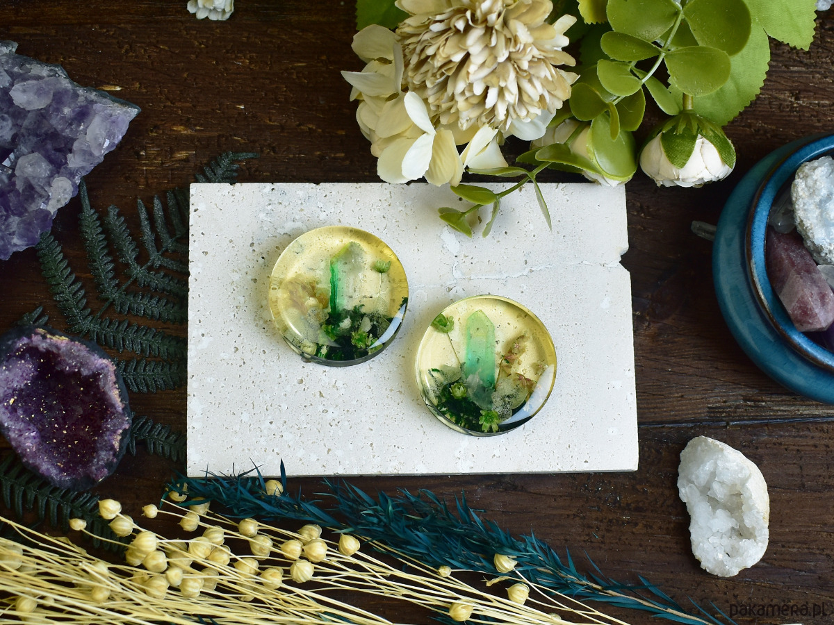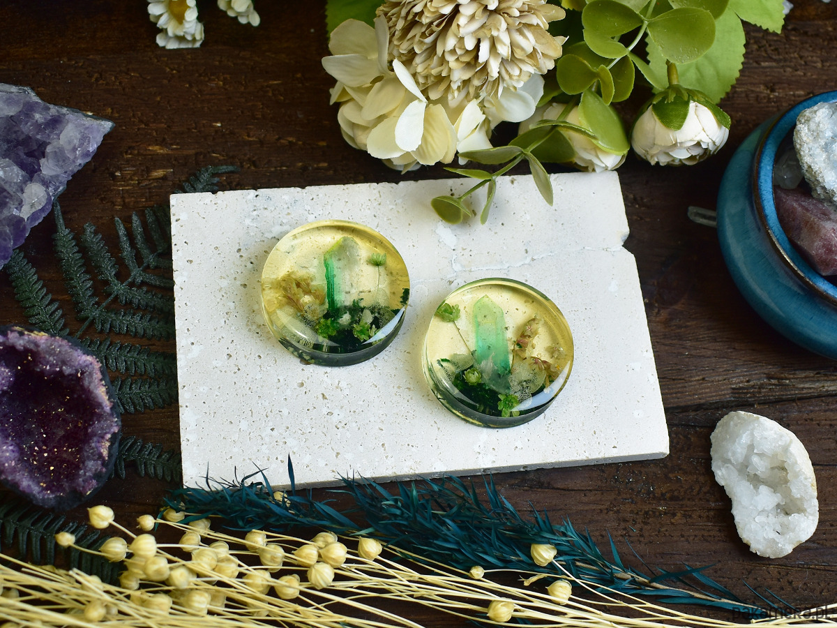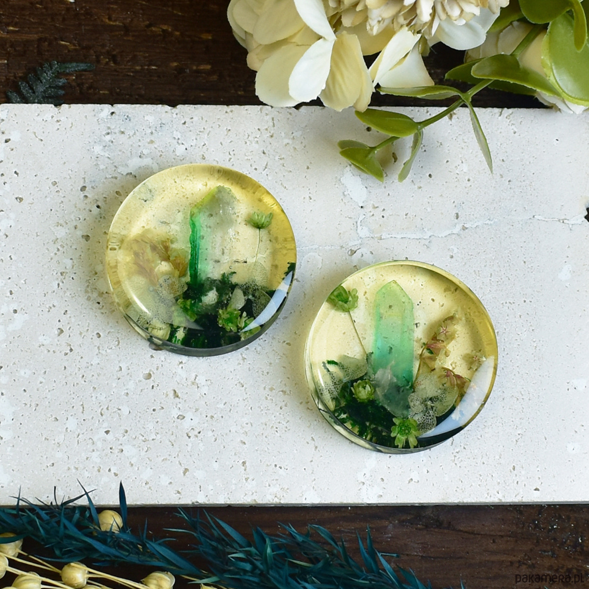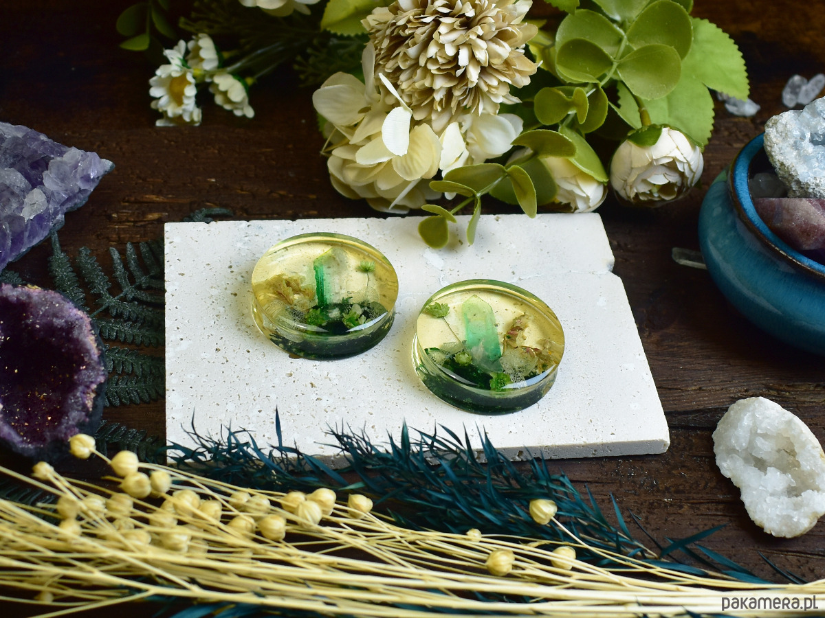 Ręcznie wykonane tunele do uszu z żywicy, w których zatopiono mech, drobne kwiatki i kryształki kwarcu, przypominają o tajemniczym, magicznym lesie. Każdy tunel to wyjątkowa kompozycja inspirowana naturą, pełna subtelnych detali i blasku kryształów. Te unikatowe ozdoby wprowadzają atmosferę baśniowego świata. Zaleca się noszenie ich wyłącznie w wygojonych tunelach, aby zapewnić komfort i bezpieczeństwo.