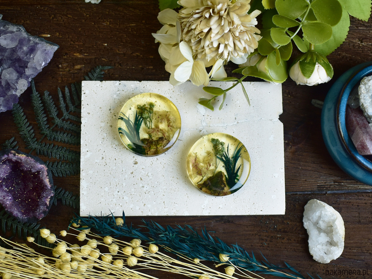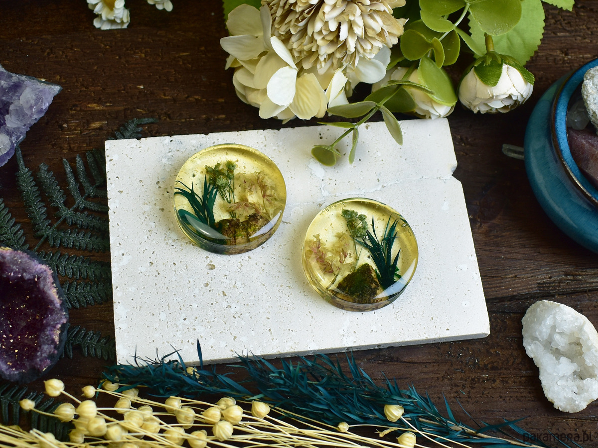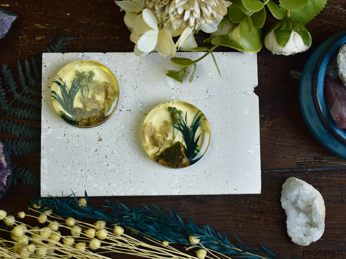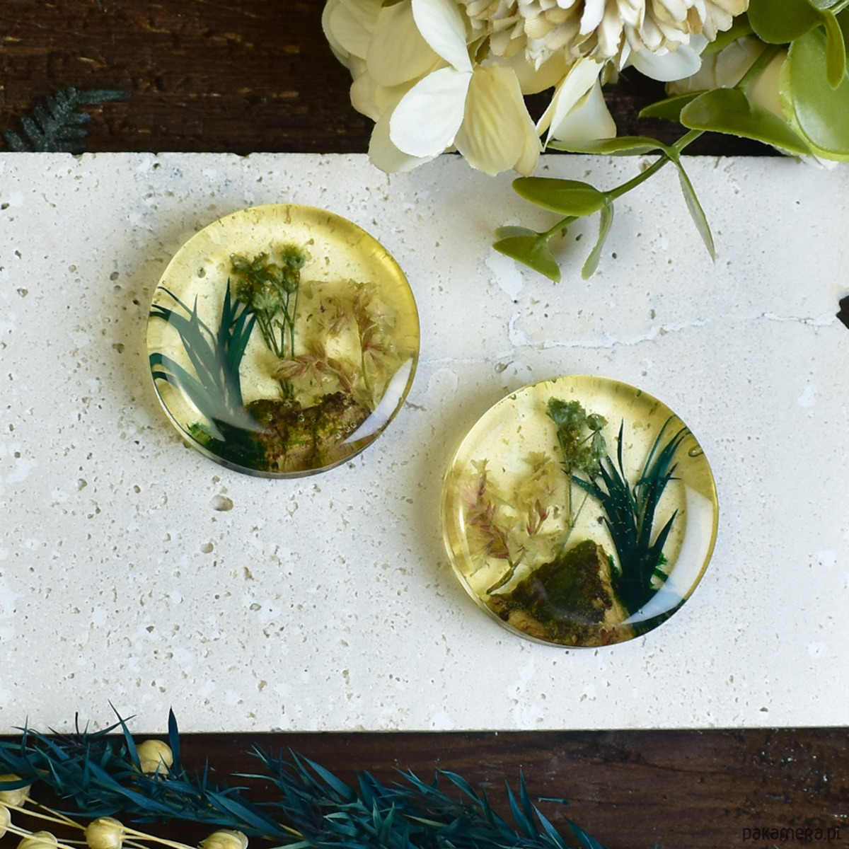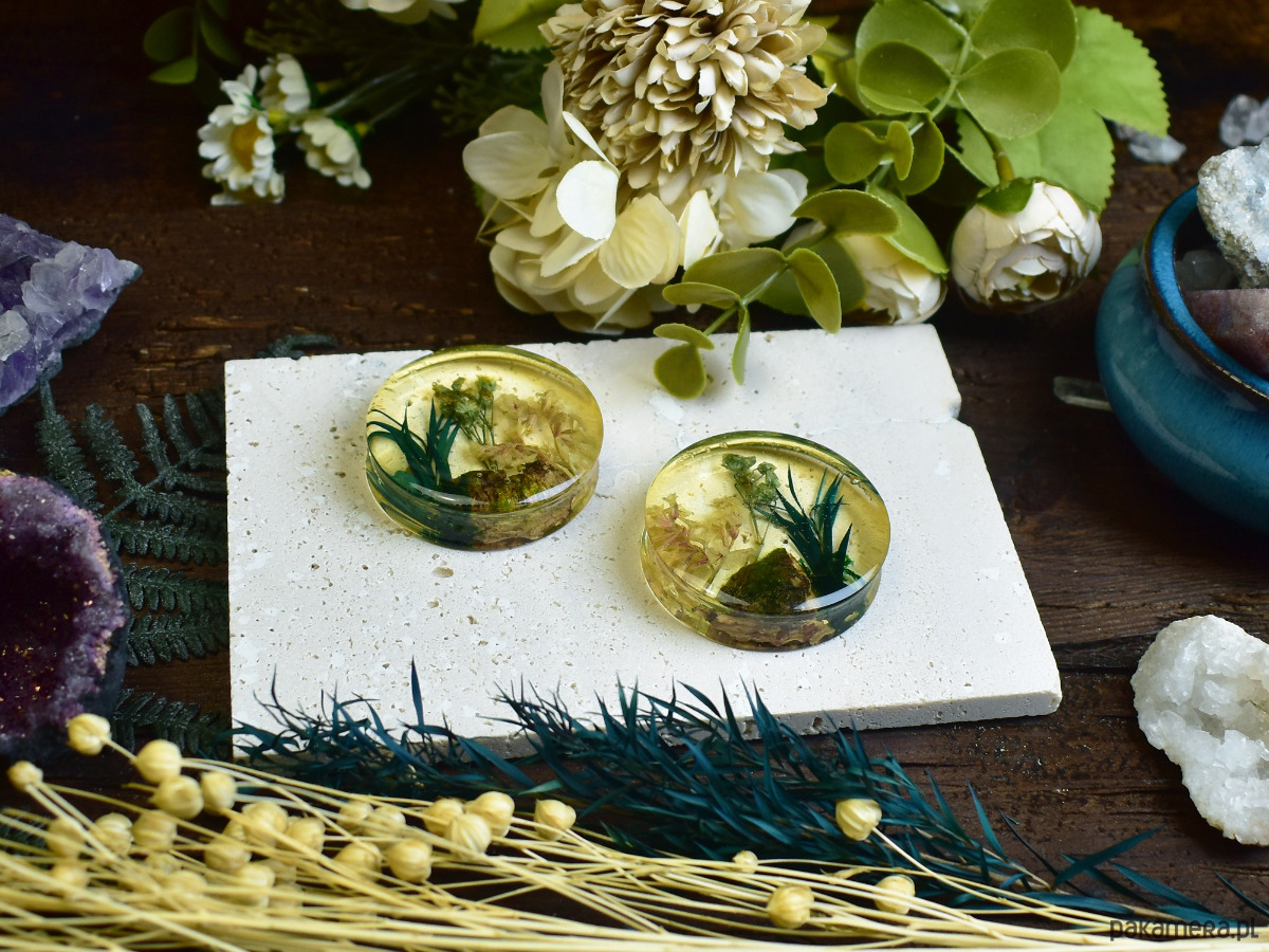 Ręcznie wykonane tunele do uszu z żywicy, w których zatopiono suszoną trawę i delikatne kwiaty, tworzą naturalną i subtelną kompozycję. Każda para jest unikatowa, przywołując na myśl letnie łąki i bliskość natury. Zaleca się noszenie tuneli wyłącznie w wygojonych dziurkach, aby zapewnić komfort i ochronę skóry.