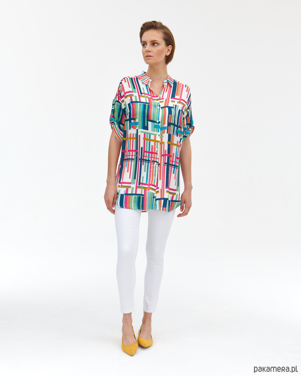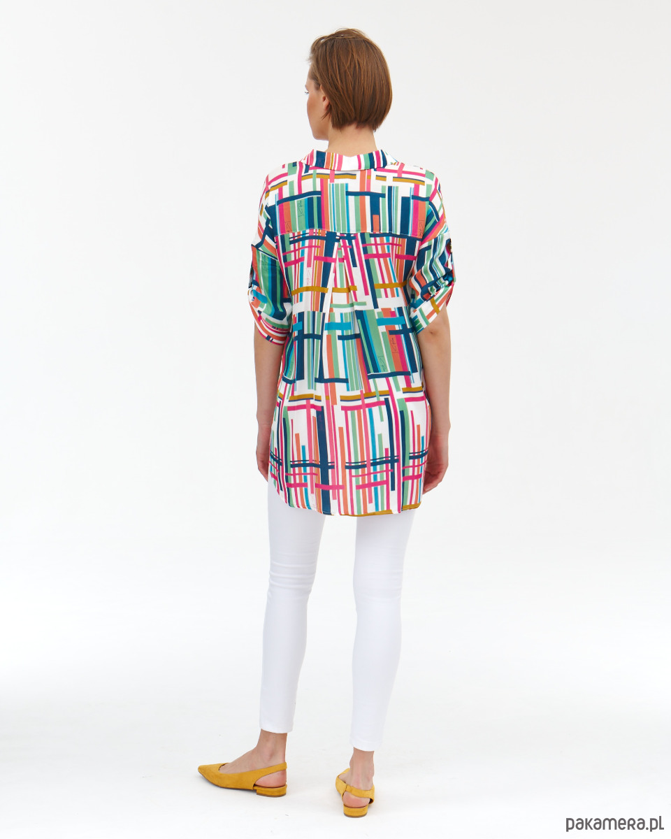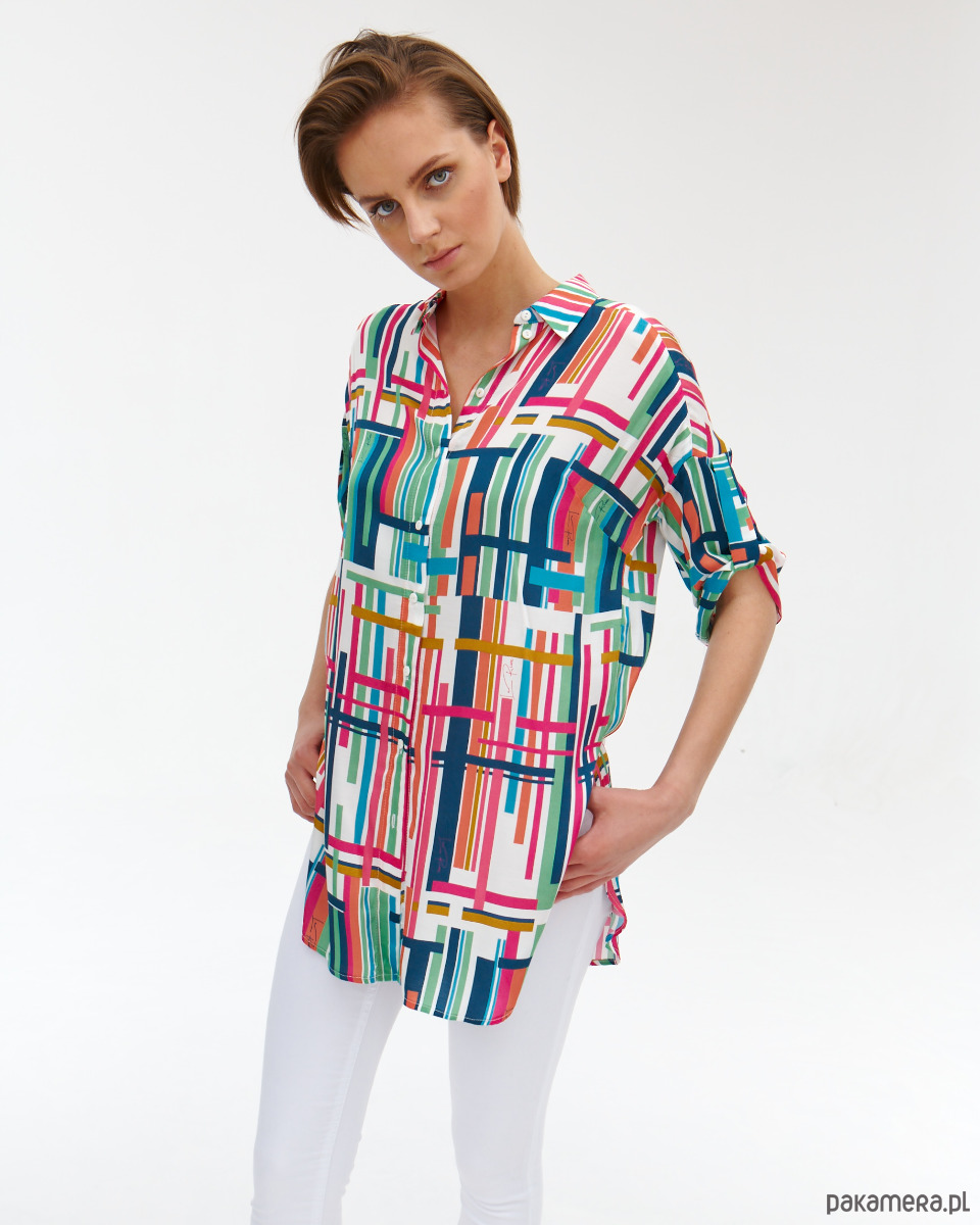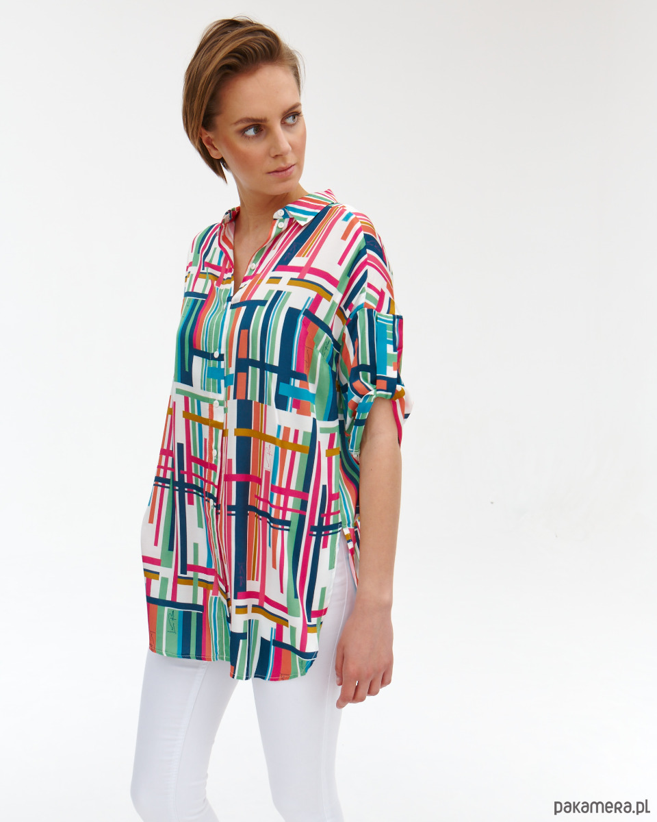 Tunika Dublin z tkaniny wiskozowej o satynowym, szlachetnym splocie. Druk autorski. Prosty koszulowy, krój z półokrągłym dołem. Delikatnie opadające rękawki z podciągnięciem. Kołnierzyk na stójce. Zapinana na guziki.
