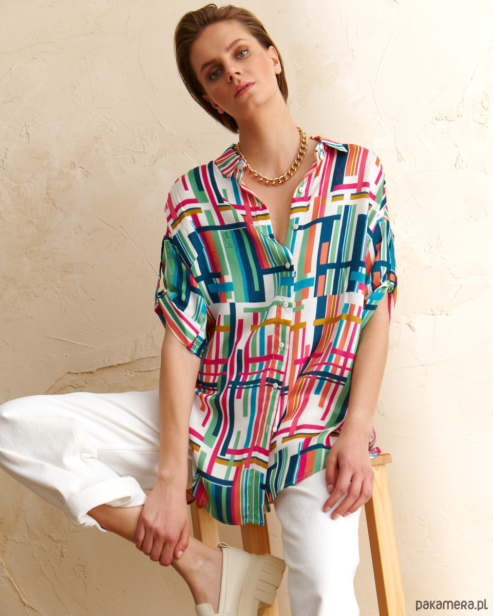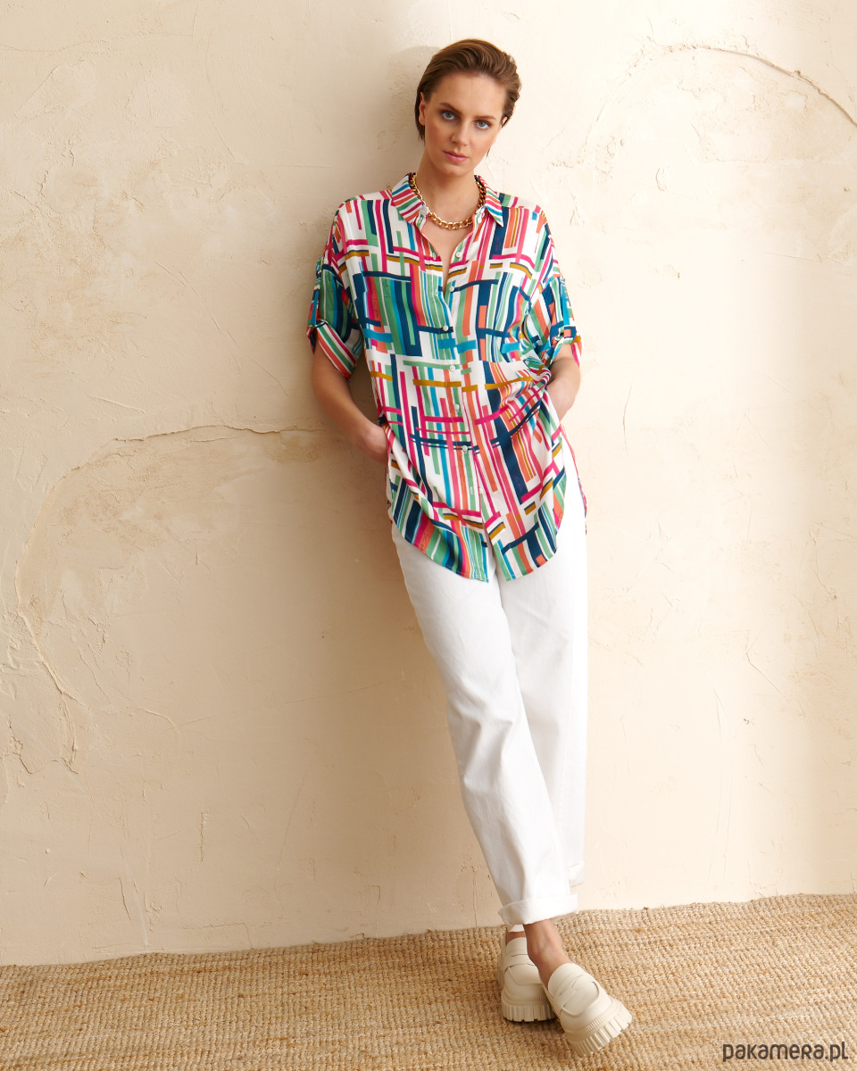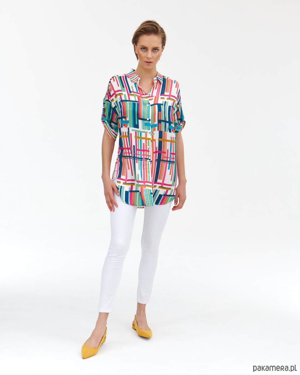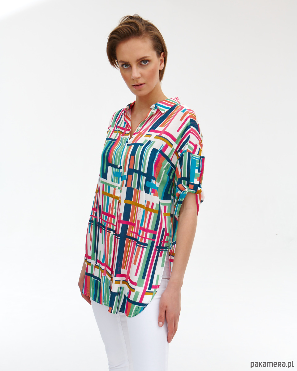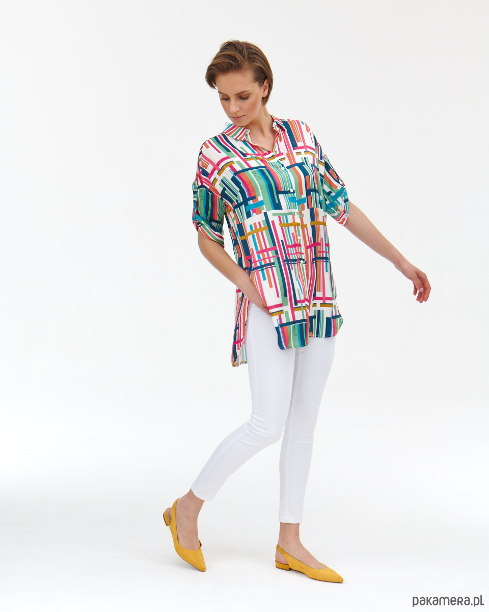 Tunika Dublin z tkaniny wiskozowej o satynowym, szlachetnym splocie. Druk autorski. Prosty koszulowy, krój z półokrągłym dołem. Delikatnie opadające rękawki z podciągnięciem. Kołnierzyk na stójce. Zapinana na guziki.