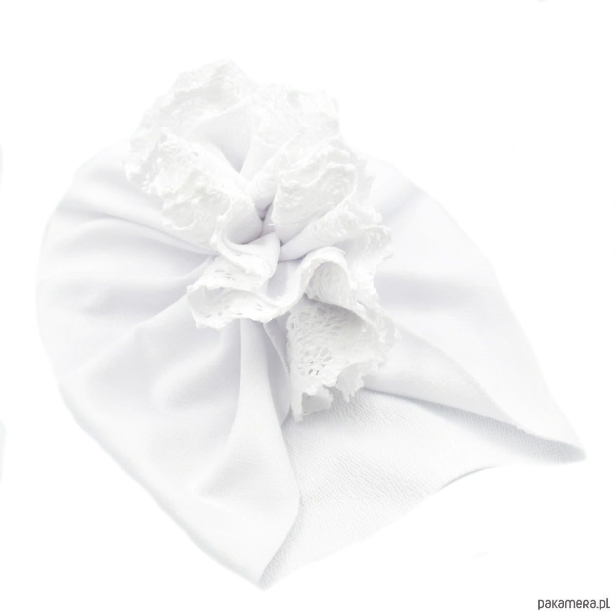 Turban czapeczka bawełniana biała z koronką na chrzest