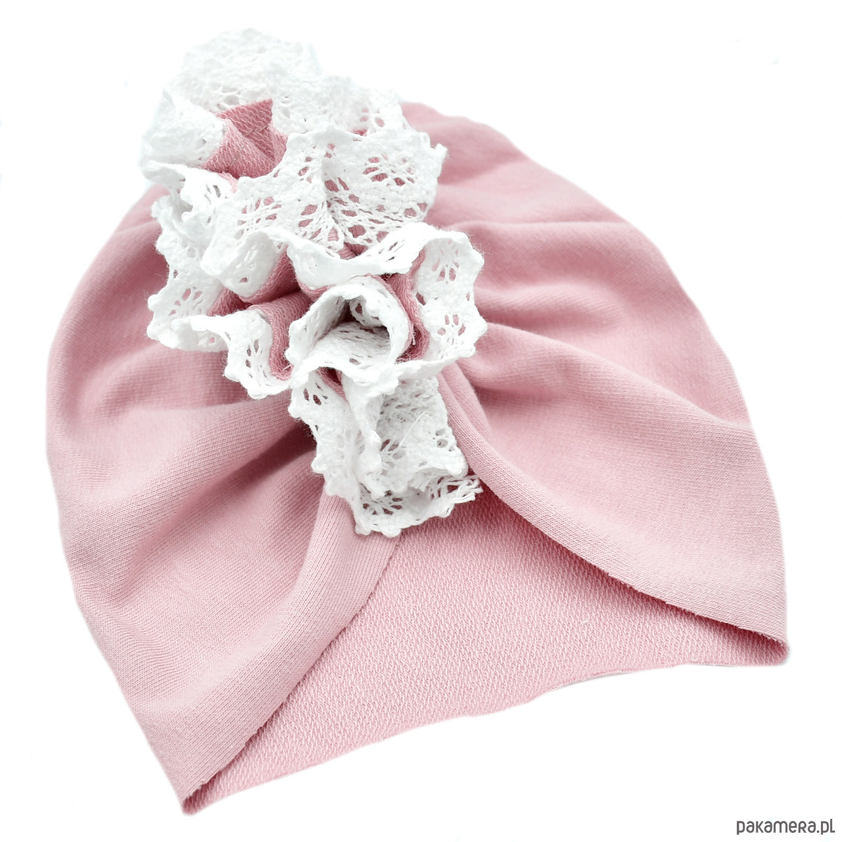 Turban uszyty jest z jednej warstwy materiału, falbanka wykończona koronką
