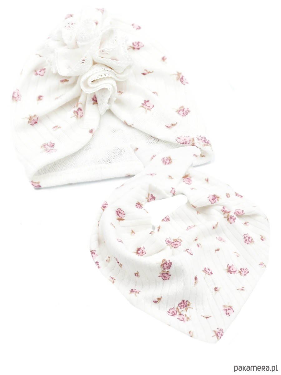 Komplet wykonany jest z wysokiej jakości dzianiny bawełnianej, prążkowanej, która jest miękka i elastyczna, dobrze dopasowuje się do główki dziecka, dzięki czemu wygodnie się go nosi.