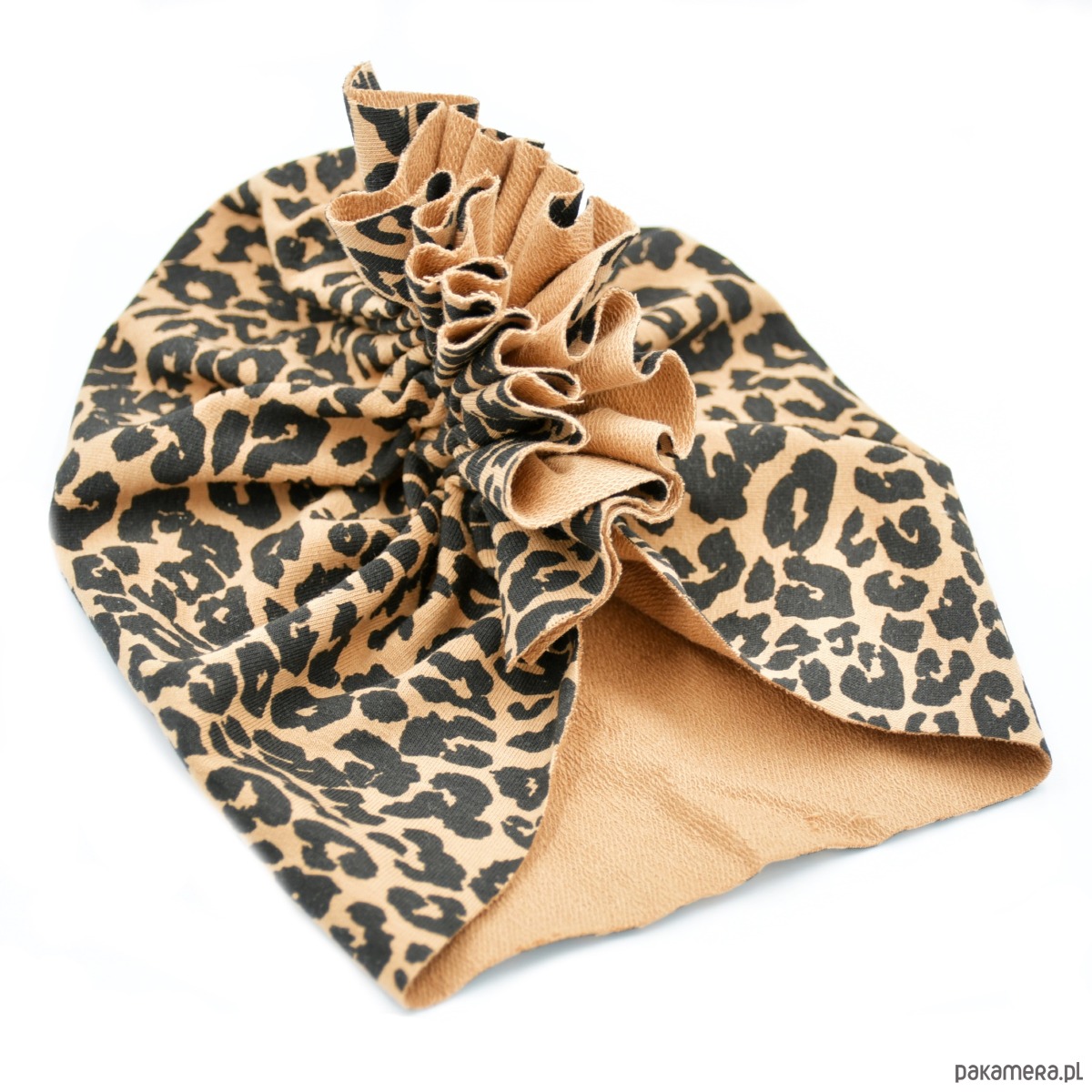 Turban uszyty jest z jednej warstwy materiału, brzegi są surowo wykończone i dzięki temu ładnie się wywijają.