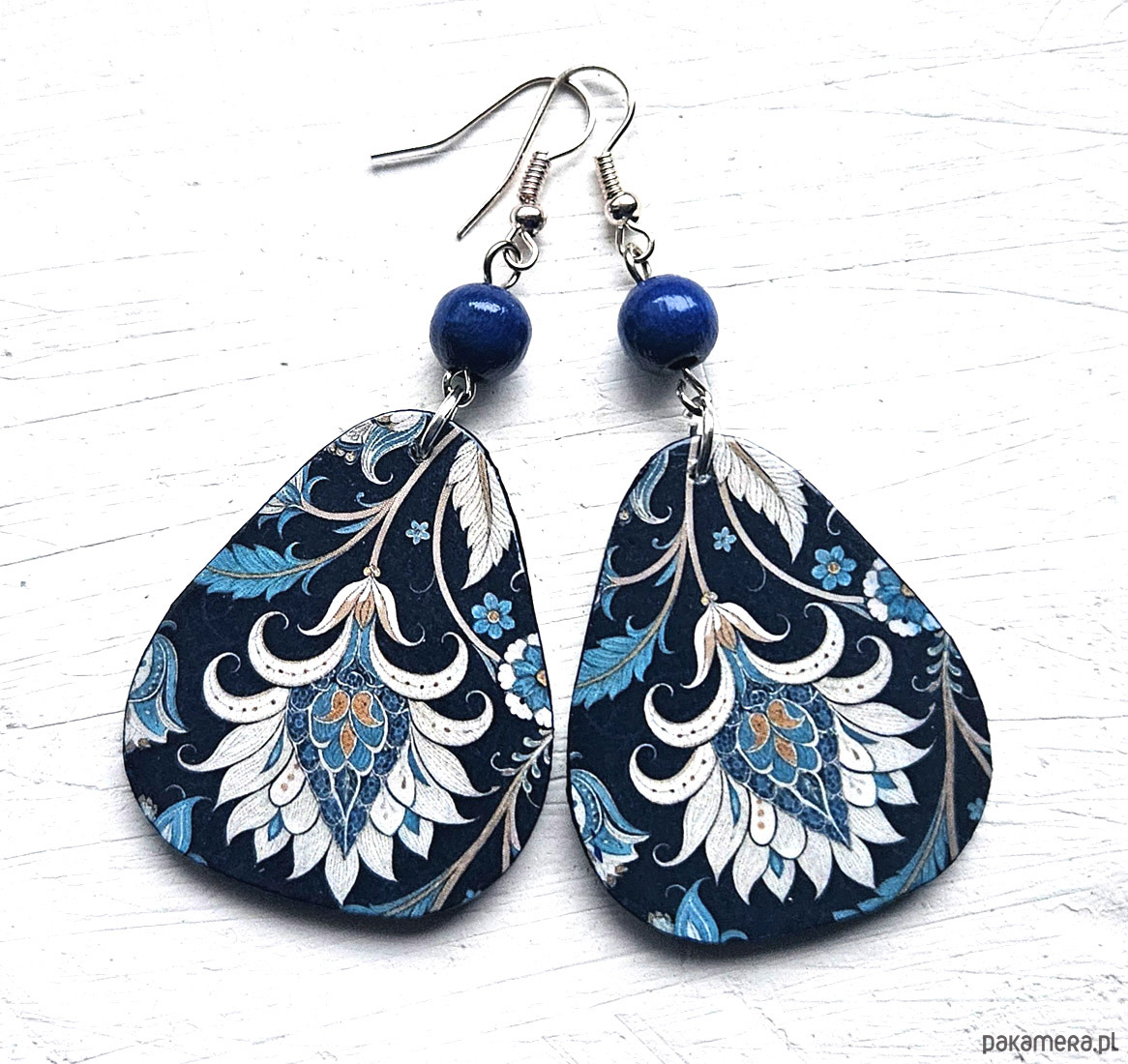 kolczyki drewniane, ozdobione metodą decoupage, dwustronne, starannie wykończone farbami akrylowymi i zabezpieczone wielokrotnie lakierem, bigle posrebrzane, długość kolczyków bez bigli: 5,5 cm, szerokość: 3,5 cm, bardzo lekkie