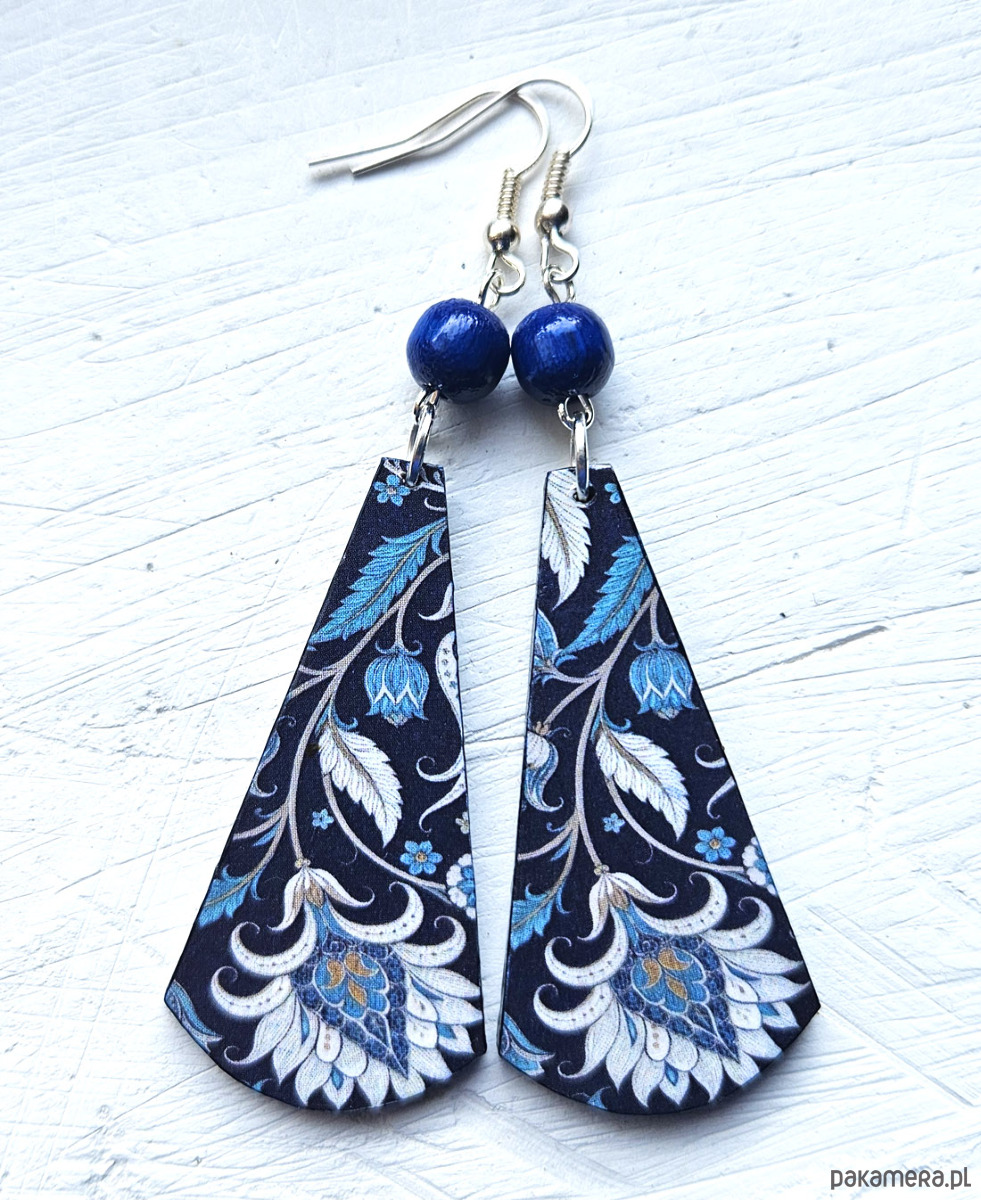 kolczyki drewniane, ozdobione metodą decoupage, dwustronne, starannie wykończone farbami akrylowymi i zabezpieczone wielokrotnie lakierem, bigle posrebrzane, długość kolczyków bez bigli: 6,5 cm, szerokość: 2 cm, bardzo lekkie