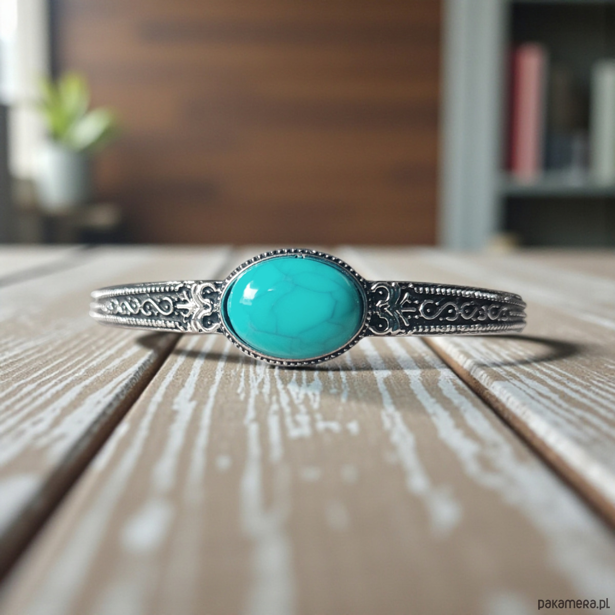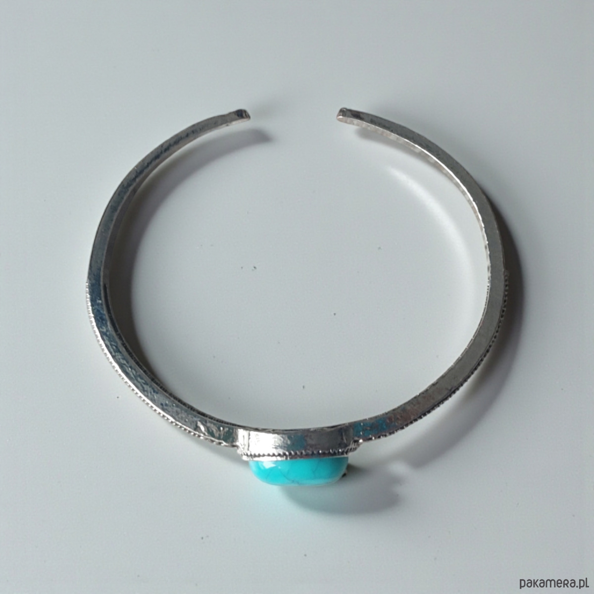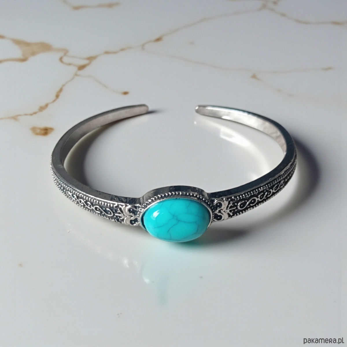 Unikatowa bransoletka otwarta z wygodną regulacją, ozdobiona turkusem. Pasować będzie zatem na każdy rozmiar nadgarstka.