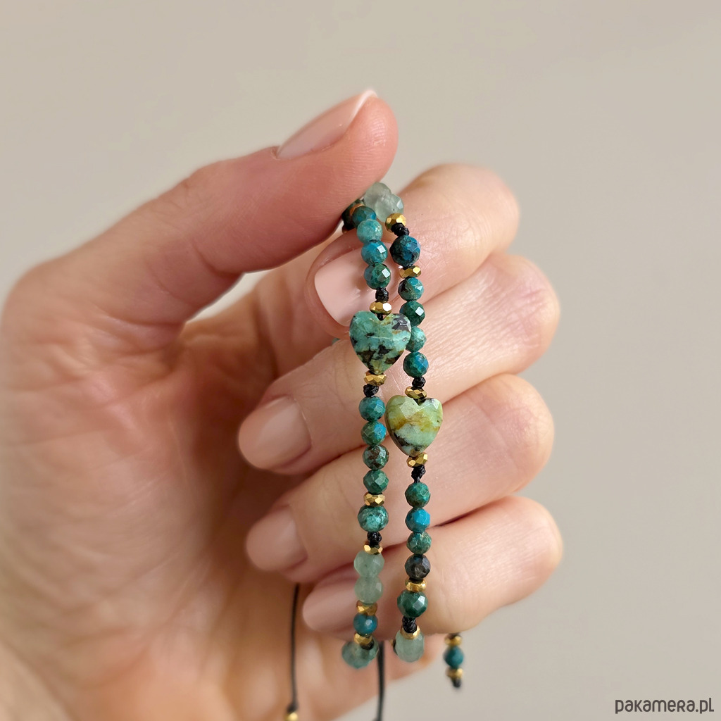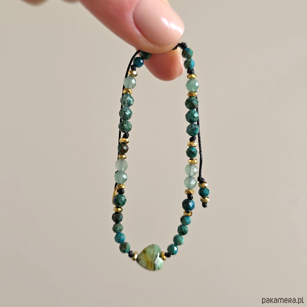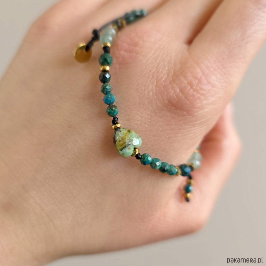 Bransoletka Fullness of gentle flow wykonana jest z kamieni naturalnych - turkusu afrykańskiego, chryzokoli, awenturynu zielonego i hematytu oraz nylonowego sznureczka. Bransoletka będzie odpowiednia na nadgarstek o obwodzie 15-16,5 cm.