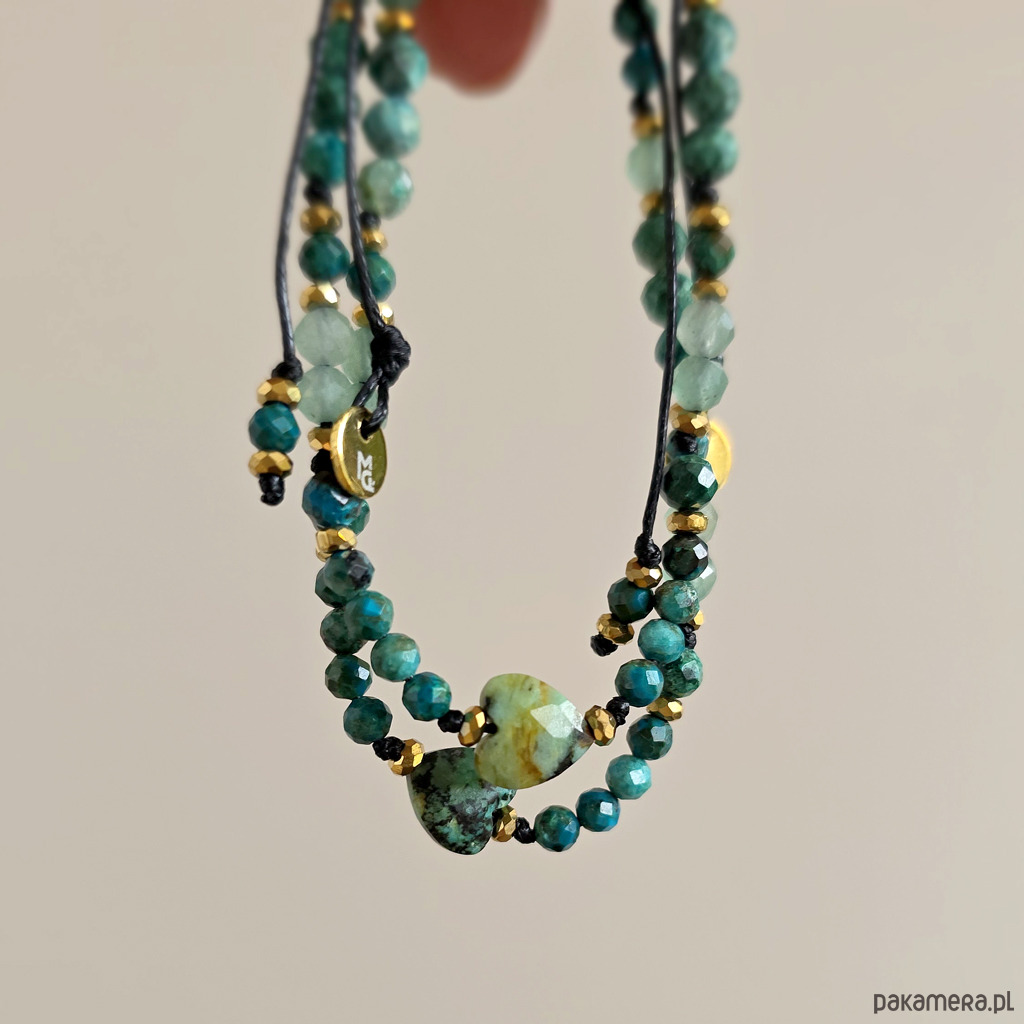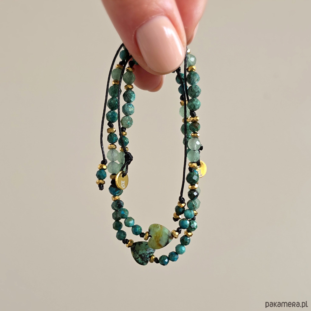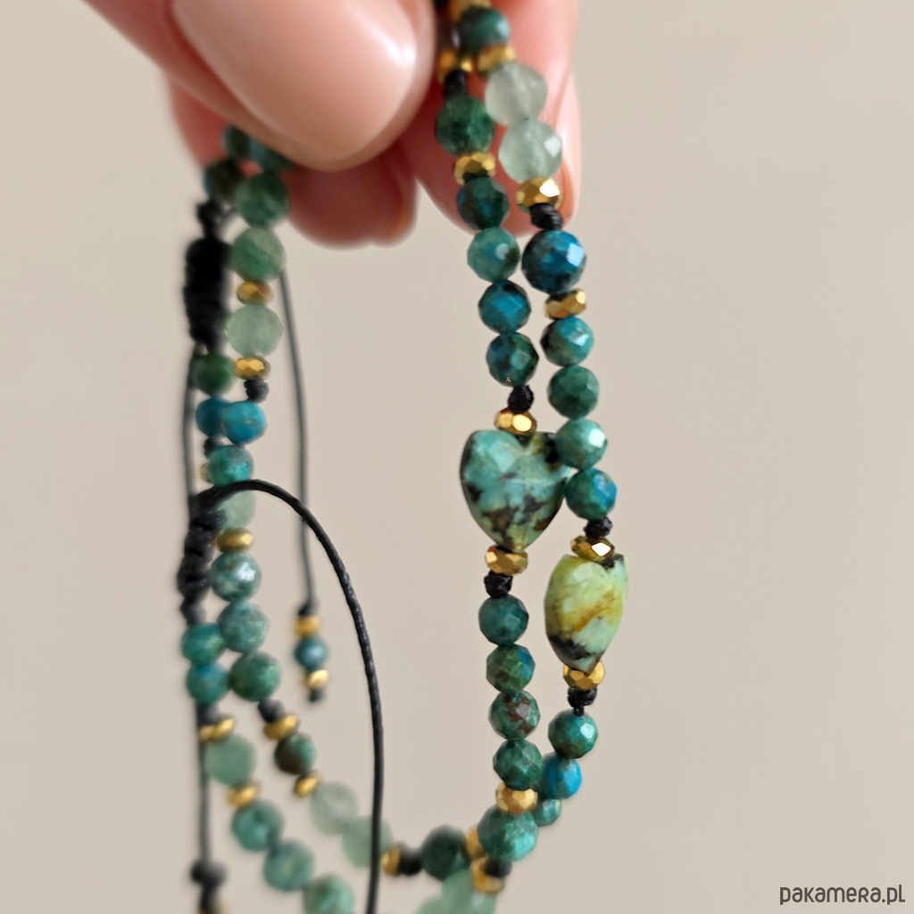 Bransoletka Fullness of gentle flow wykonana jest z kamieni naturalnych - turkusu afrykańskiego, chryzokoli, awenturynu zielonego i hematytu oraz nylonowego sznureczka. Bransoletka będzie odpowiednia na nadgarstek o obwodzie 15-16,5 cm.