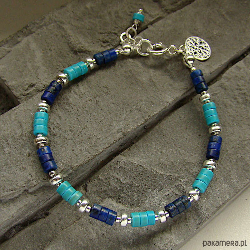 Delikatna, kobieca i wyjątkowa bransoletka na co dzień. Wykonana w całości ze srebra próby 925 oraz krążków naturalnego turkusu i lapisu lazuli wielkości ok. 4 mm. Całkowita długość bransoletki regulowana, od 18,5 cm do 20,5 cm. Ozdobnie zapakowana.