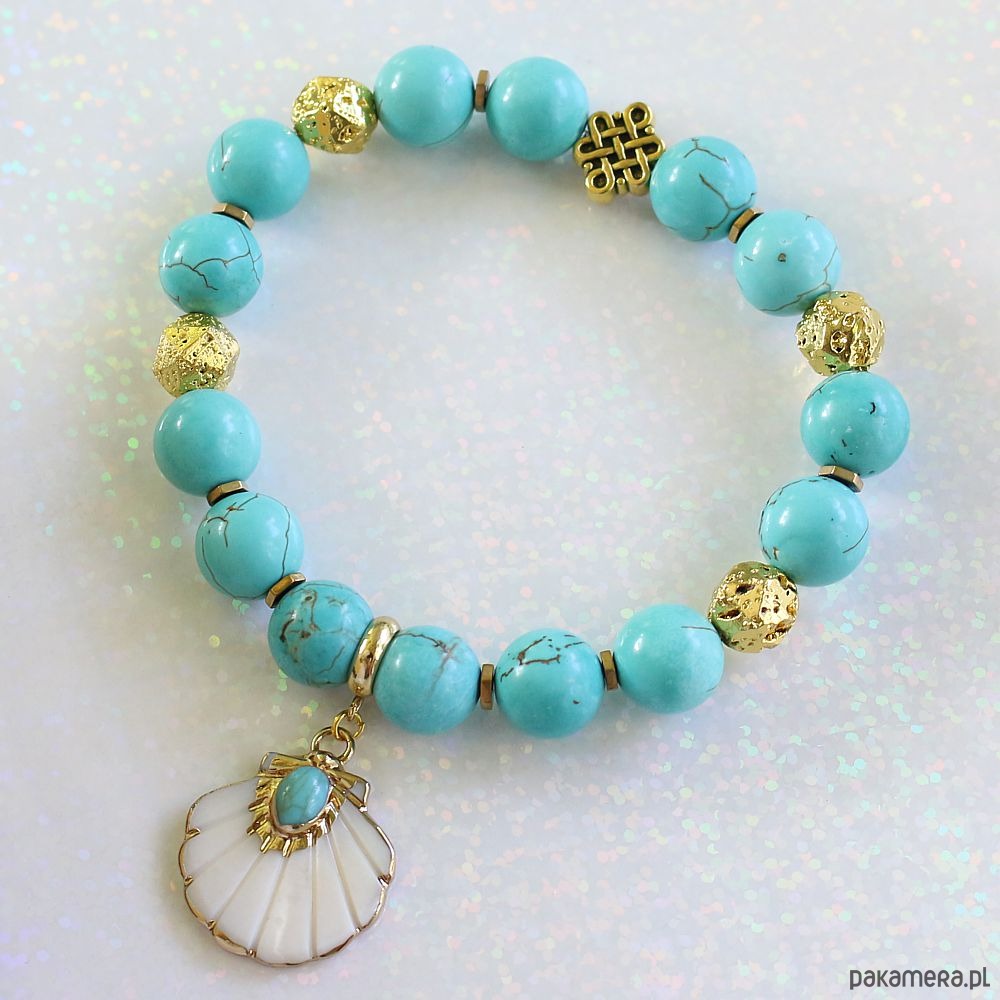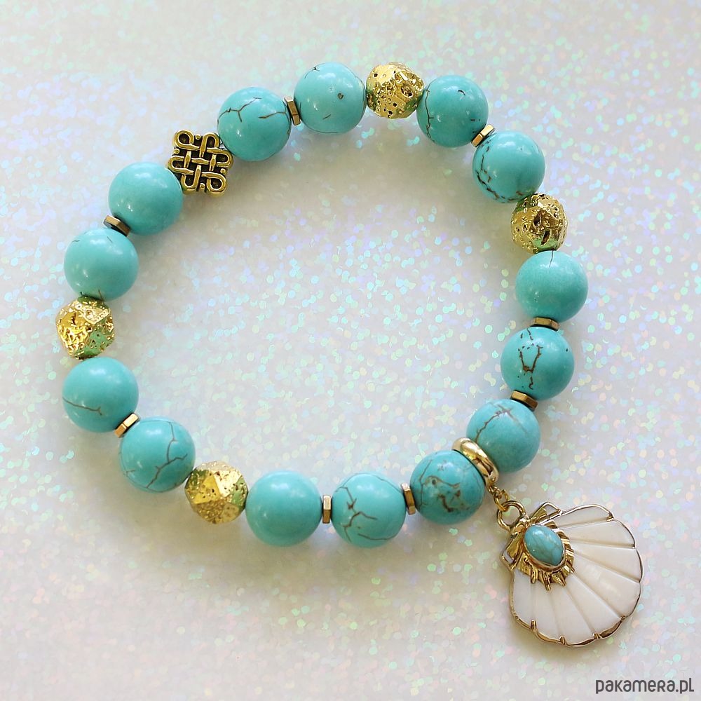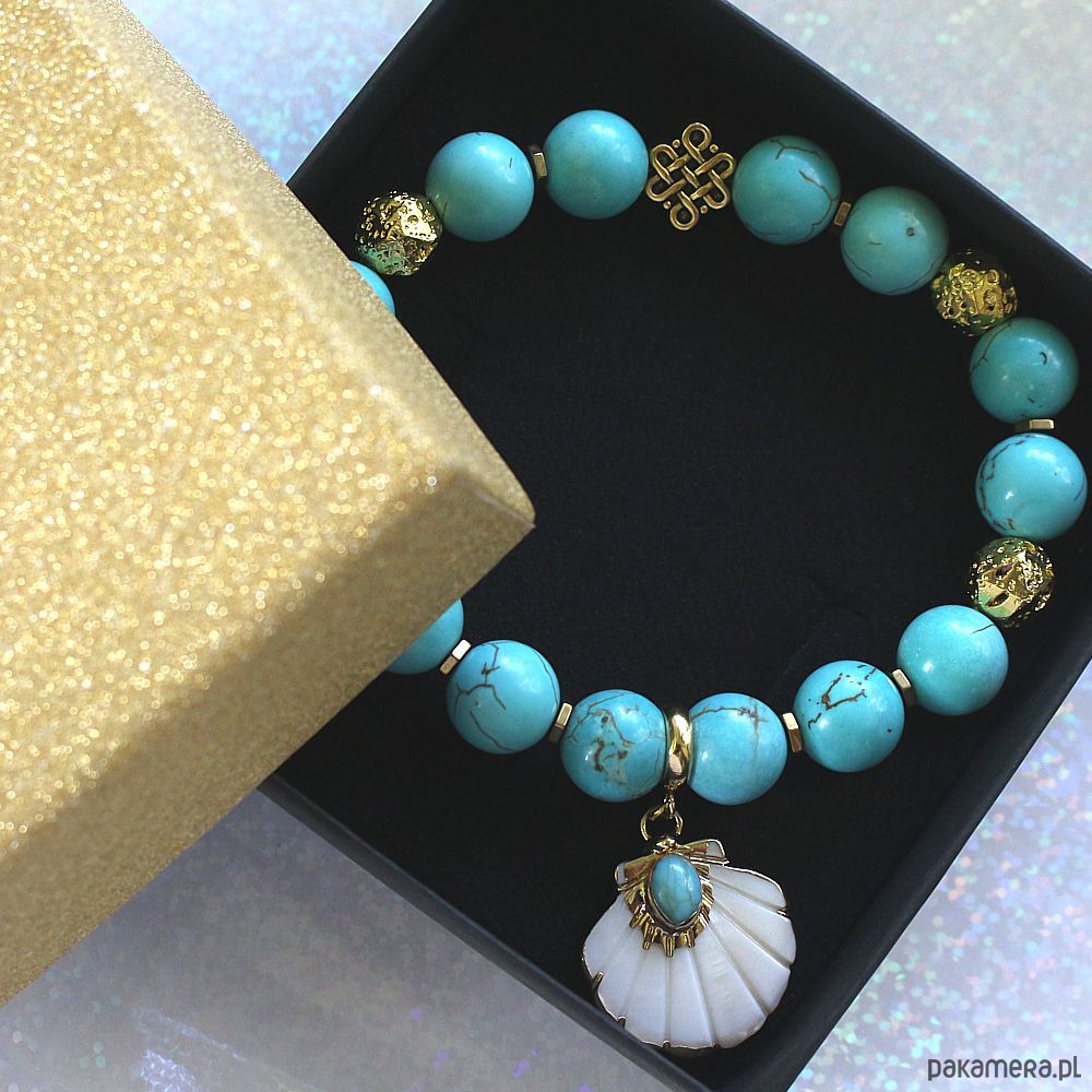 Energetyczna bransoletka z turkusem i pozłacaną lawą wulkaniczną, ozdobiona przepiękną zawieszką w kształcie muszelki z turkusem i macicą perłową oraz koralikiem z symbolem szczęścia i pomyślności.