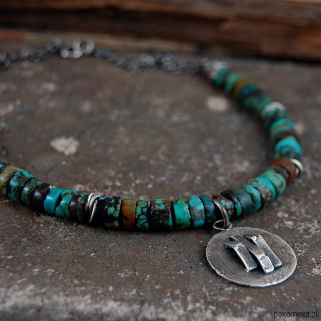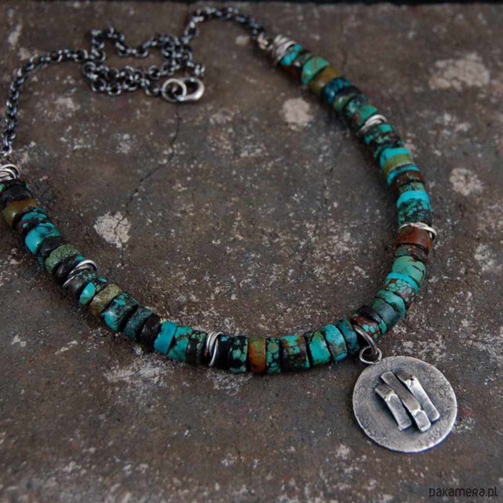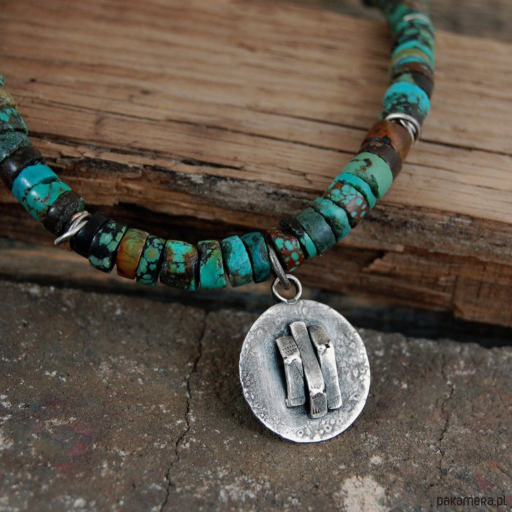 Naszyjnik ze srebra i turkusów. Srebro oksydowane. Średnica kamieni 0,7 cm, średnica zawieszki 2,1 cm, długość naszyjnika 45 cm.