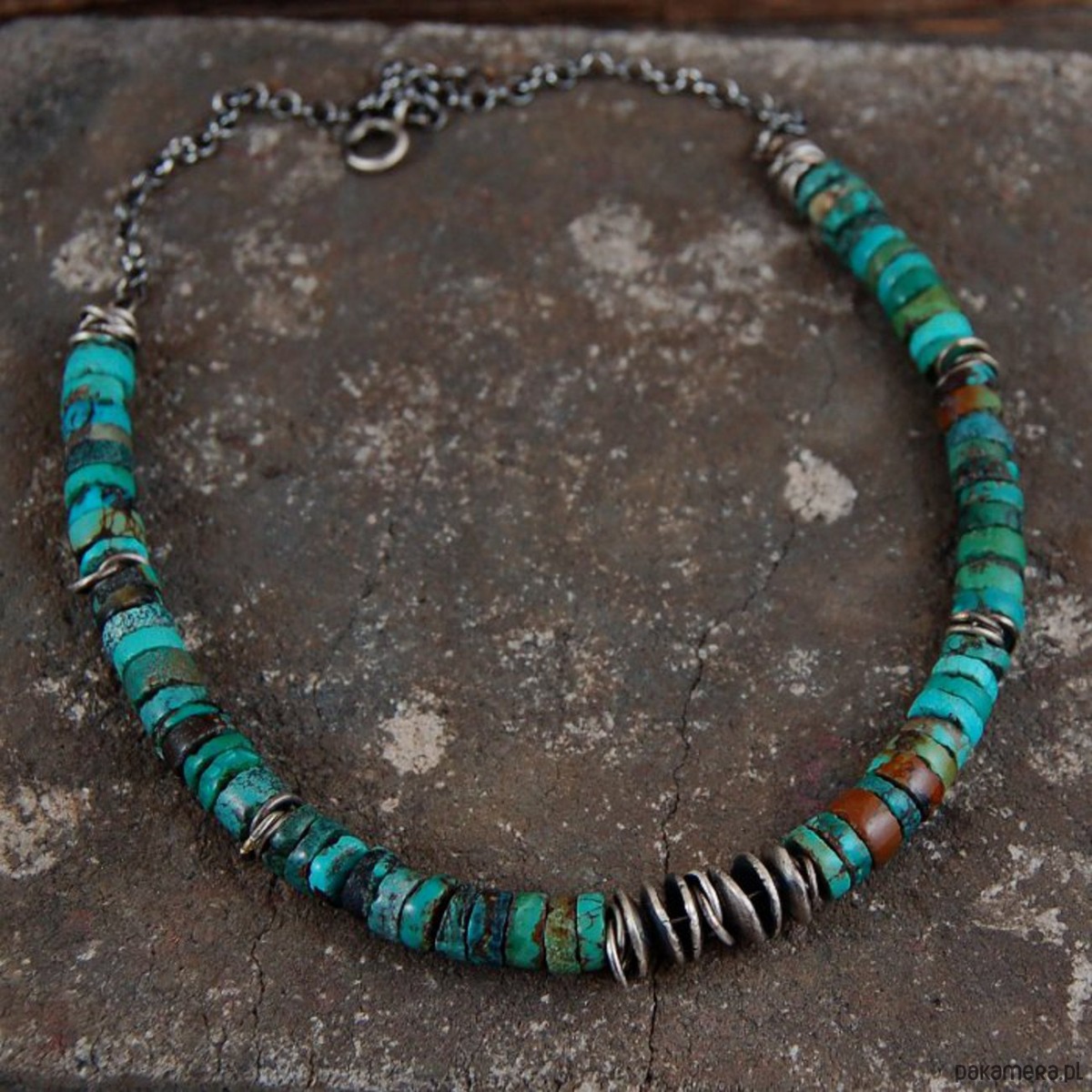 Naszyjnik ze srebra i turkusów. Srebro oksydowane. Średnica kamieni 0,7 cm, długość naszyjnika 45 cm.