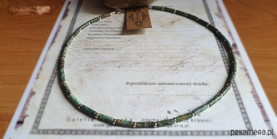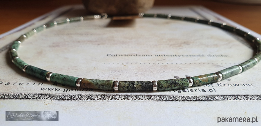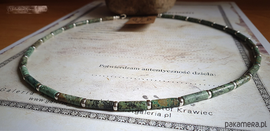 Biżuteria autorska, naszyjnik męski, choć równie dobrze może być biżuterią uniseks. Wykonany z wałeczków Turkusu afrykańskiego 13 mm x 4 mm, poprzeplatanego oponkami ze srebra 925 wielkości 4 mm. Wykończenie ze srebra 925 wolnego od niklu, na nośniku z mocnej linki jubilerskiej japońskiej. Długość około 47 cm.