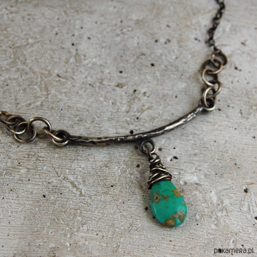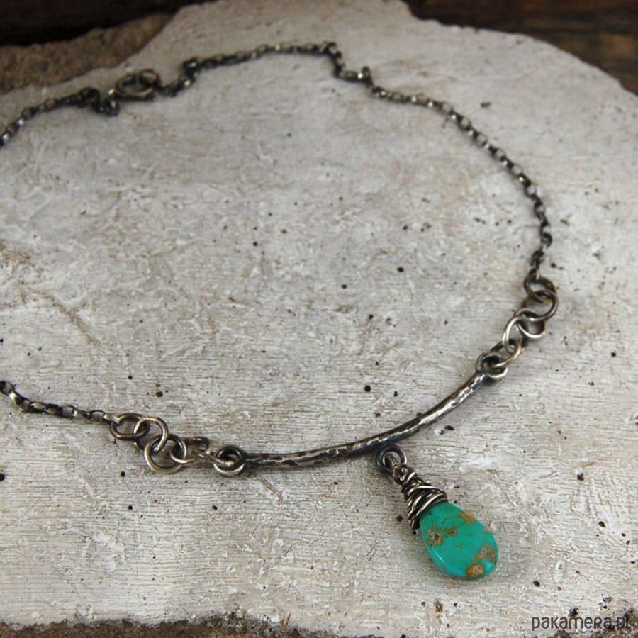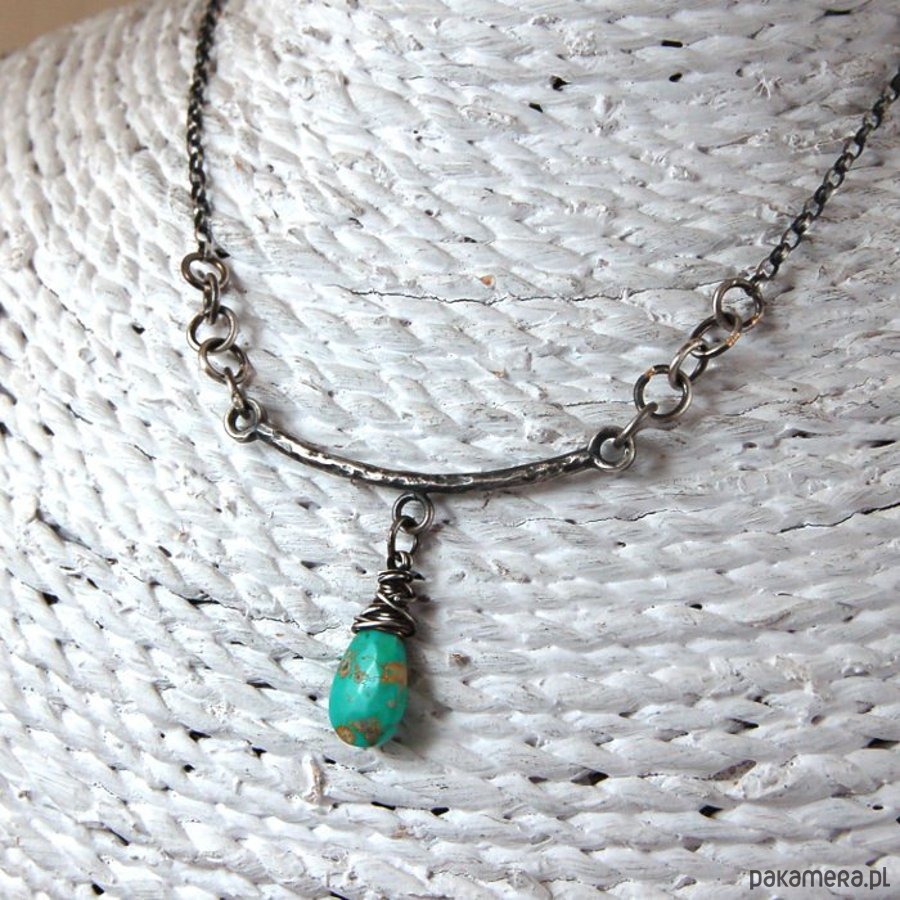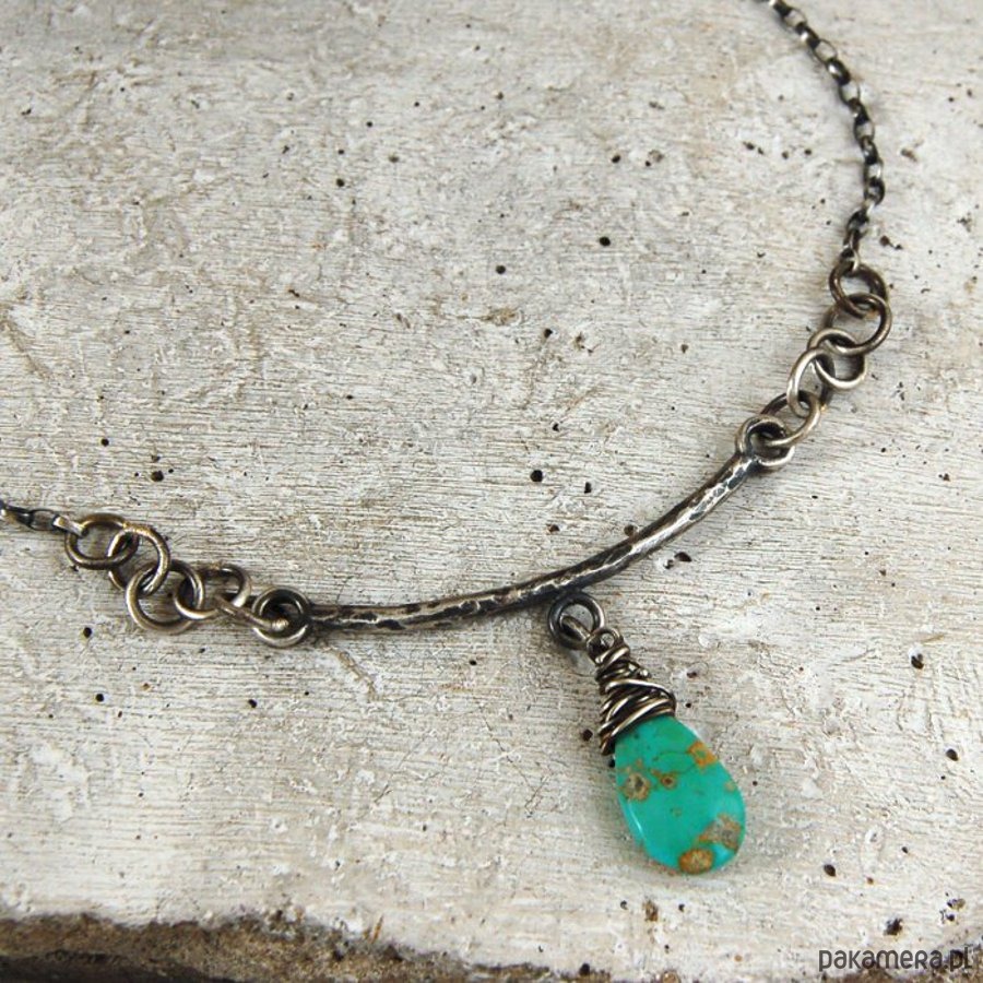 Naszyjnik ze srebra i turkusu. Srebro oksydowane. Wielkość kamienia 1 x 1,4 cm, długość naszyjnika 44 cm.