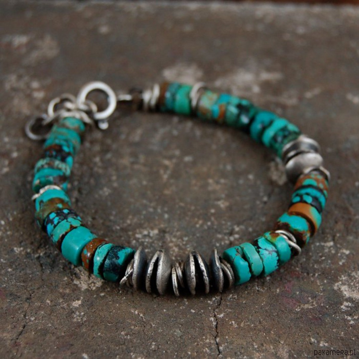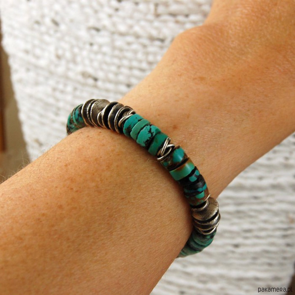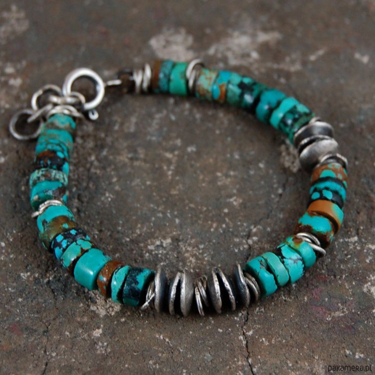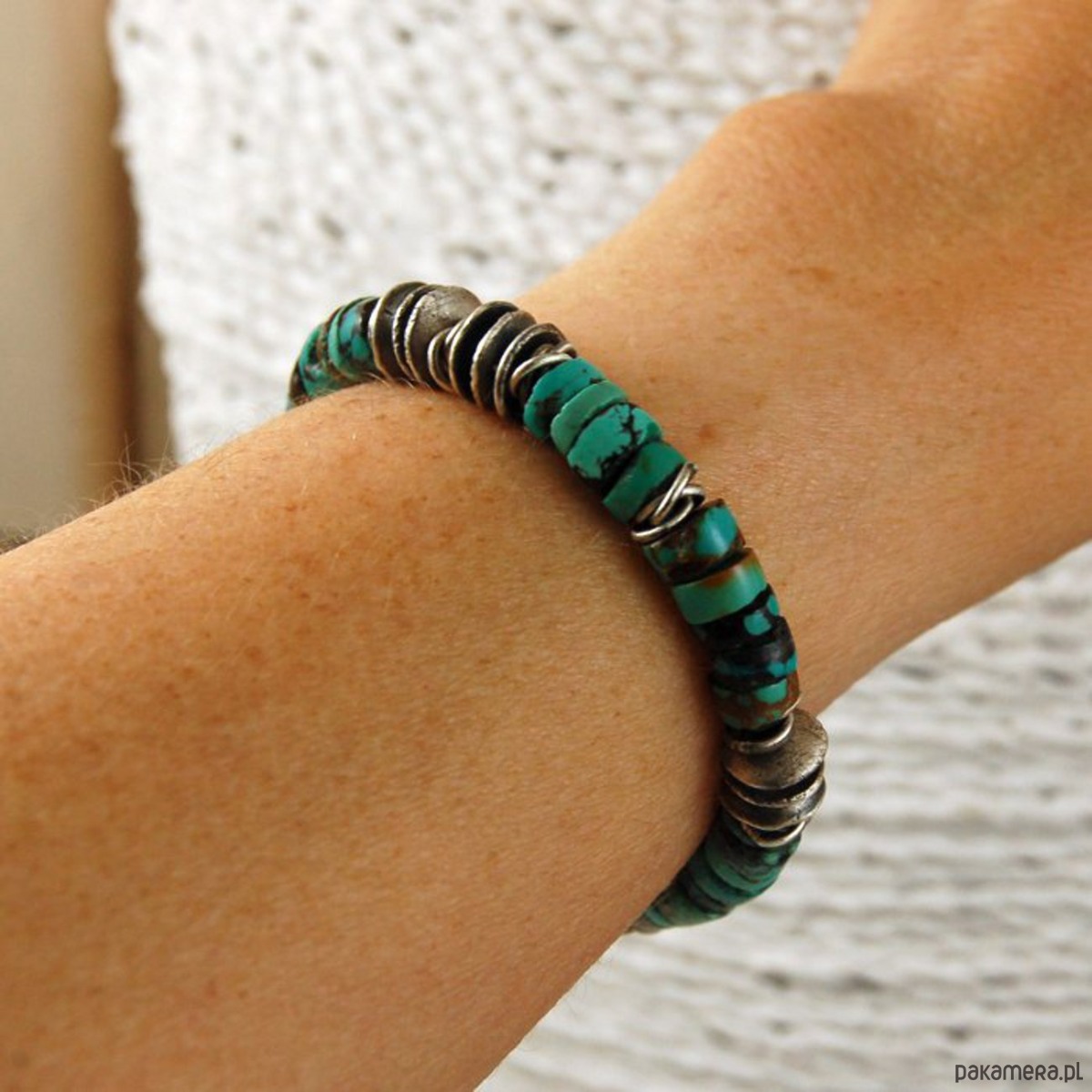 Bransoleta unisex ze srebra i turkusów. Srebro oksydowane. Średnica turkusów 0,7 cm. Proszę o podanie obwodu nadgarstka.