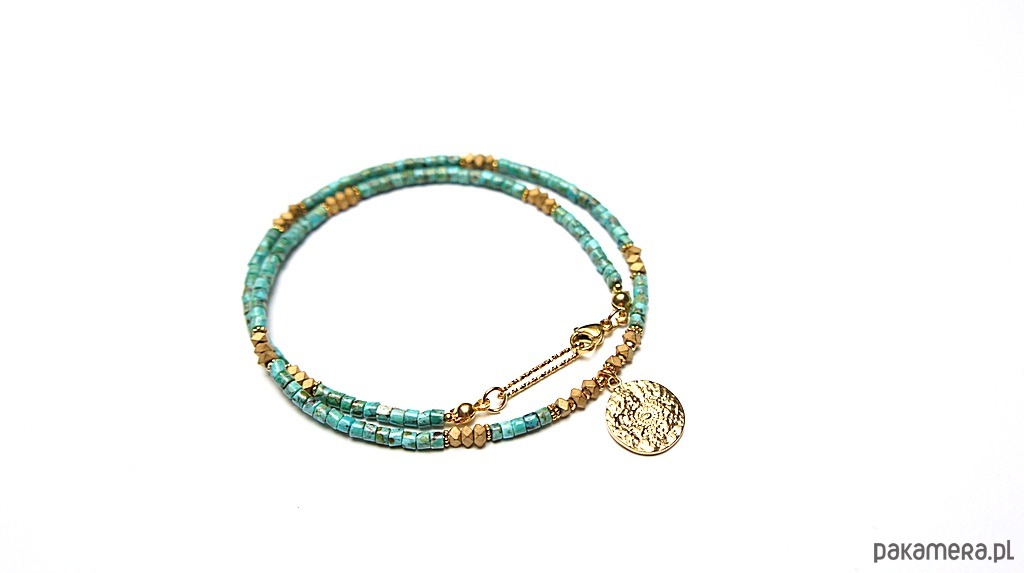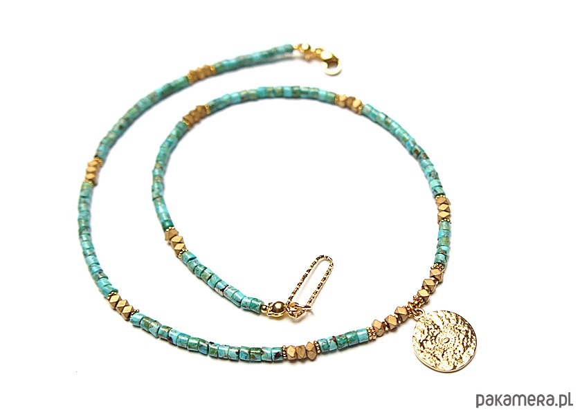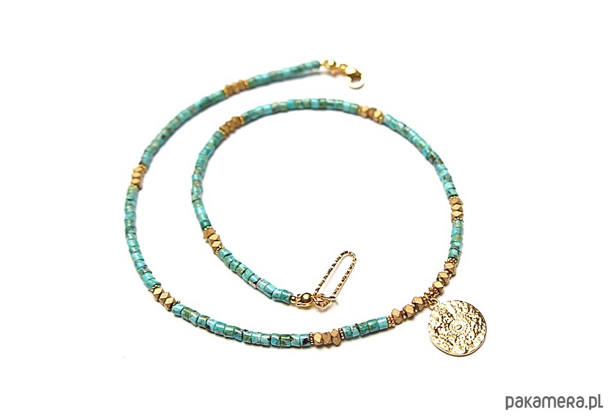 Krótki naszyjnik wykonany w całości z pozłacanej stali szlachetnej oraz kamieni - talarki naturalnych turkusów [4 x 2mm], talarki matowego hematytu [3 x 2mm]. Naszyjnik o długości ok. 43,5cm.