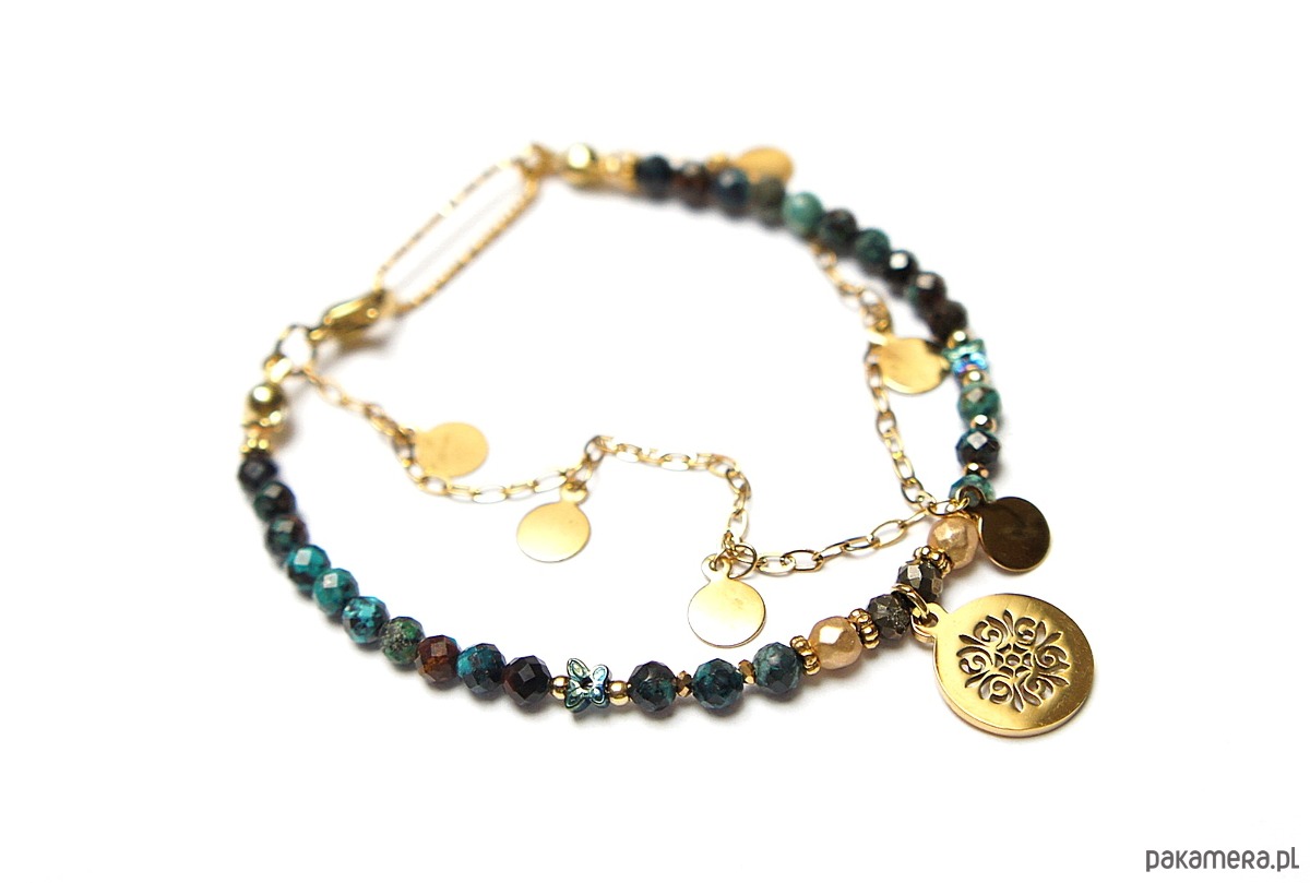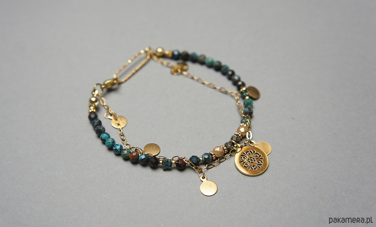 Delikatna bransoletka wykonana w całości ze stali szlachetnej pozłacanej, szlachetnych kamieni - naturalnych turkusów [3mm], fasetowanych pirytów o surowym wyglądzie [3,5mm], hematytów platerowanych, fasetowanych [2mm i 4mm], przekładek z hematytu [4mm - motyle i 1mm]. Całkowita długość bransoletk1 ok. 18cm.