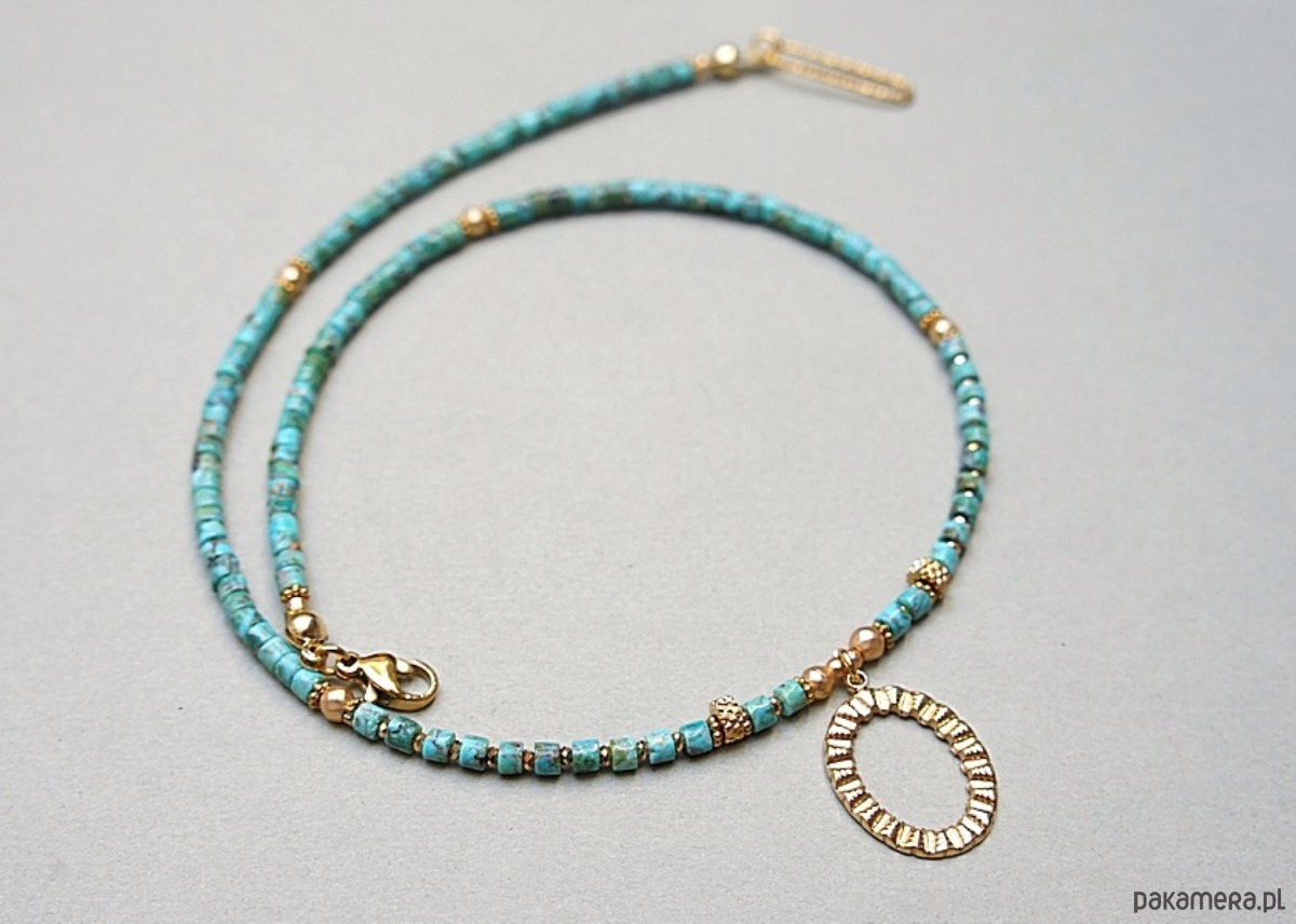 Krótki naszyjnik wykonany w całości z pozłacanej stali szlachetnej oraz kamieni - talarki naturalnych turkusów [4 x 2mm], fasetowanego, platerowanego hematytu [2mm i 3mm] oraz przekładek z hematytu [1mm]. Naszyjnik o długości ok. 41,5cm. Biżuteria ozdobnie zapakowana.