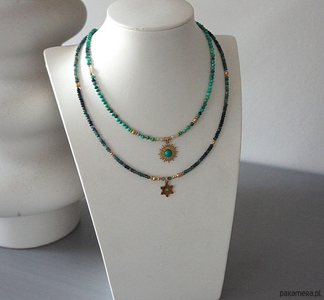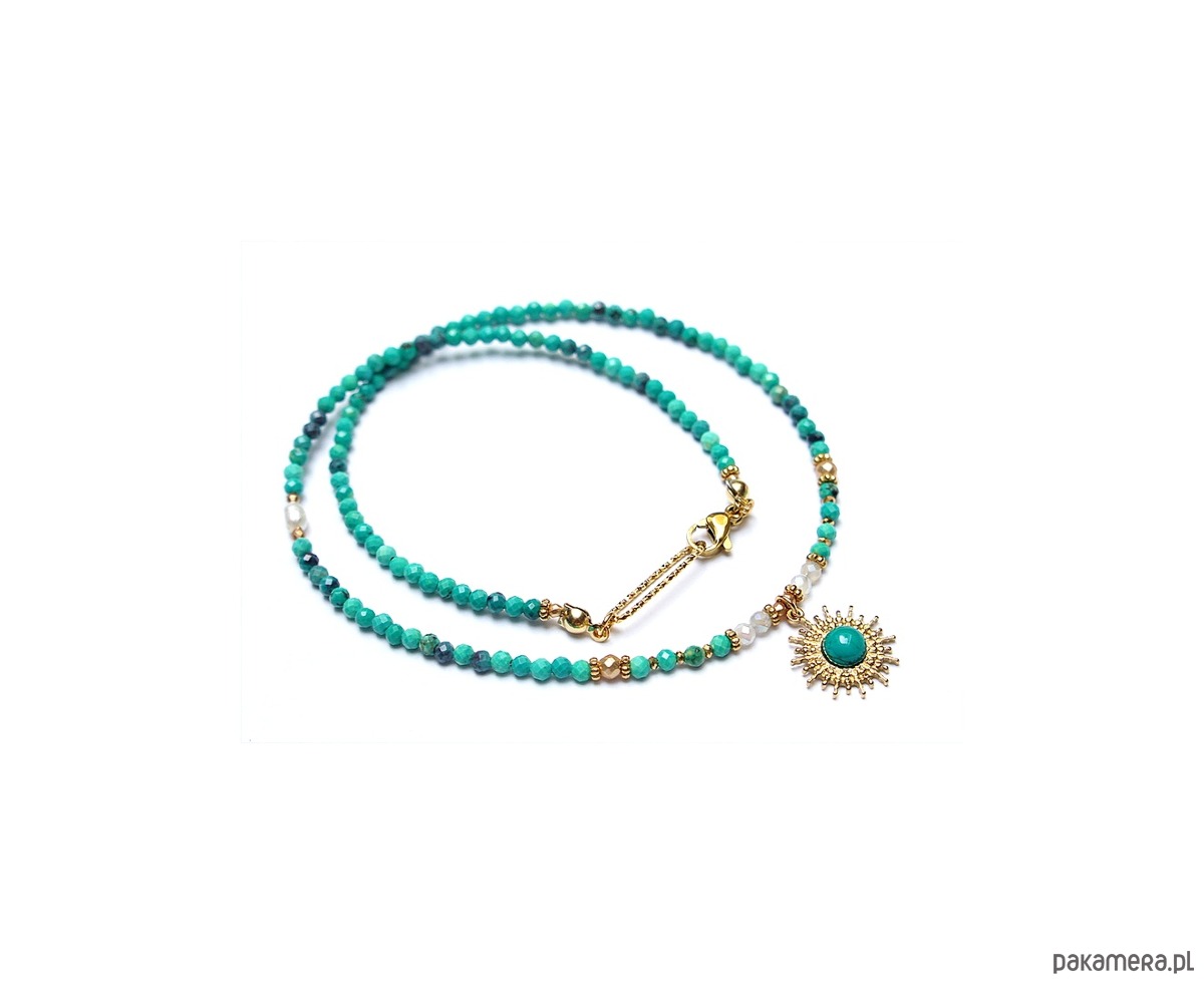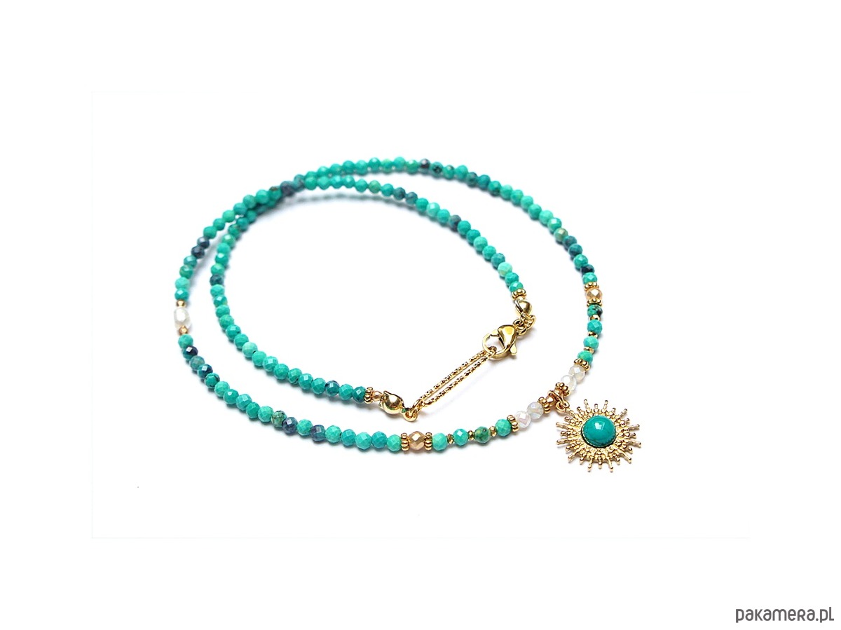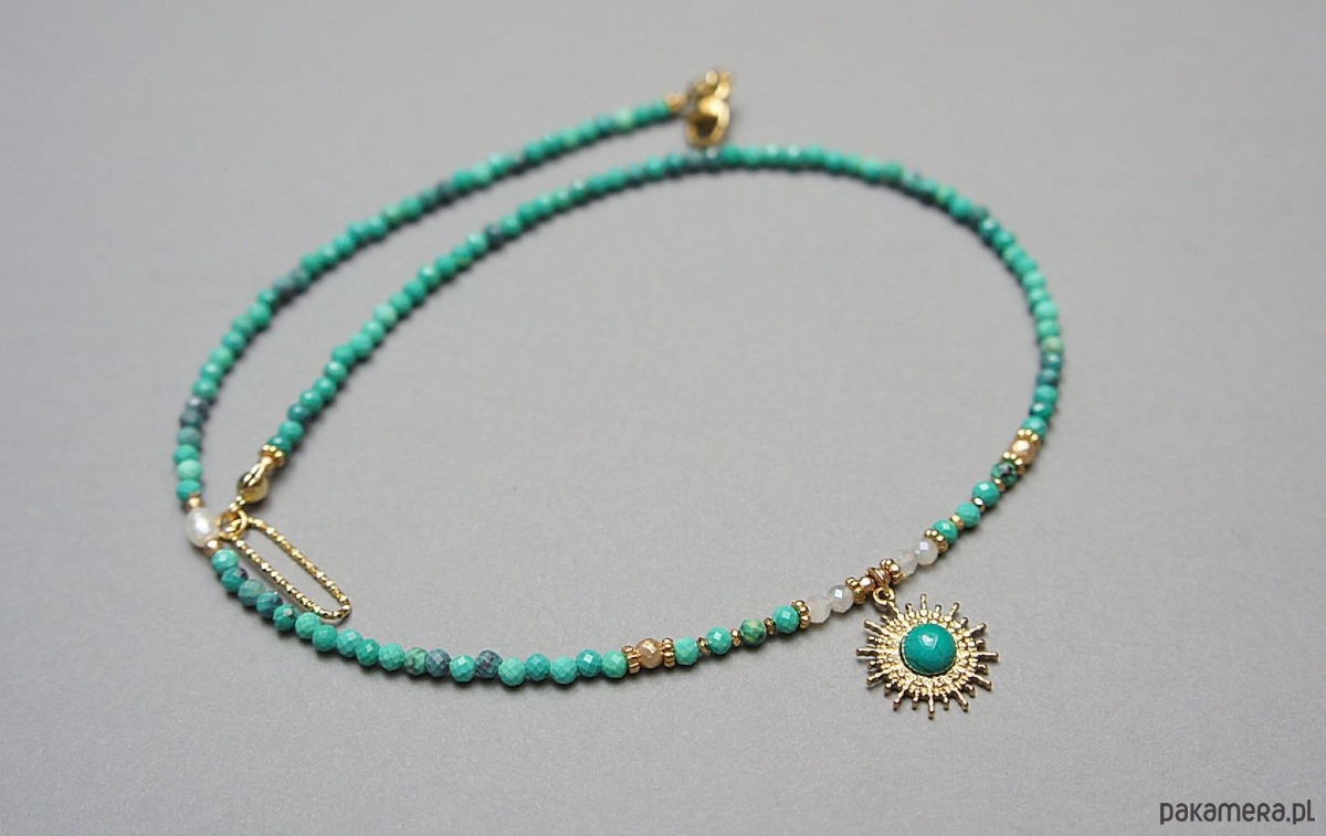 Krótki naszyjnik wykonany w całości z pozłacanej stali szlachetnej oraz kamieni - turkus fasetowany w kolorze zielonym [2,5mm], fasetowanego, platerowanego hematytu [2mm i 4mm], kamień księżycowy z poświatą mystic [3mm], perłą słodkowodną [ok. 5mm], przekładek z hematytu [1mm] oraz zawieszki z naturalnym kamieniem. Naszyjnik o długości ok. 43cm. Biżuteria ozdobnie zapakowana.