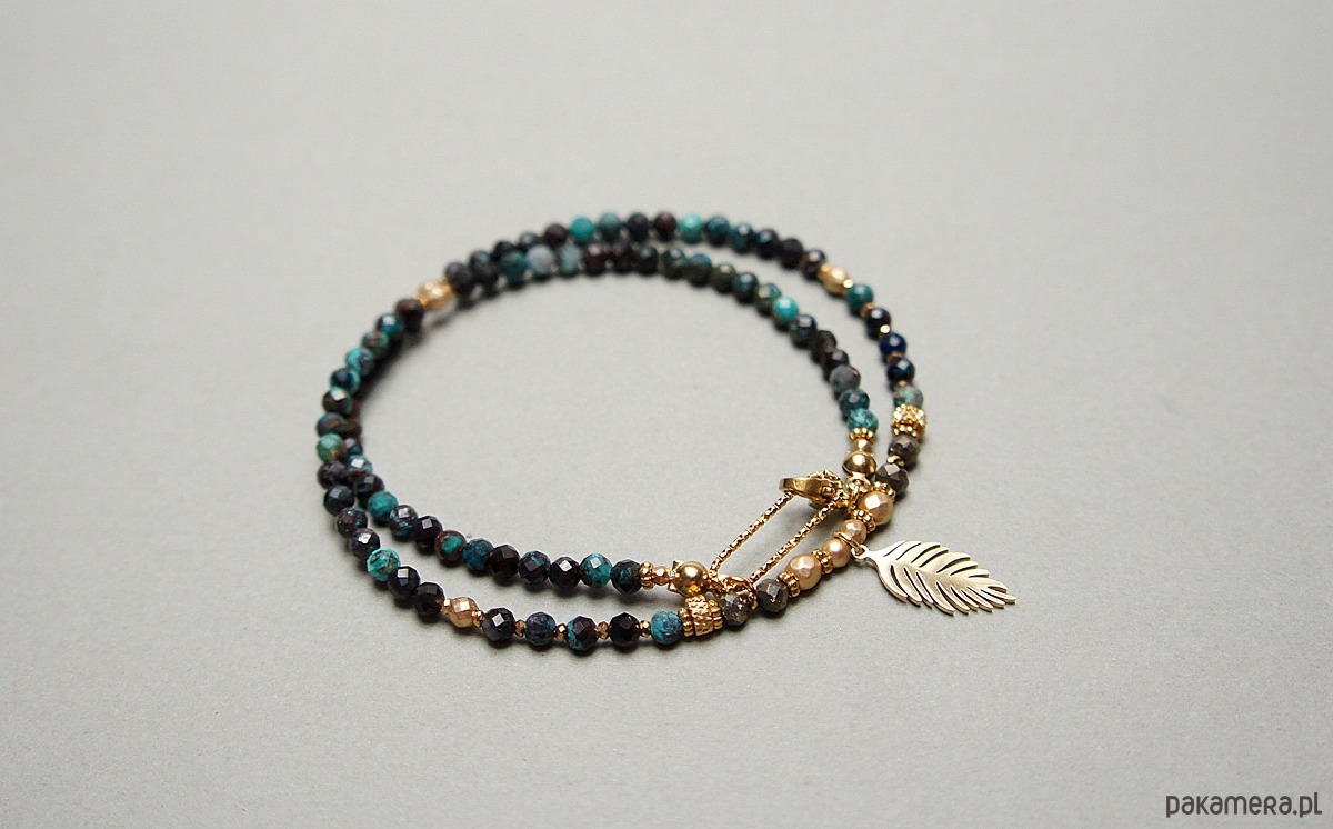 Krótki, delikatny naszyjnik wykonany w całości z pozłacanej stali szlachetnej oraz szlachetnych kamieni - fasetowanych, naturalnych turkusów [4mm], pirytu fasetowanego o surowym wyglądzie [3,5mm], hematytu fasetowanego, platerowanego [3mm oraz 4mm], przekładek z hematytu [1mm]. Naszyjnik o długości ok. 41cm. Biżuteria ozdobnie zapakowana.