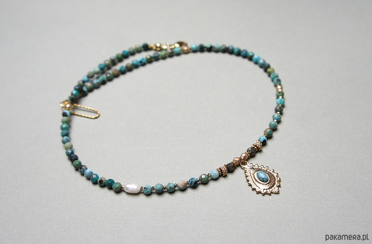Krótki, delikatny naszyjnik wykonany w całości z pozłacanej stali szlachetnej oraz naturalnych kamieni - fasetowanych, turkusów [3,5mm], pirytów fasetowanych o surowym wyglądzie [3mm], hematytu fasetowanego, platerowanego [3mm], perły naturalnej słodkowodnej [7mm], przekładek z hematytu [1mm] oraz zawieszki z naturalnym kamieniem. Naszyjnik o długości ok. 40,5cm. Biżuteria ozdobnie zapakowana.