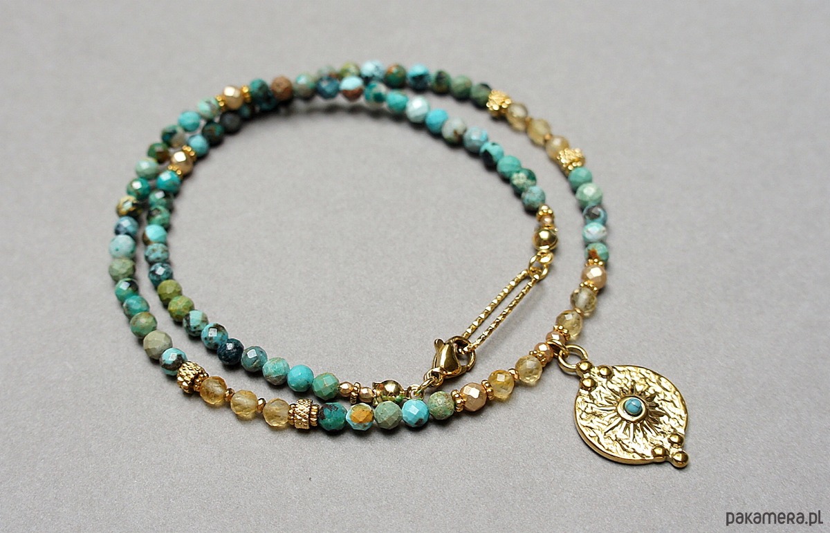 Krótki, delikatny naszyjnik wykonany w całości z pozłacanej stali szlachetnej oraz szlachetnych kamieni - kuleczki naturalnych turkusów fasetowanych [3,5mm], cytrynów fasetowanych [3mm], przekładek z hematytu [1mm], fasetowanych, platerowanych hematytów [4mm i 3mm] oraz zawieszki z naturalnym kamieniem. Naszyjnik o długości ok. 42,5cm.