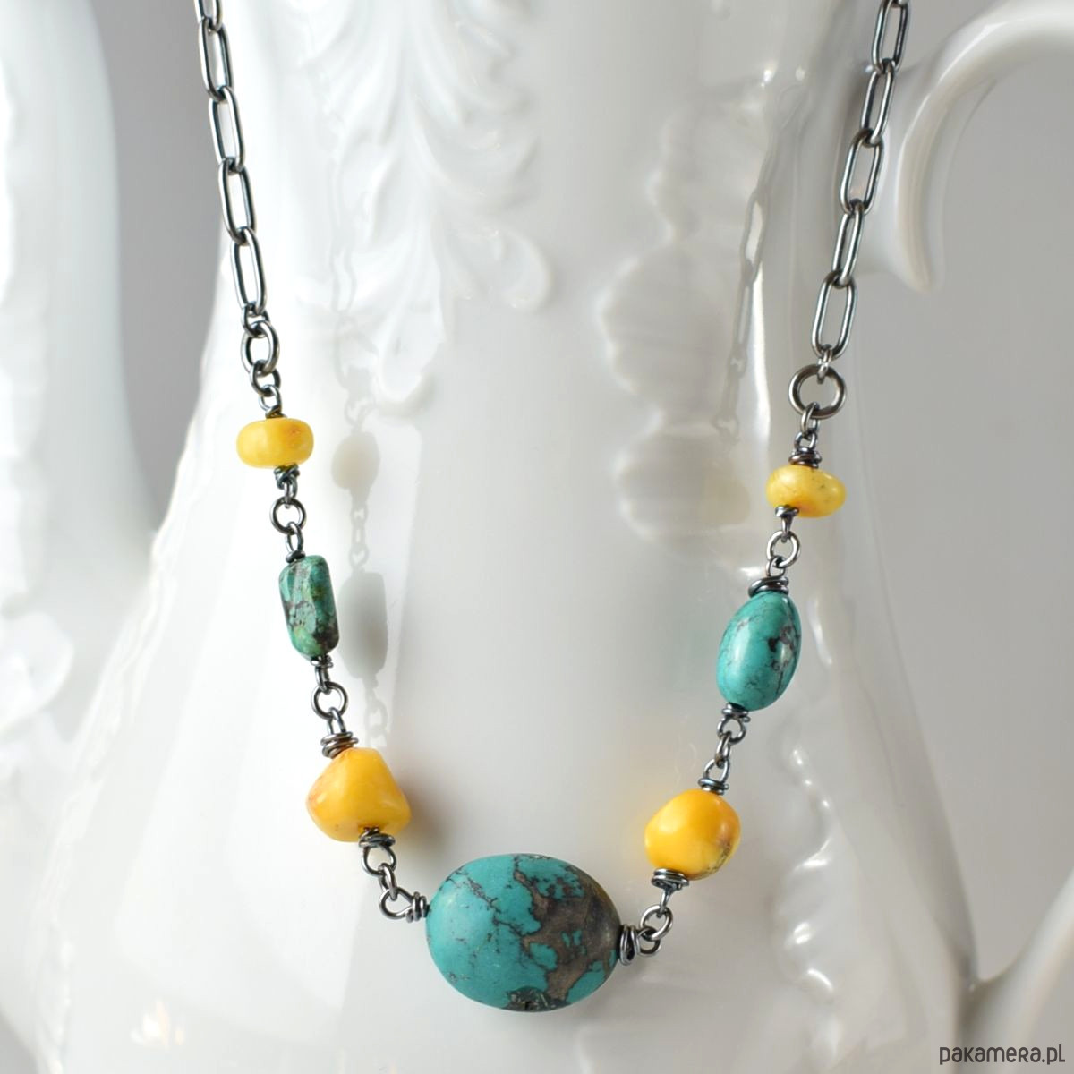Naszyjnik wykonany w całości ze srebra (próba 925) z turkusem i bursztynem. Biżuteria została zoksydowana (przyciemniona) i wypolerowana. Długość regulowana do maksymalnie 54 cm, wymiary największego kamienia 22x17 mm. Biżuteria zostanie ozdobnie zapakowana.