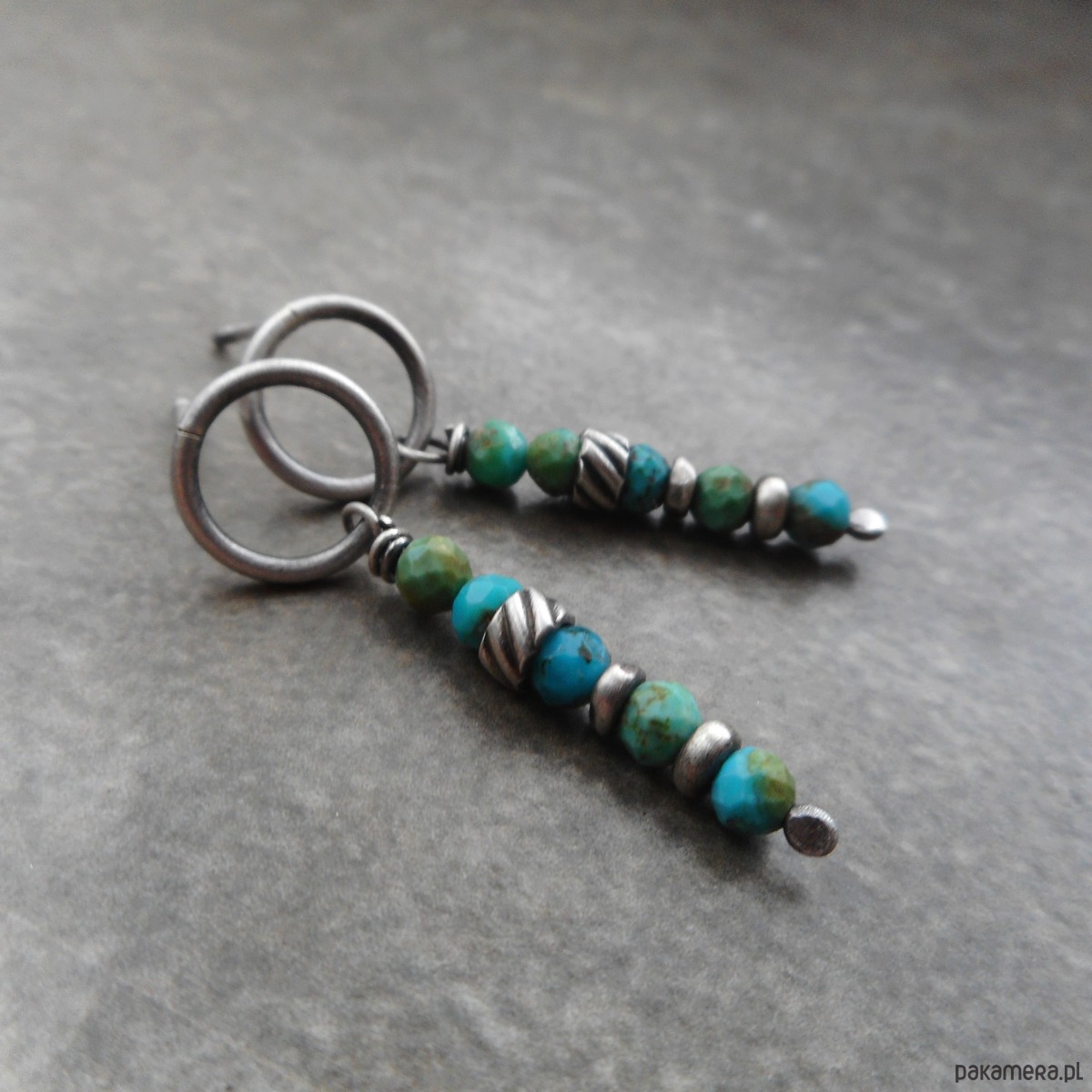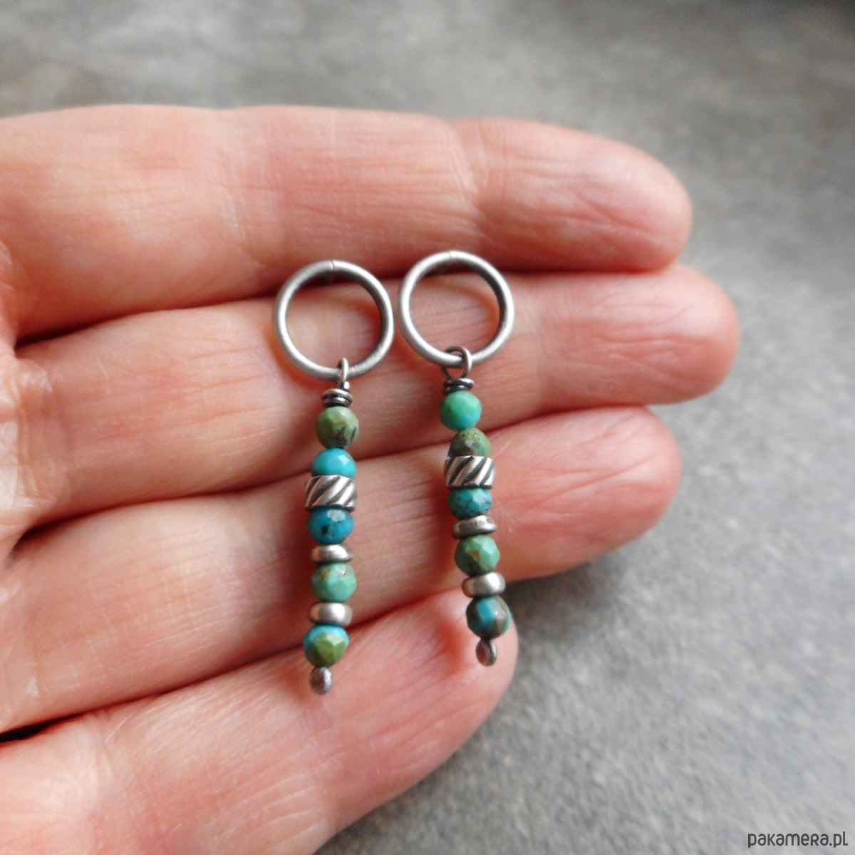 Wyjątkowe kolczyki z kamieni naturalnych i szlachetnego srebra; smukłe patyczki z turkusem zawieszone na sztyftach w postaci kółka tworzą lekką, uniwersalną kompozycję.