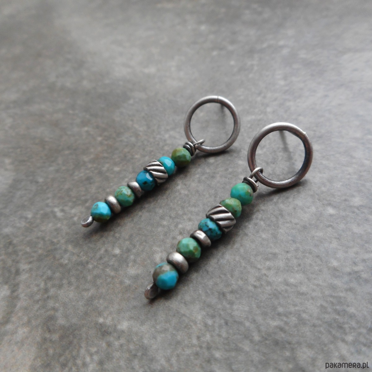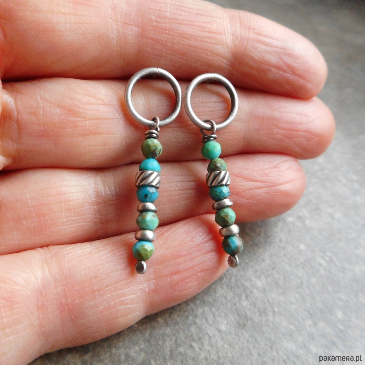 Wyjątkowe kolczyki z kamieni naturalnych i szlachetnego srebra; smukłe patyczki z turkusem zawieszone na sztyftach w postaci kółka tworzą lekką, uniwersalną kompozycję.
