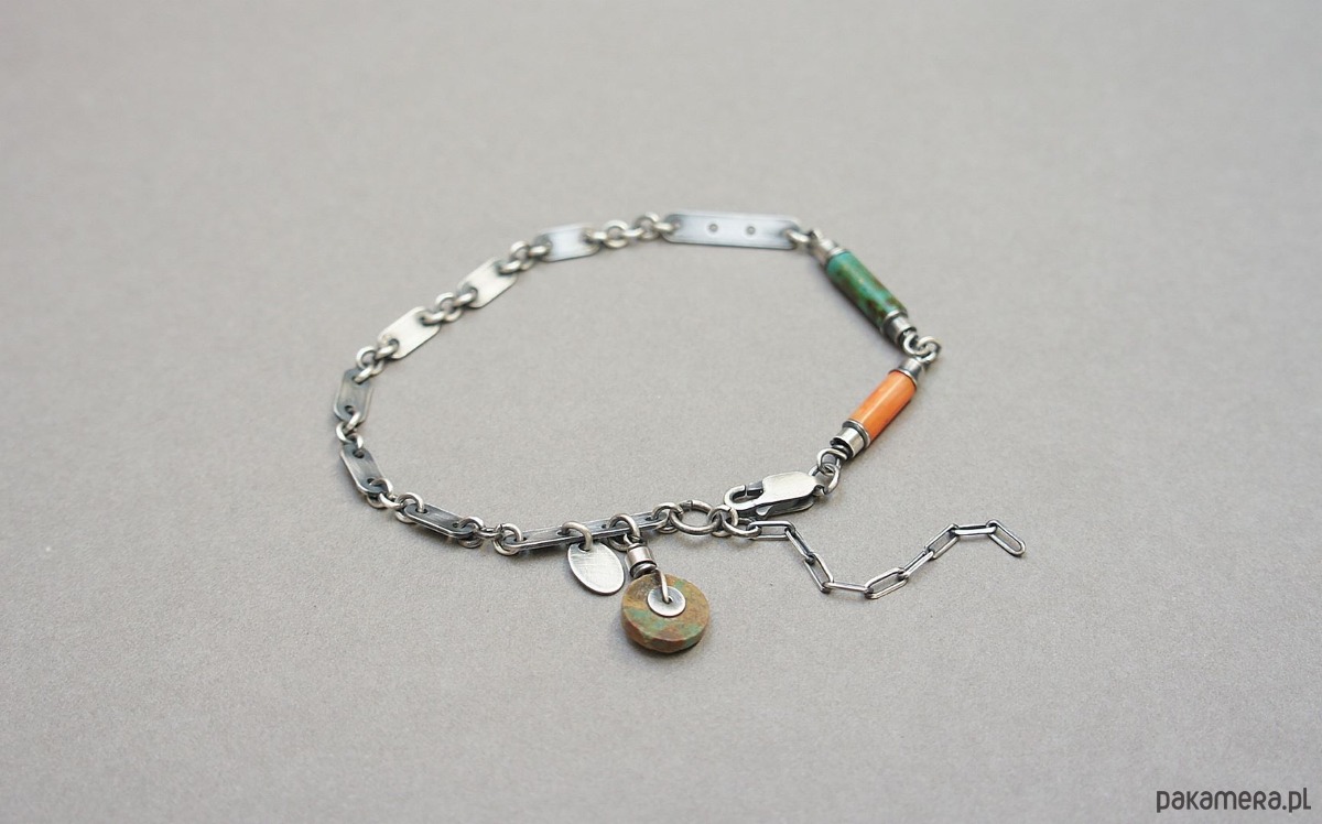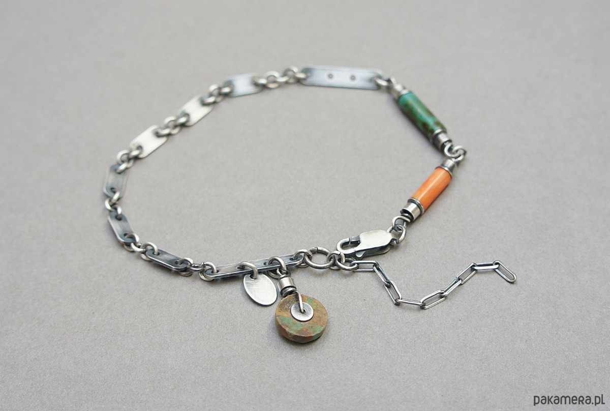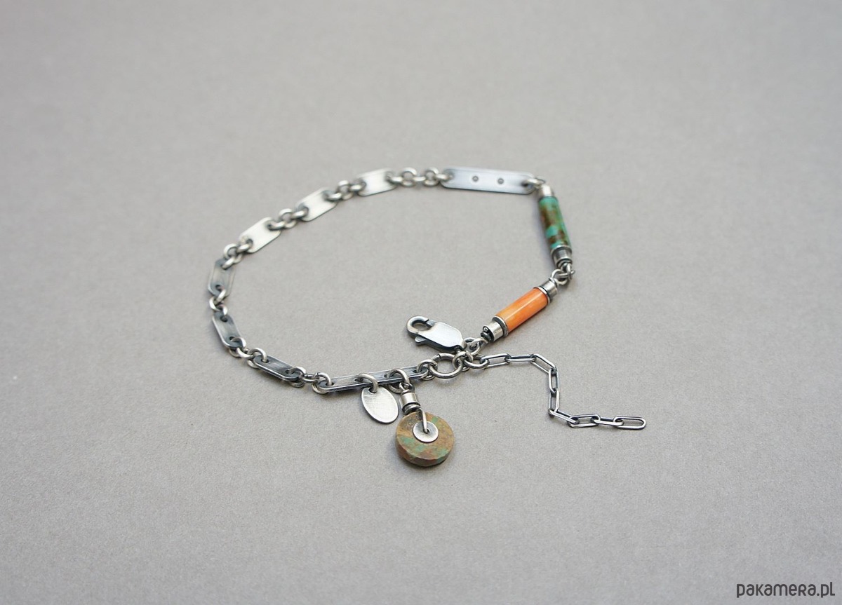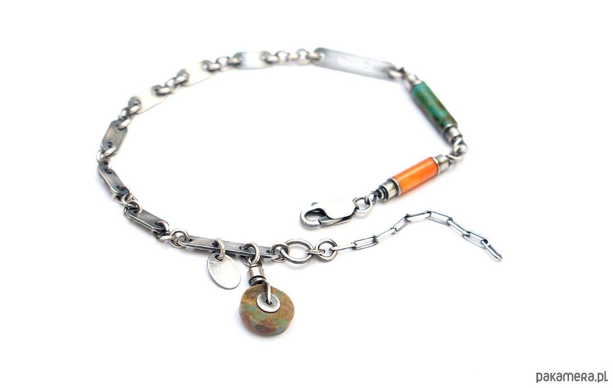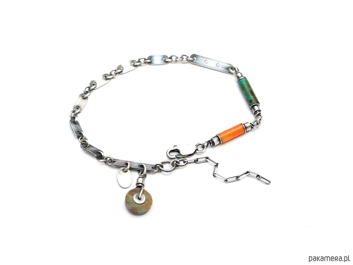 Bransoletka wykonana ze srebra pr. 925 w połączeniu z wałeczkiem pomarańczowego korala [10mm], wałeczkiem turkusu [13mm], krążkiem turkusu [10mm] oraz srebrnymi blaszkami. Srebro oksydowane i przetarte. Całkowita długość bransoletki 20cm plus ozdobna przedłużka.