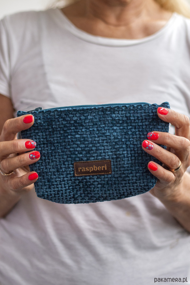 Średniej wielkości kosmetyczka wykonana z turkusowego tłoczonego weluru.