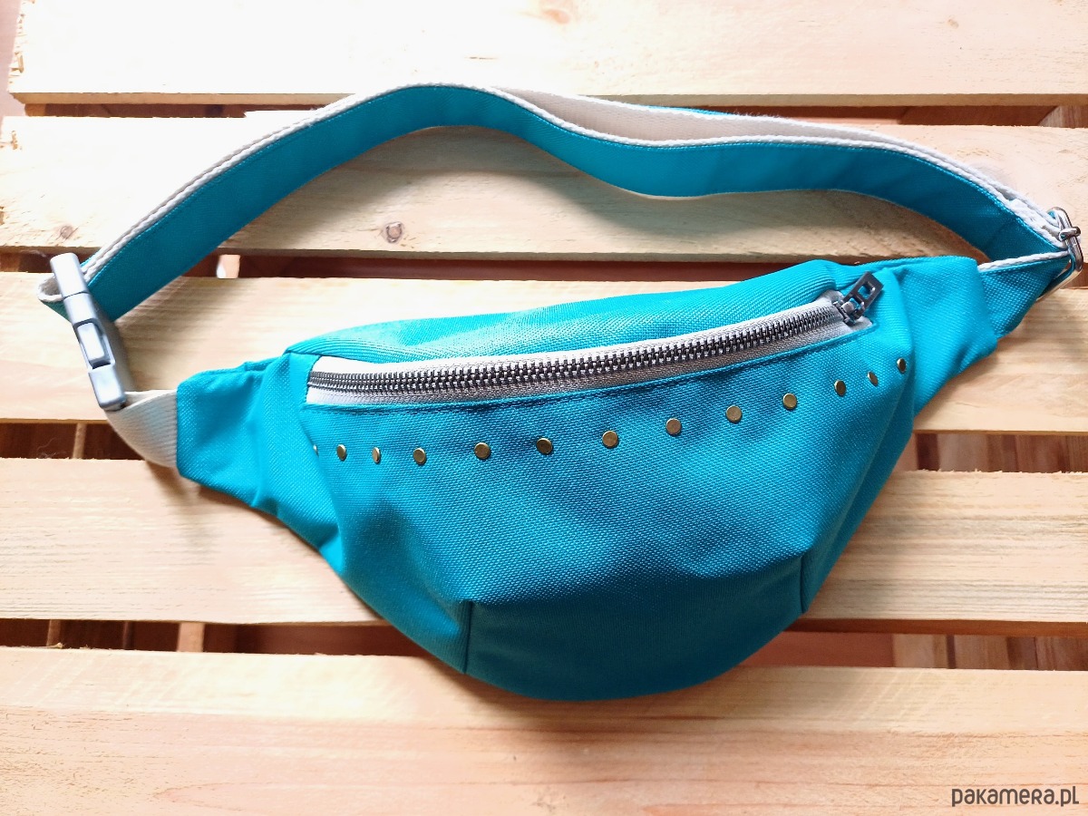 Bez wzoru. Kolor turkusowy. Nerka ozdobiona złotymi nitami.