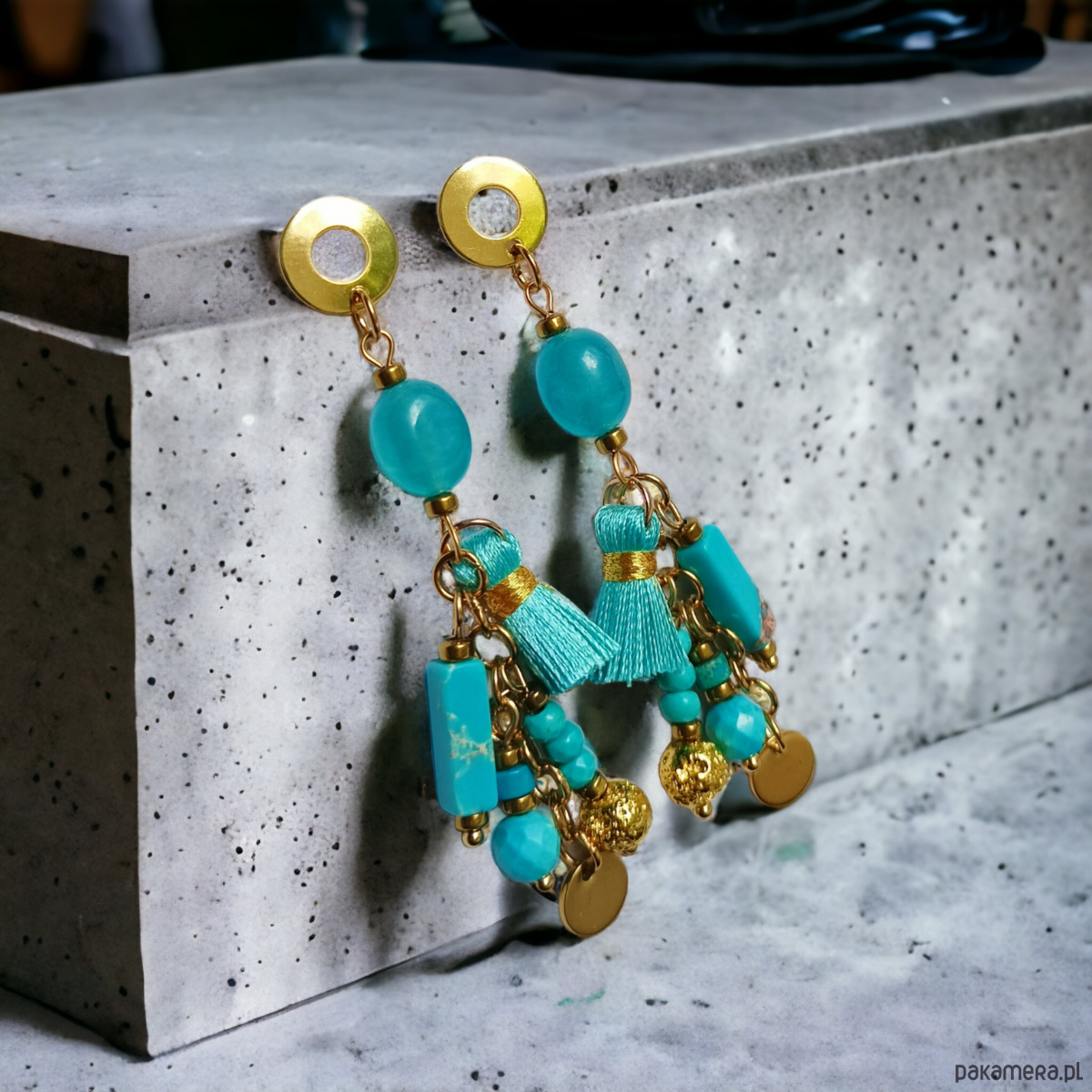Kolczyki na ozdobnych sztyftach, wykonane ze starannie dobranych materiałów, w tym: jadeit, magnezyt, jaspis, chwosty, złoty hematyt, złota ława.