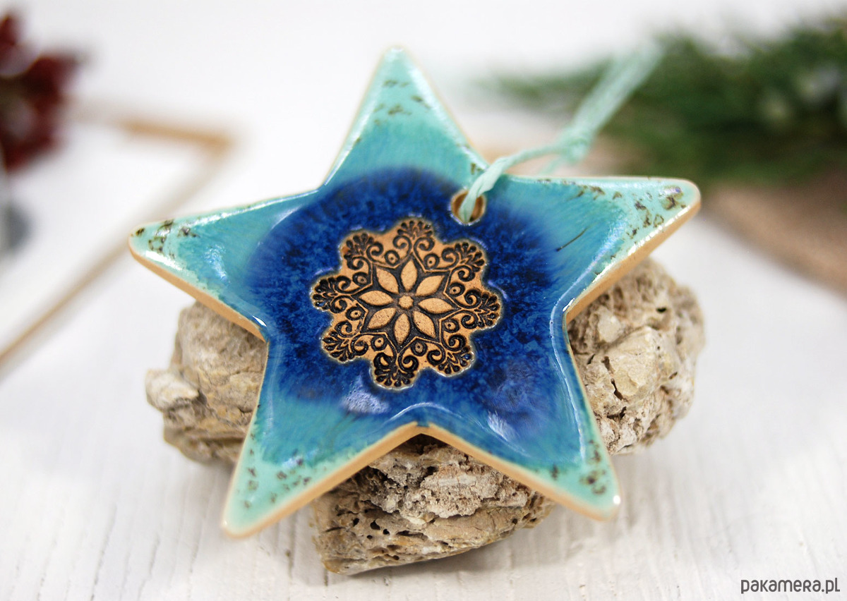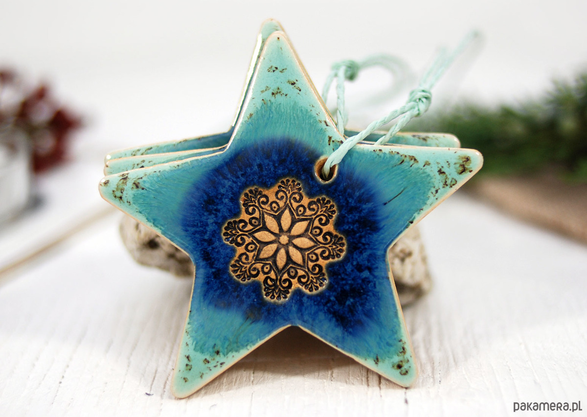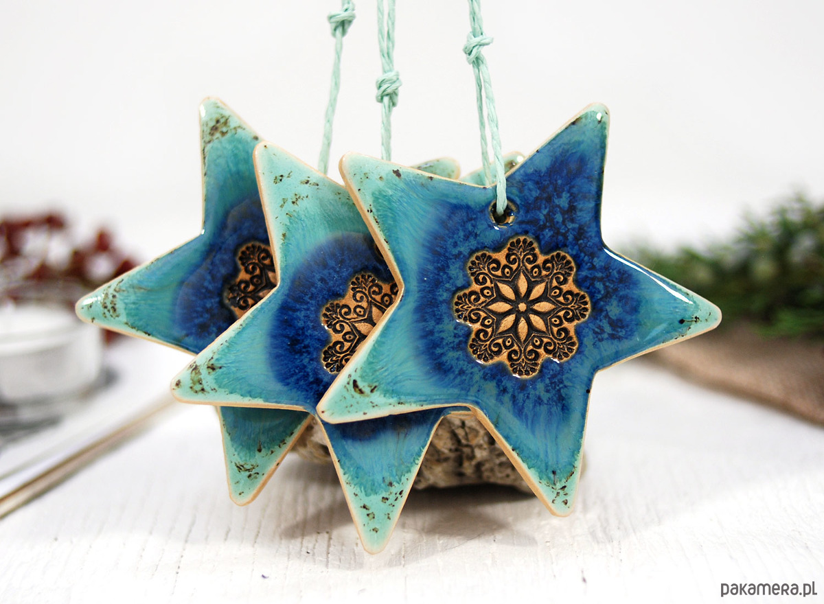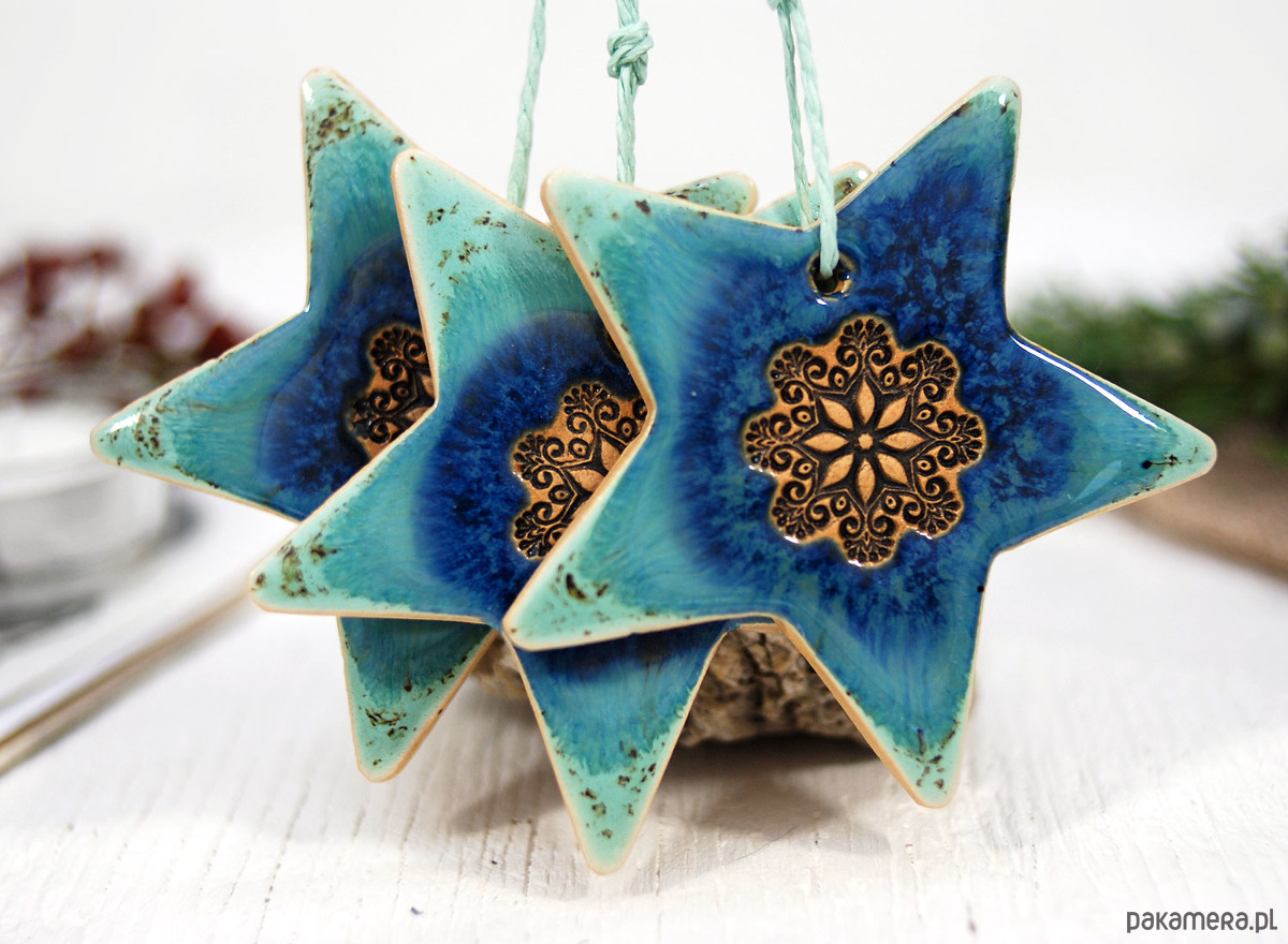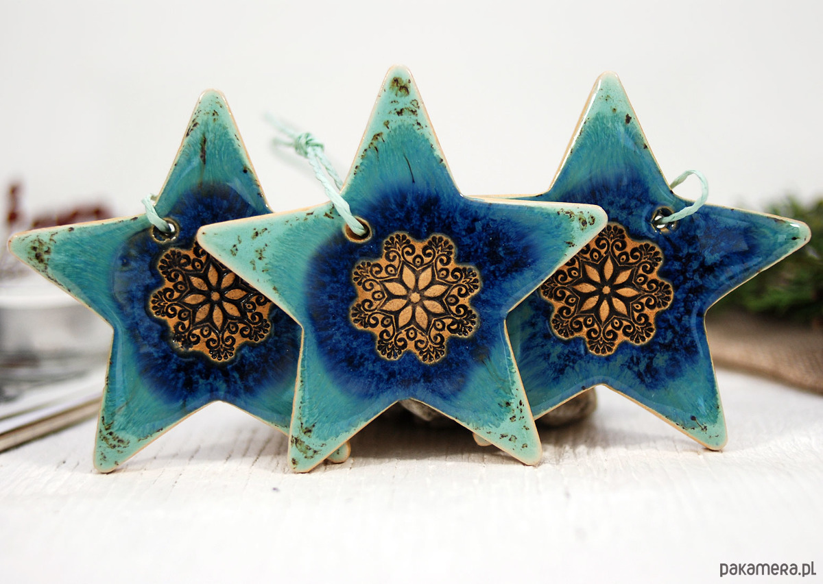 Komplet zawiera trzy ceramiczne gwiazdki choinkowe. Ozdoby są ręcznie robione i szkliwione co gwarantuje ich niepowtarzalność i indywidualny charakter. Można je powiesić klasycznie - na choince, ale pięknie będą się prezentować w oknie czy na ścianie. Ceramiczne ozdoby to również fajny pomysł na świąteczny prezent dla twoich najbliższych :)