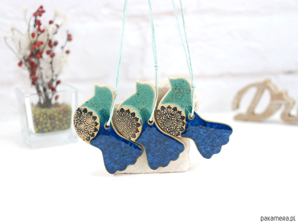 Turkusowe ptaszki w locie - ceramiczne ozdoby wiszące
