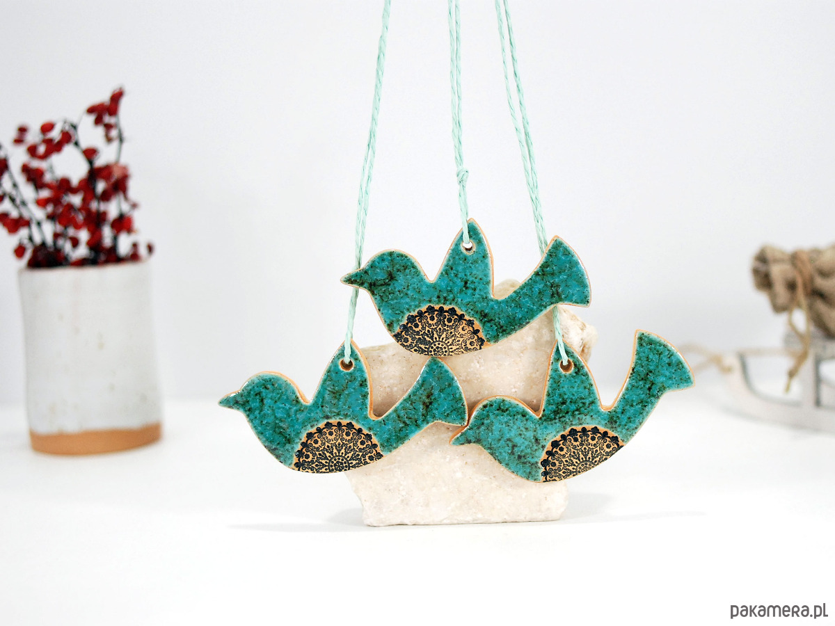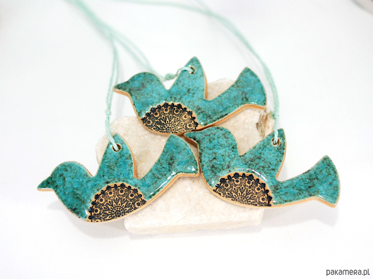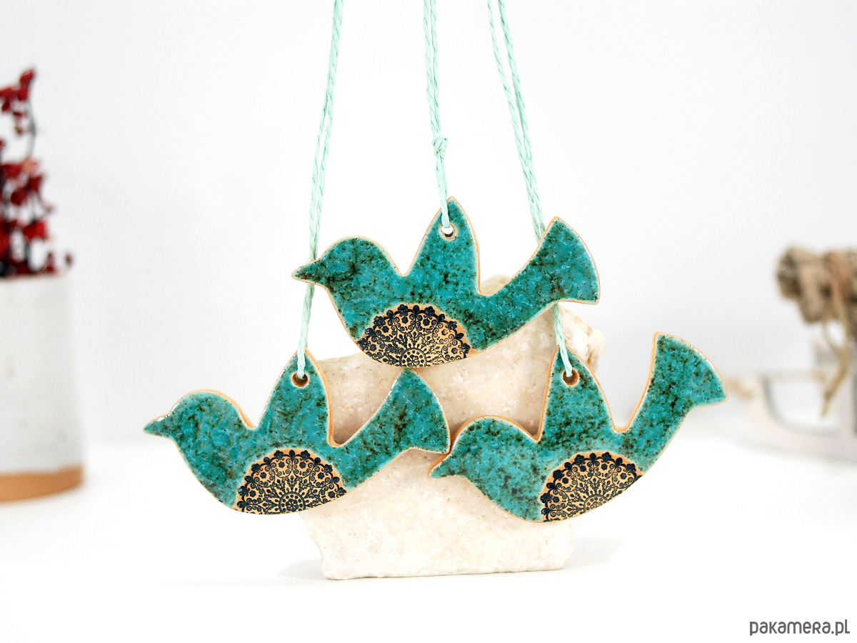 Zestaw zawiera 3 ręcznie robione i malowane ceramiczne ptaszki.