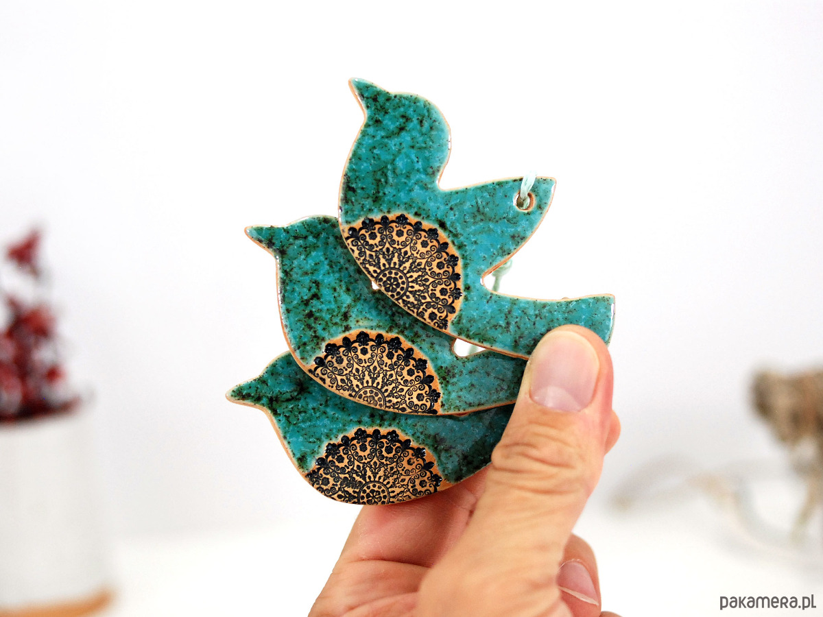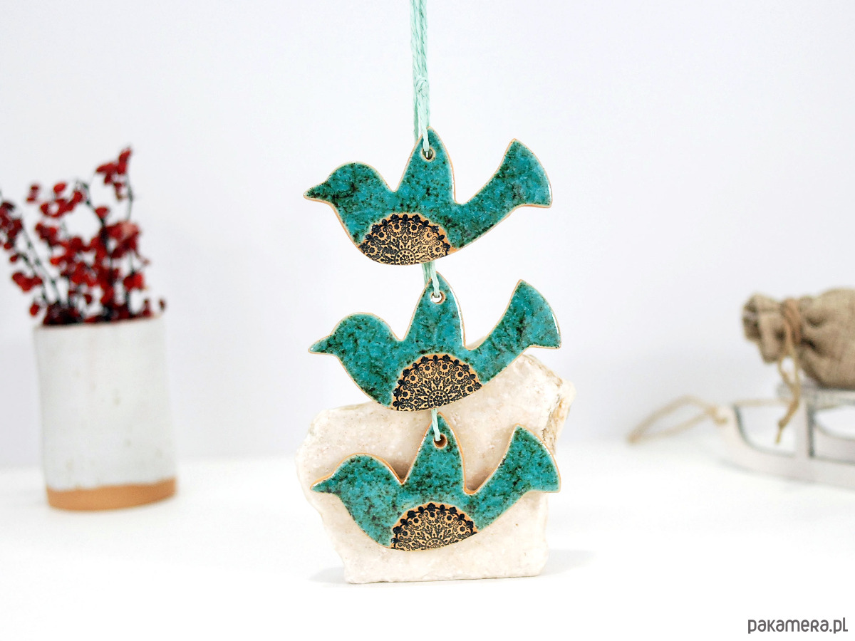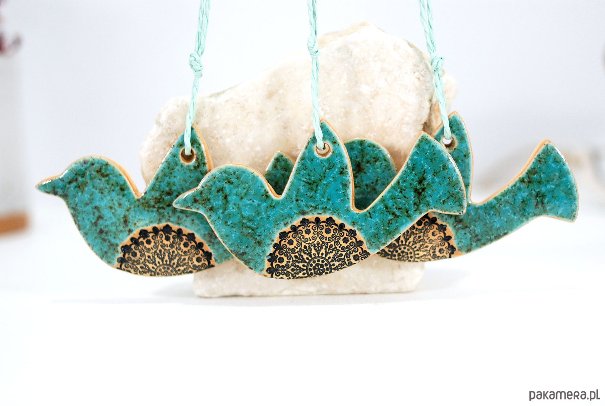 Zestaw zawiera 3 ręcznie robione i malowane ceramiczne ptaszki.