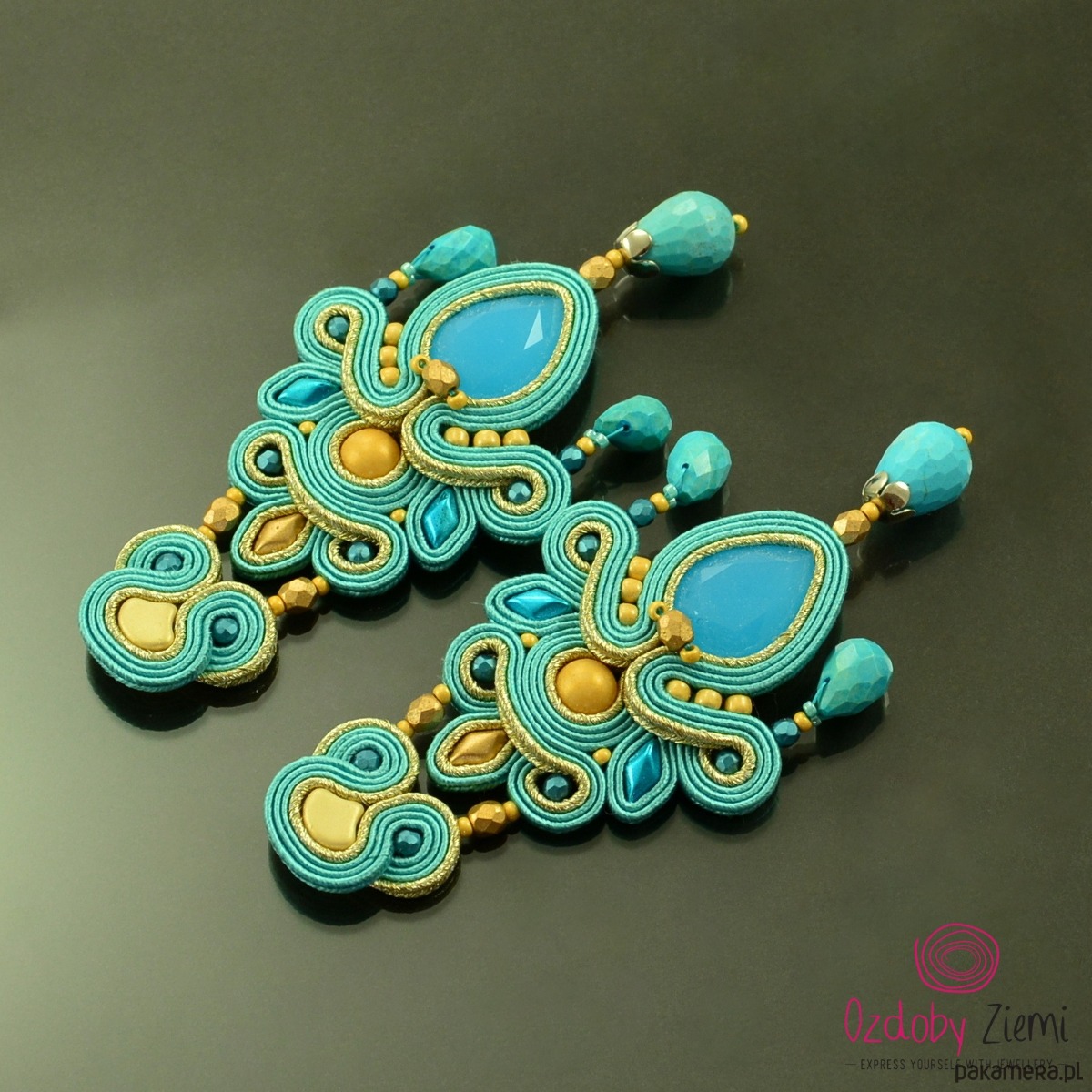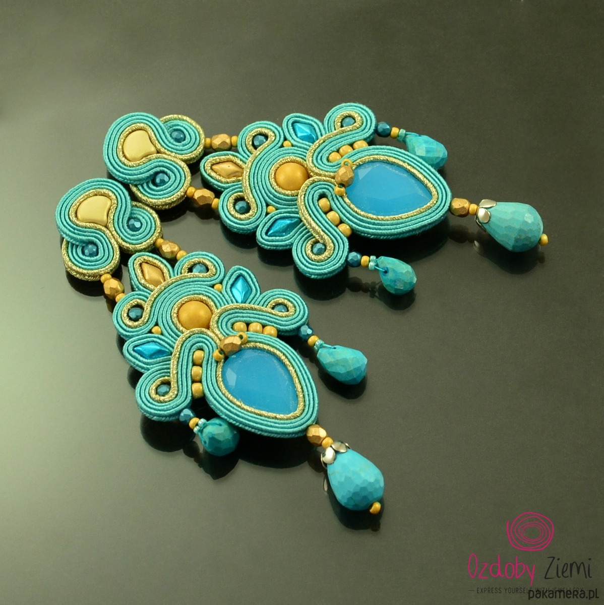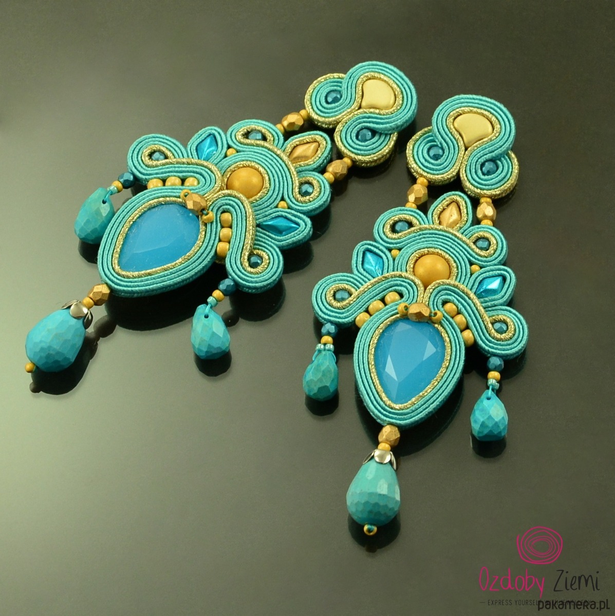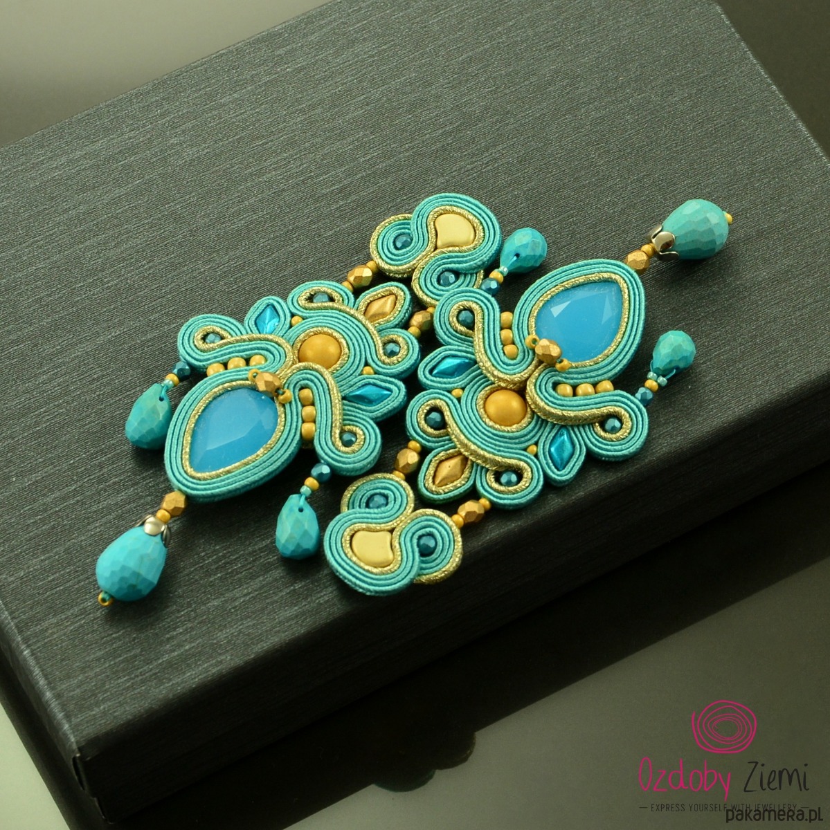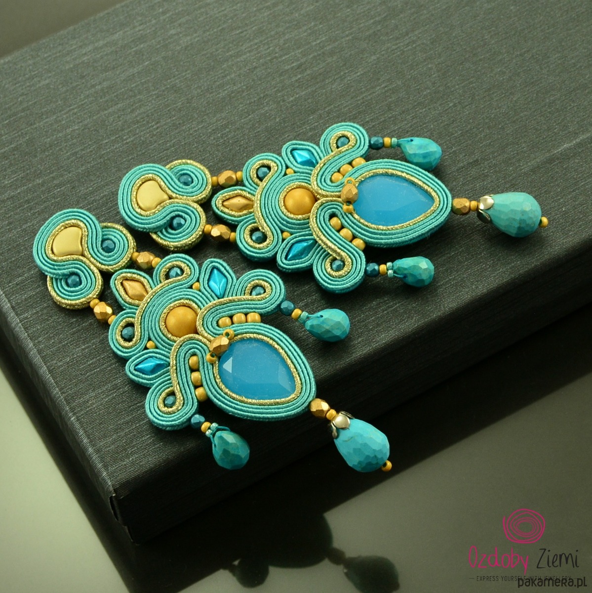 Użyte materiały to wysokiej klasy szklane koraliki w kolorze turkusowym, howlitowe krople, koraliki Fire Polish i Toho, sznurek sutaszowy. Wykorzystałam taśmy sutaszowe w kolorze turkusowym i metalicznym złotym.