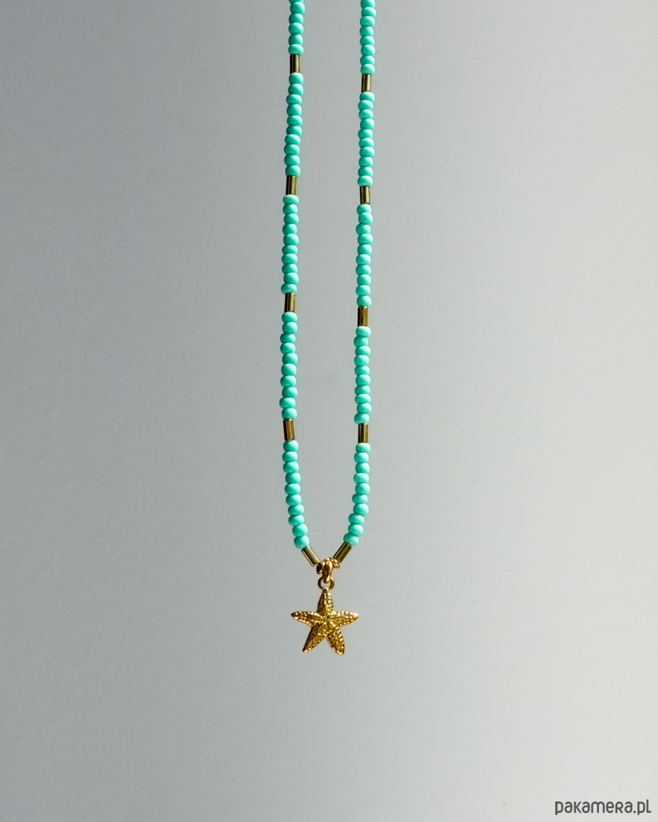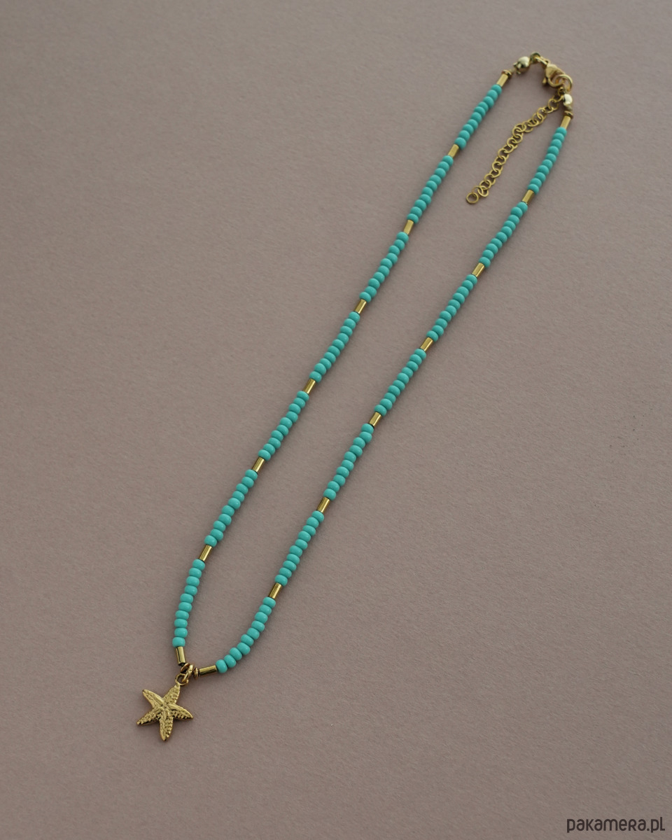 Delikatny naszyjnik na lato wykonany z turkusowych SZKLANYCH KORALIKÓW i złotego HEMATYTU. Zawieszka w kształcie rozgwiazdy wykonana jest ze STALI SZLACHETNEJ w kolorze złotym. Zapięcie i łańcuszek to również stal szlachetna.