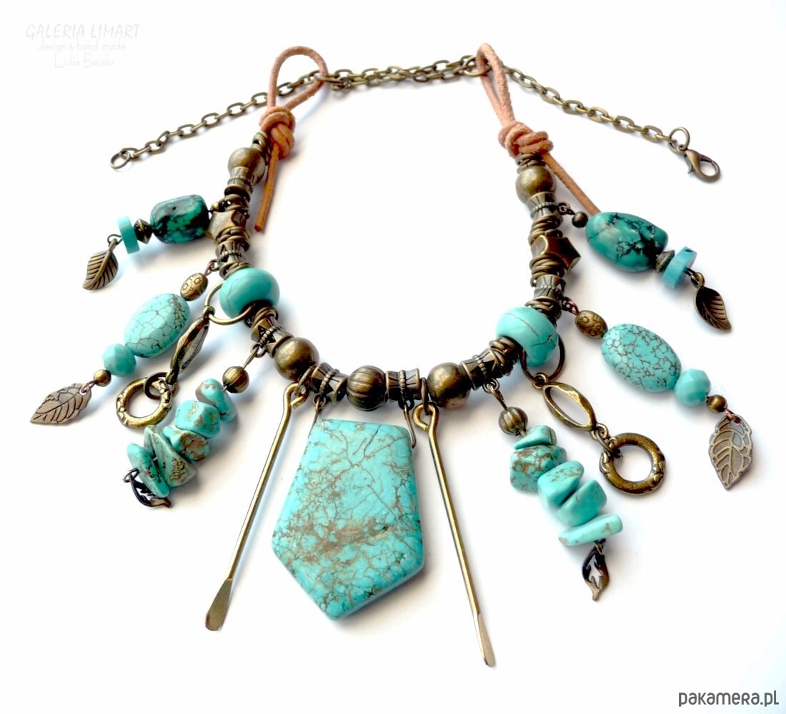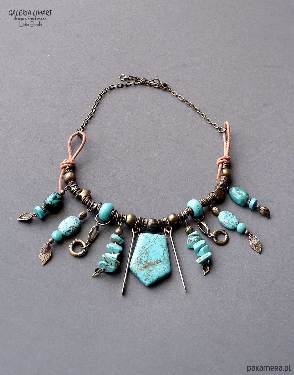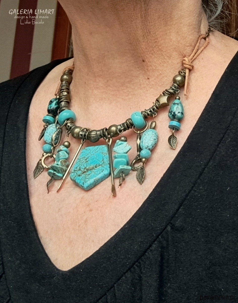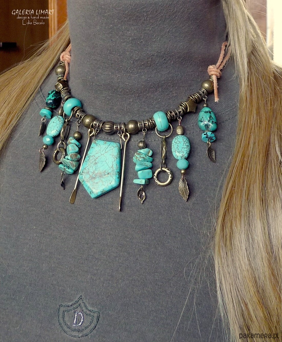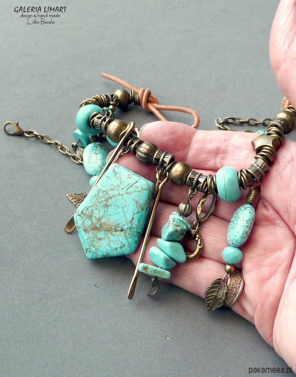 Moja bogata kompozycja naszyjnika w duchu bardzo modnej biżuterii Boho (bohemy, cyganerii artystycznej, new hippie style) z mixu turkusu, howlitu turkusowego, surowego rzemienia oraz ozdób mosiężnych i mosiężnego łańcucha.