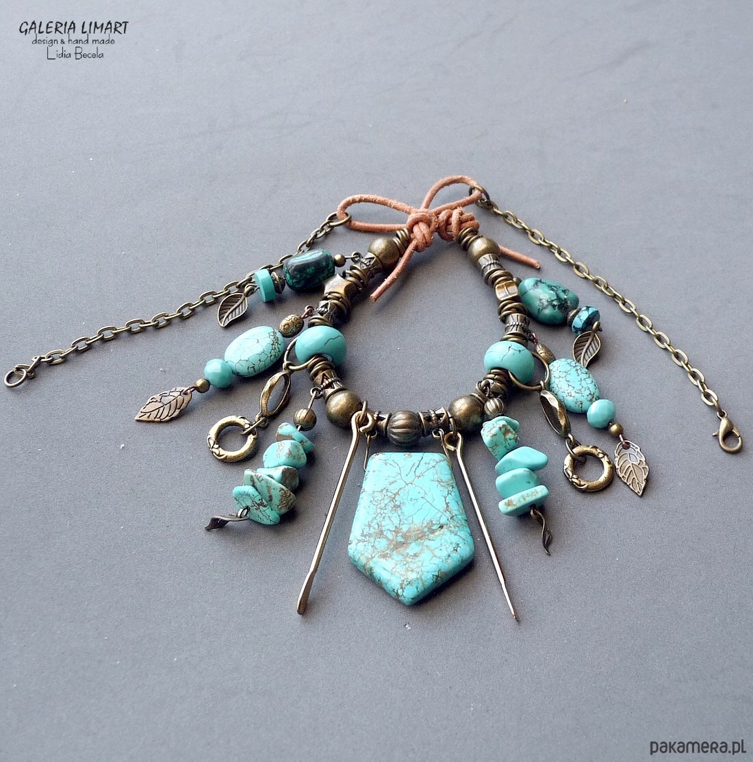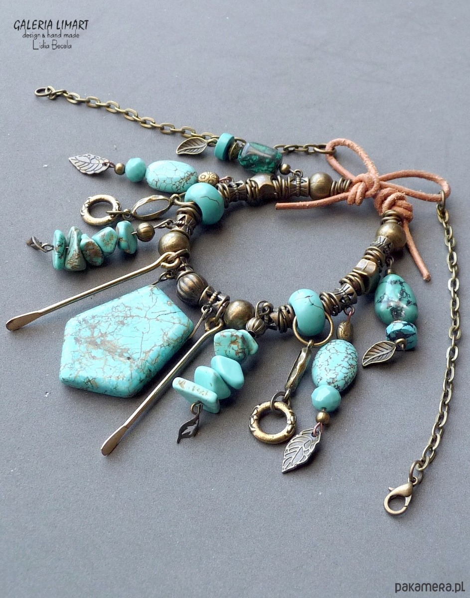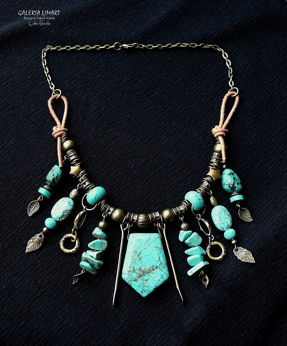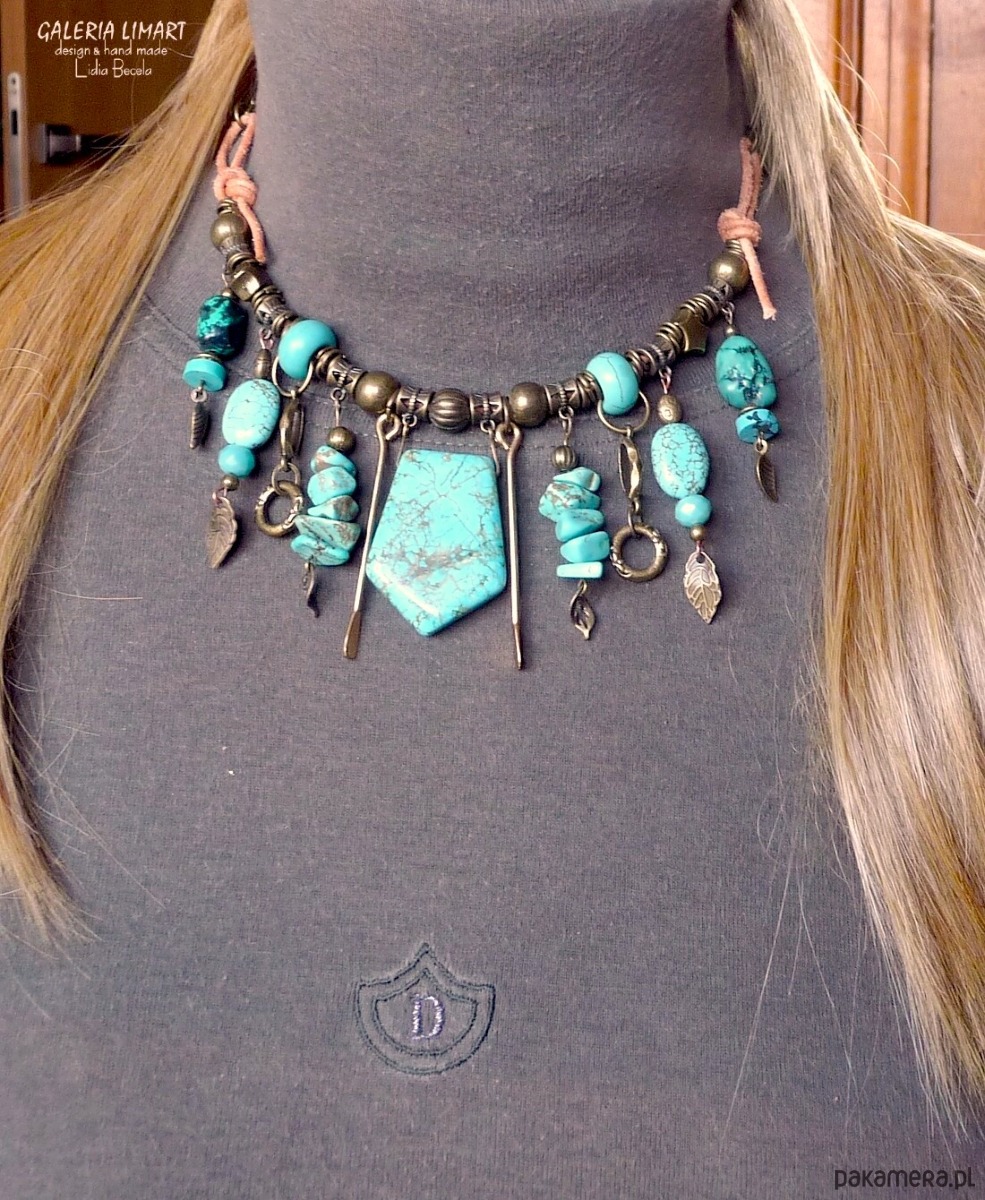 Moja bogata kompozycja naszyjnika w duchu bardzo modnej biżuterii Boho (bohemy, cyganerii artystycznej, new hippie style) z mixu turkusu, howlitu turkusowego, surowego rzemienia oraz ozdób mosiężnych i mosiężnego łańcucha.