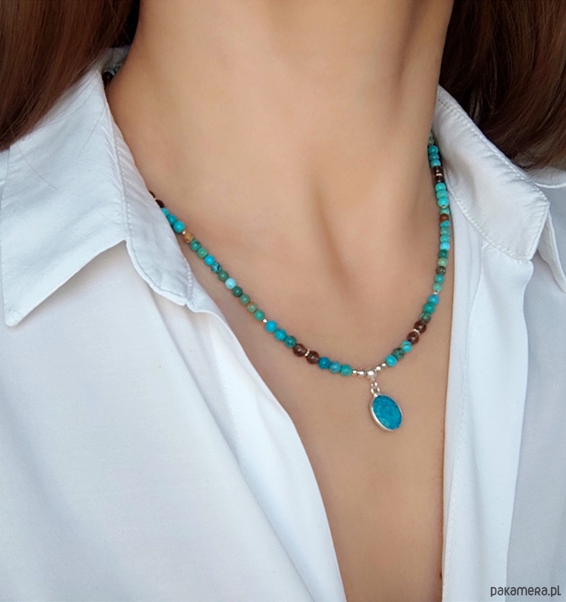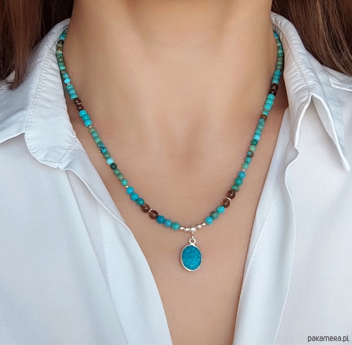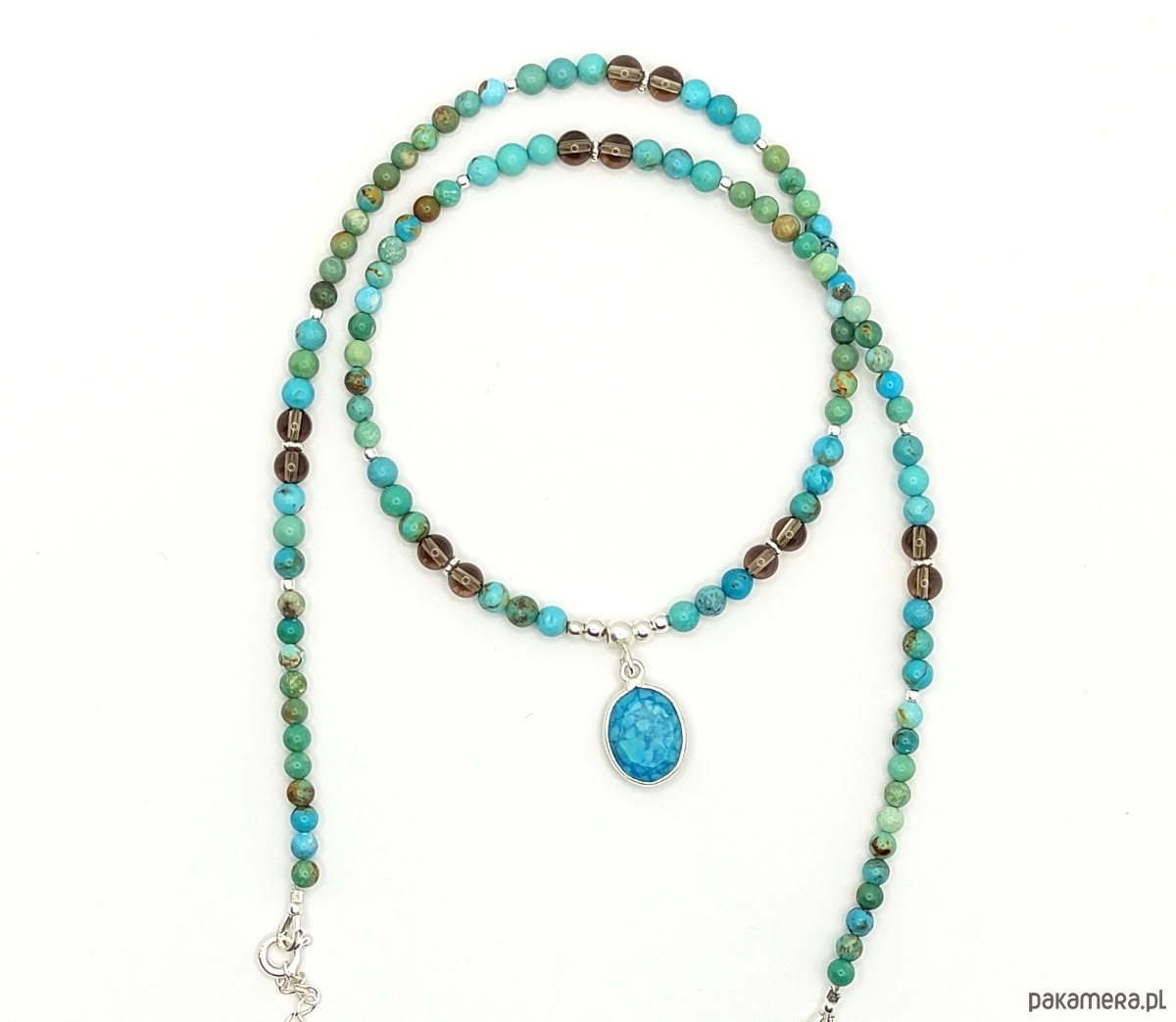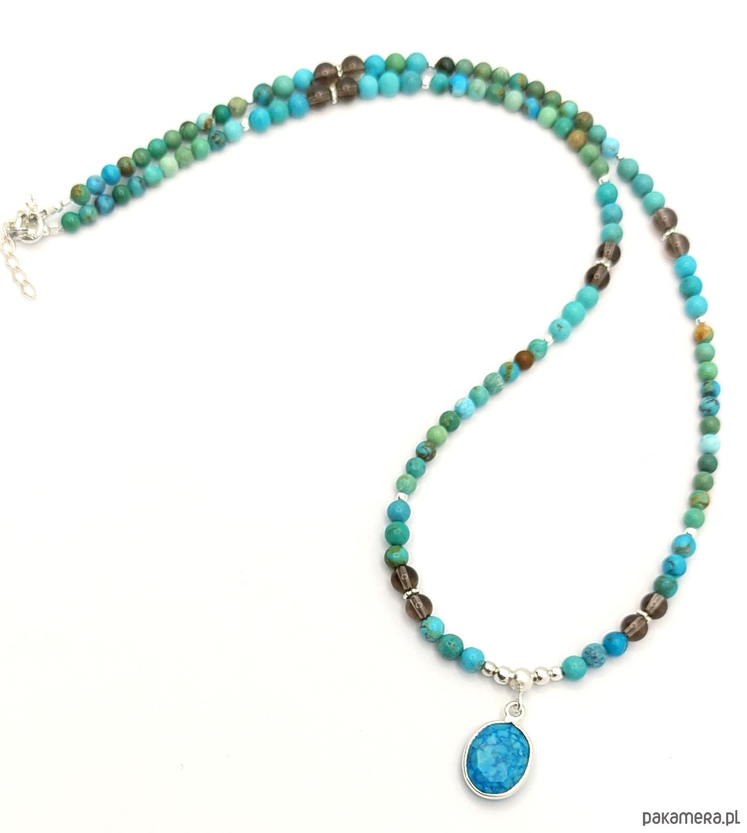 Naszyjnik wykonany z prawdziwego turkusu z dopasowaną kolorystycznie zawieszką z kamienia magnezytu w okuciu ze srebra. Turkus w intensywnych kolorach, niemodyfikowany. Z dodatkiem kilku kamyków kwarcu dymnego.