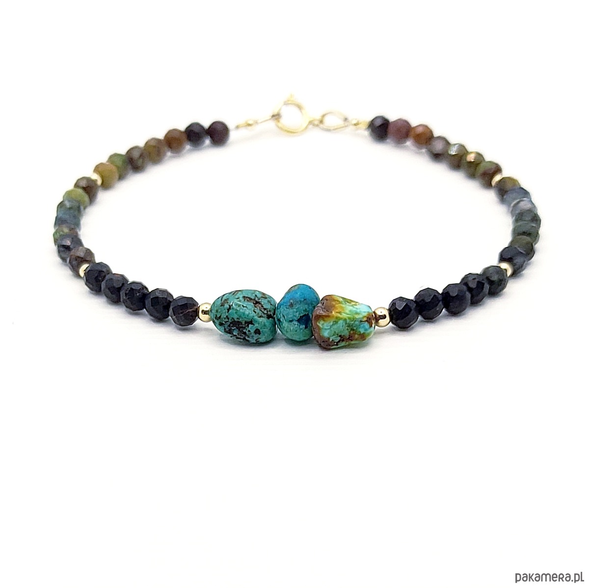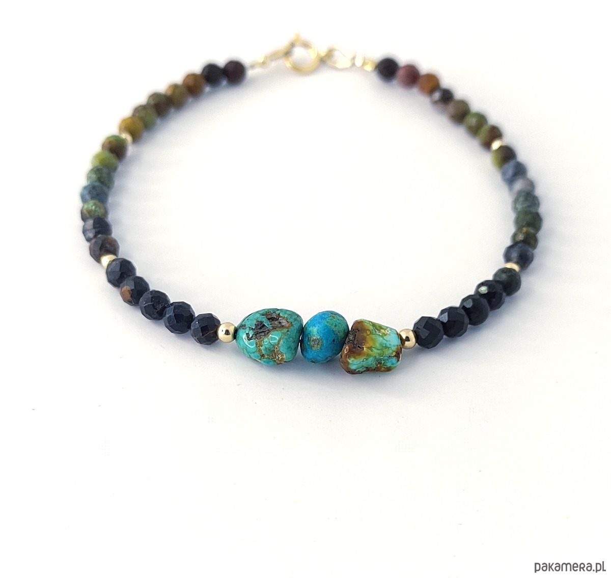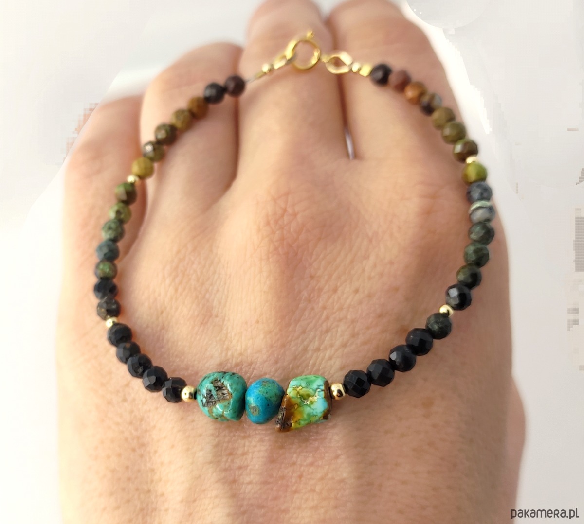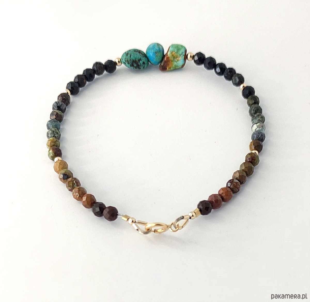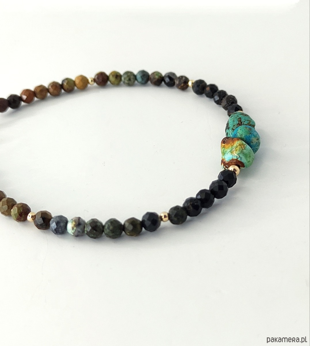 Bransoletka z oryginalnego kamienia turkusu w naturalnych, ciepłych barwach. Uwzględnia cały przekrój kolorystyczny tego kamienia, od czerni, po przypalane brązy, zielenie i błękity. Dzięki stopniowaniu kolorów pięknie zostały wyeksponowane znajdujące się na środku bryłki. Ich niezwykłe barwy przypadną do gustu wszystkim wielbicielkom tego magicznego minerału. Dodatkowo walory podkreślają akcenty ze złota gold filled.