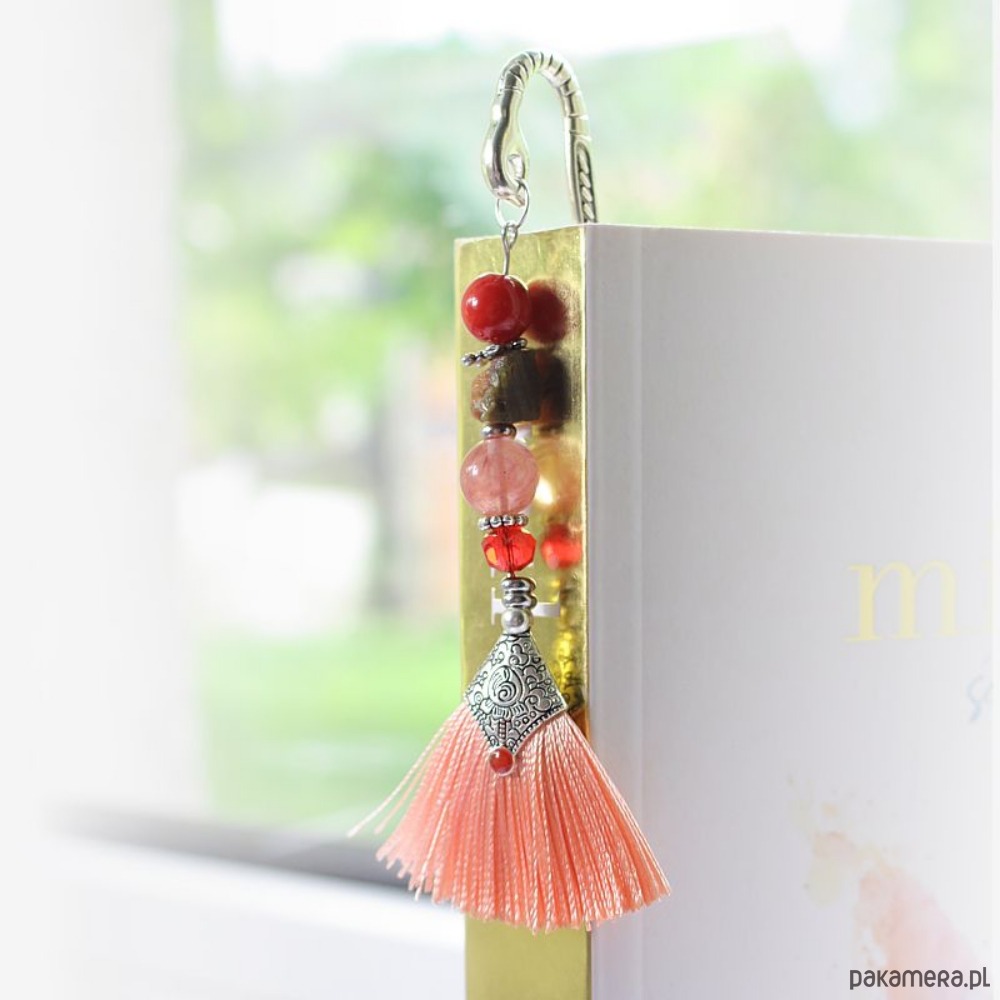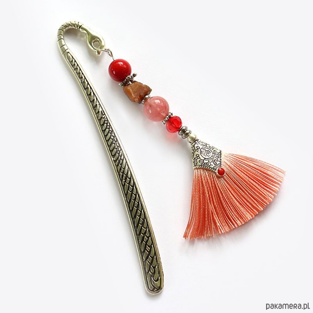 Elegancka etno zakładka do książki w niezwykłym odcieniu różu arbuzowego, z turmalinem arbuzowym i koralem czerwonym.