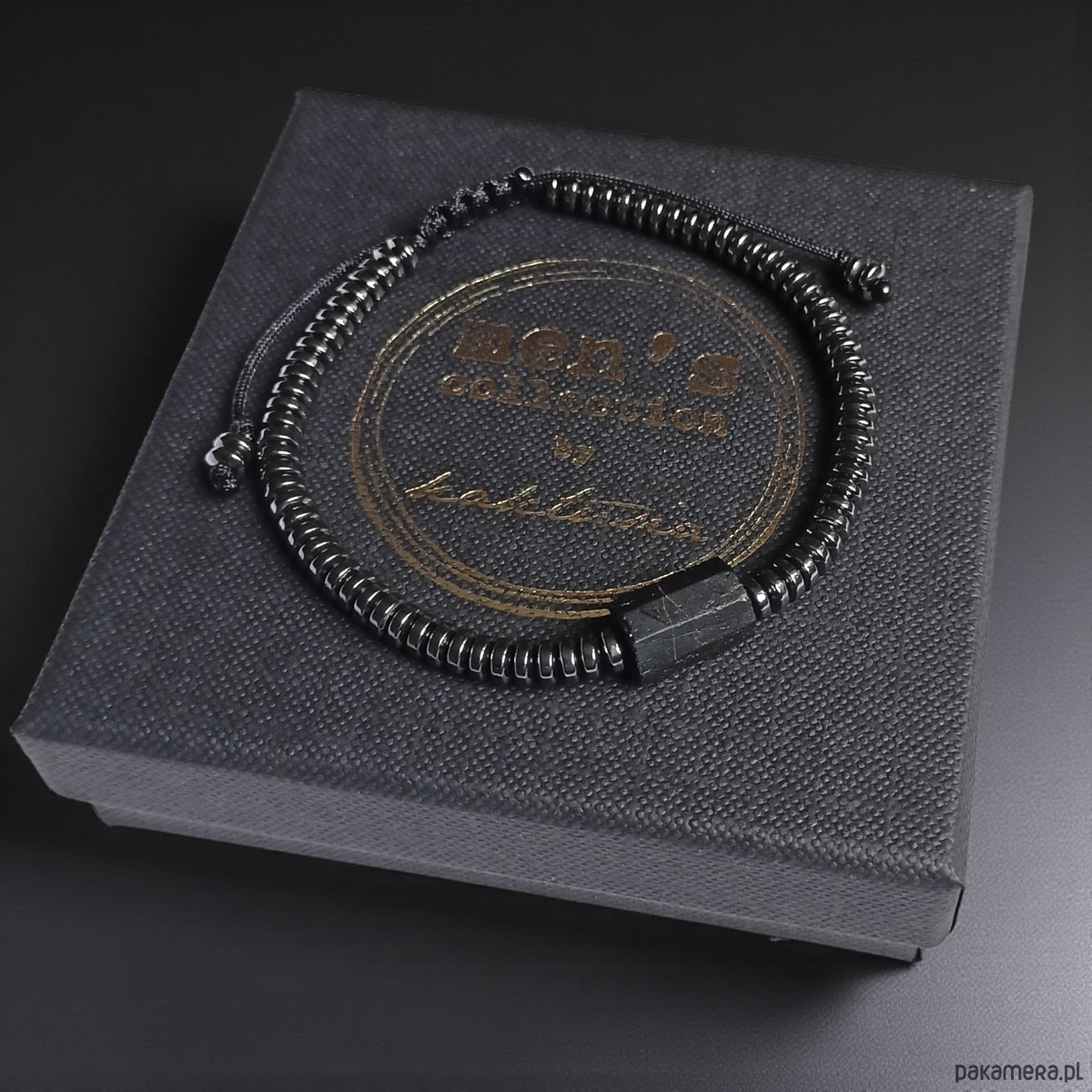 TUTAJ: prosta, lecz ciekawa bransoletka wykonana z talerzyków hematytu grafitowego 4mm, z bryłką surowego CZARNEGO TURMALINUI w centrum.