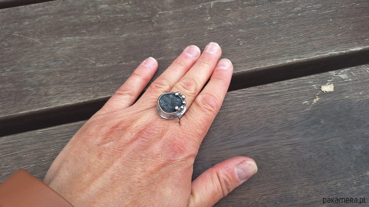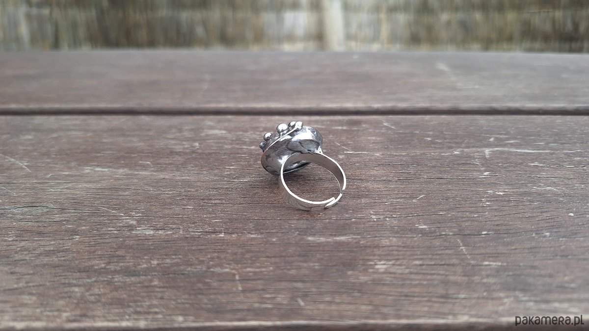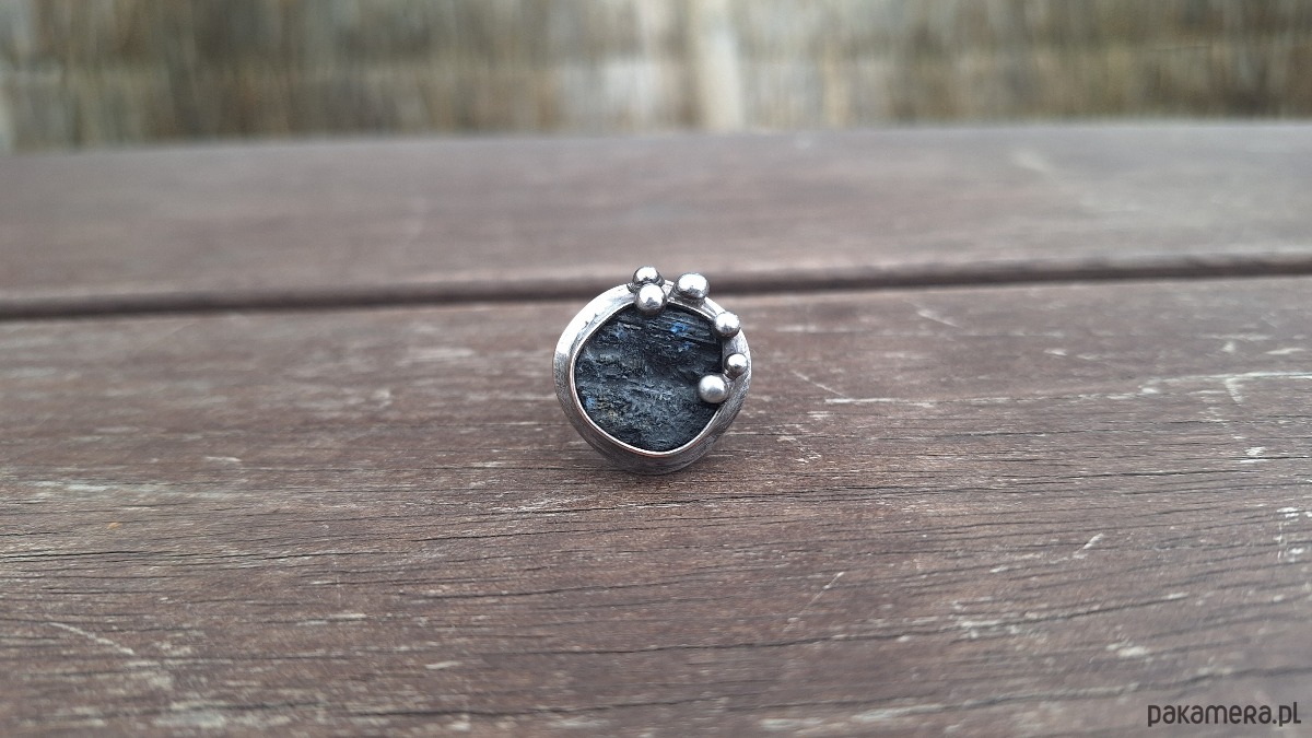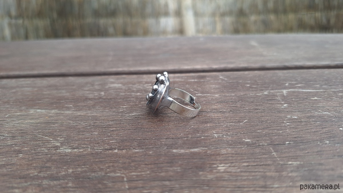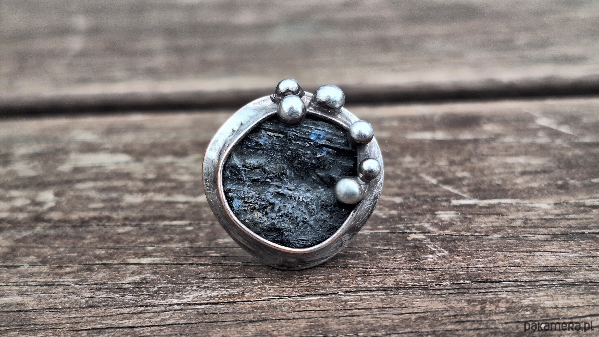 Pierścionek wykonany z miedzi, cyny i turmalinu. Wymiary ok. 2 na 2 cm. Regulowany. Nie jest ciężki.