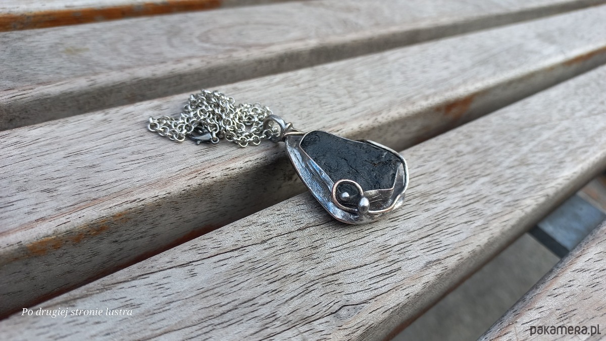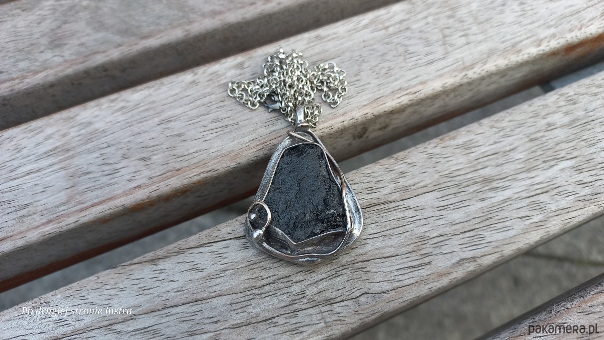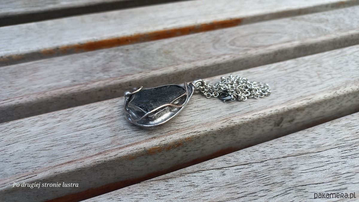 Wisiorek wykonany z miedzi, cyny i surowego, czarnego turmalinu. Wymiary ok. 4 na 3 cm. Łańcuszek o długości ok. 50 cm.