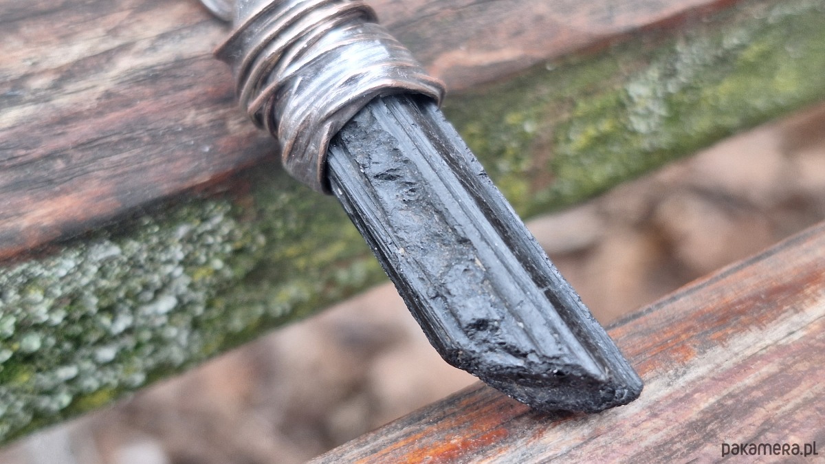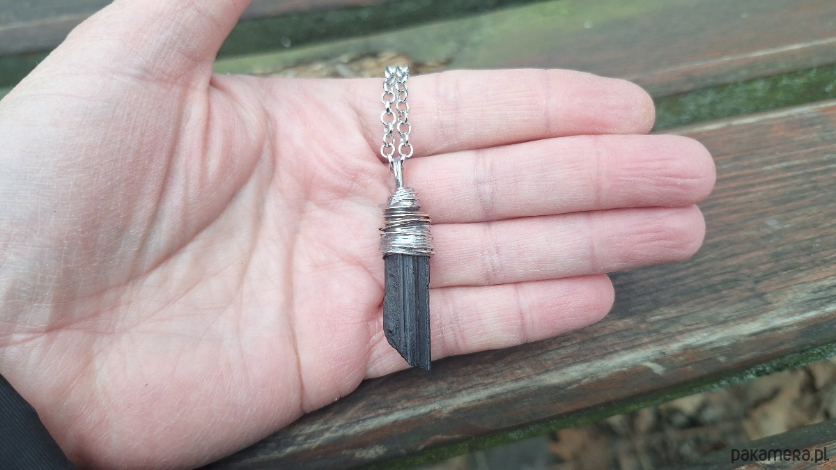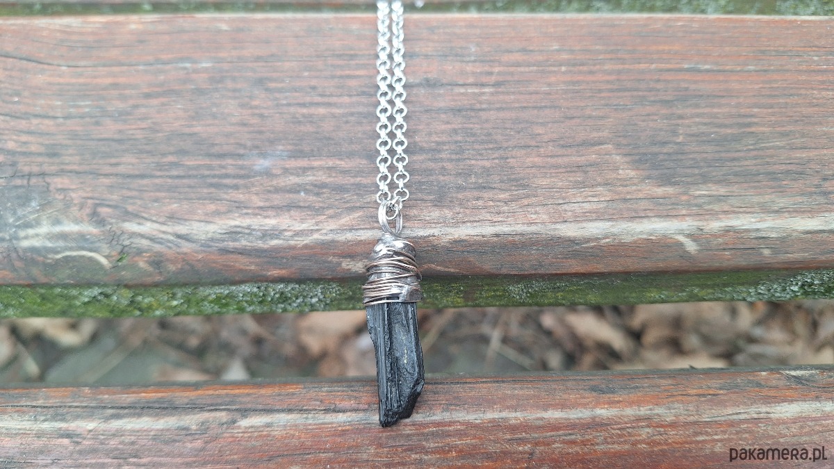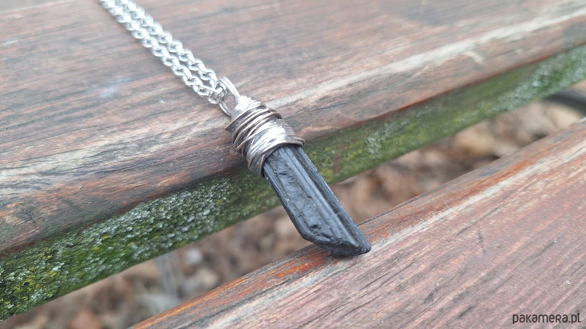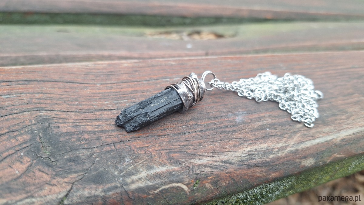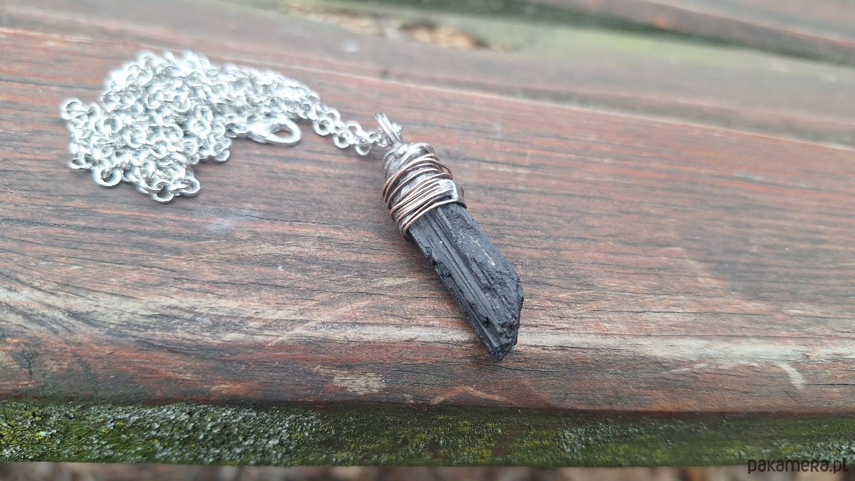 Wisiorek wykonany z miedzi, cyny i surowego, czarnego turmalinu. Wymiary ok. 4 na 1 cm. Łańcuszek o długości ok. 50 cm.