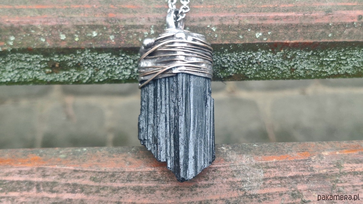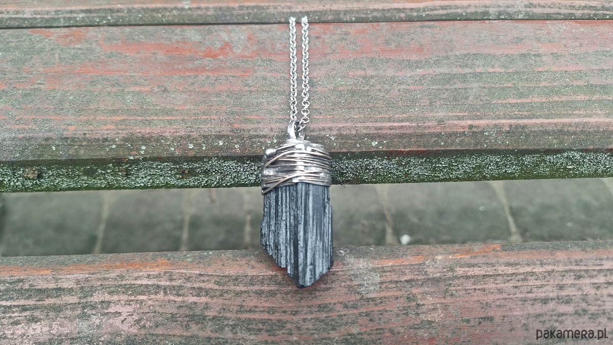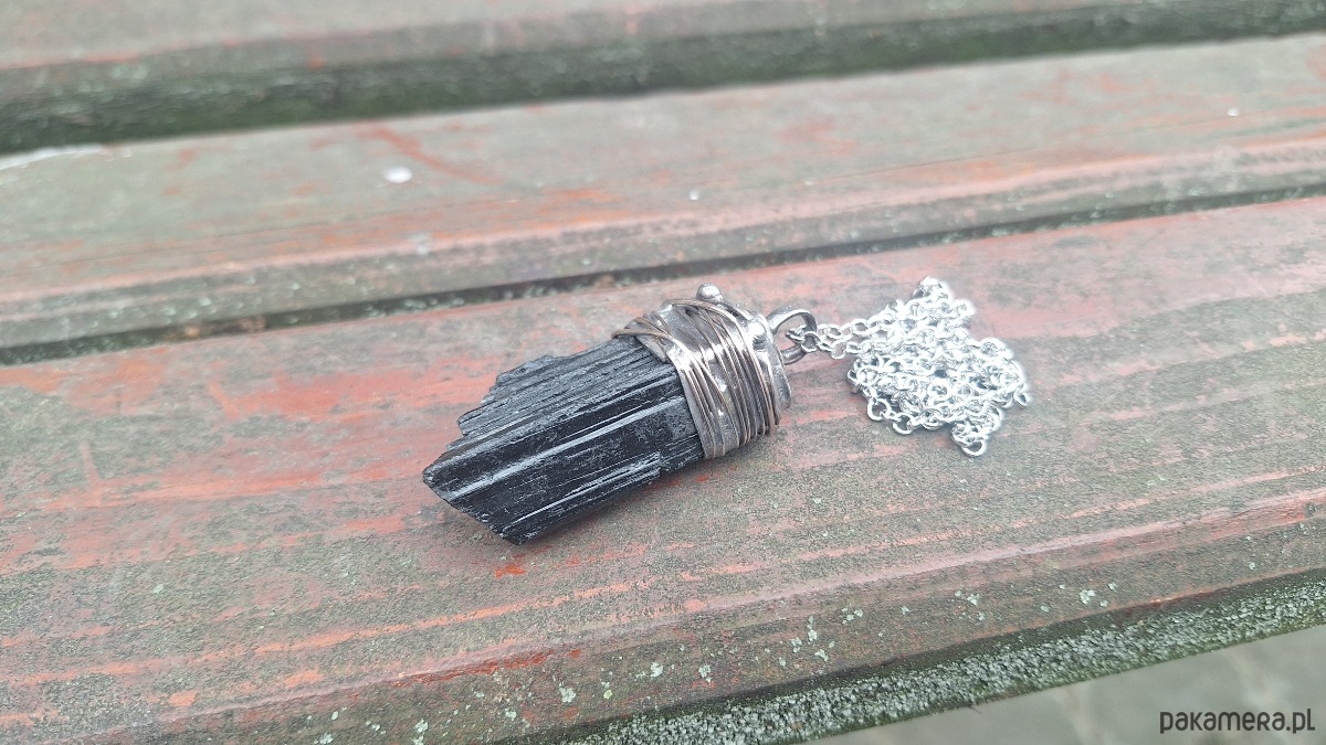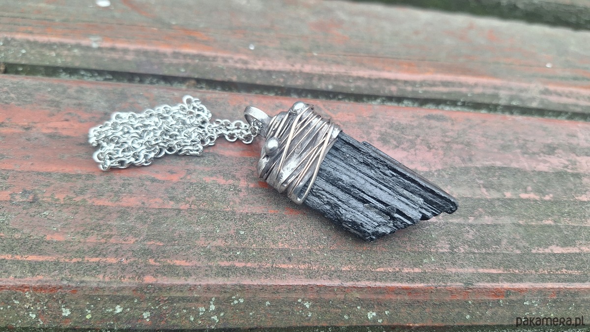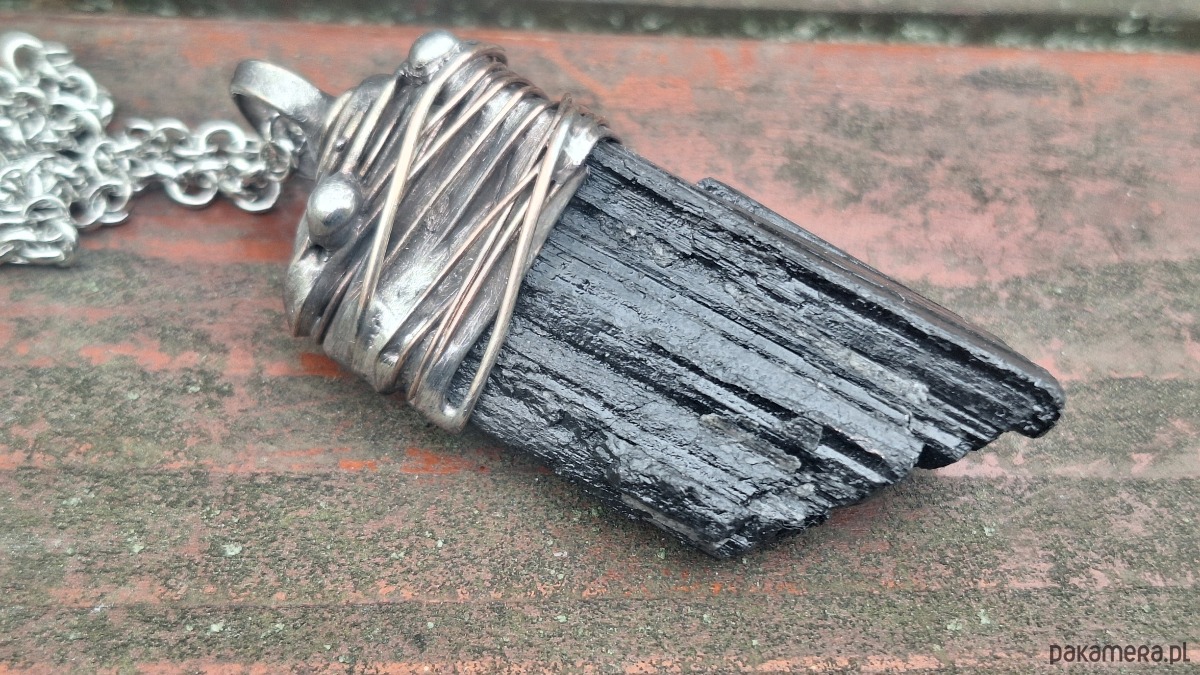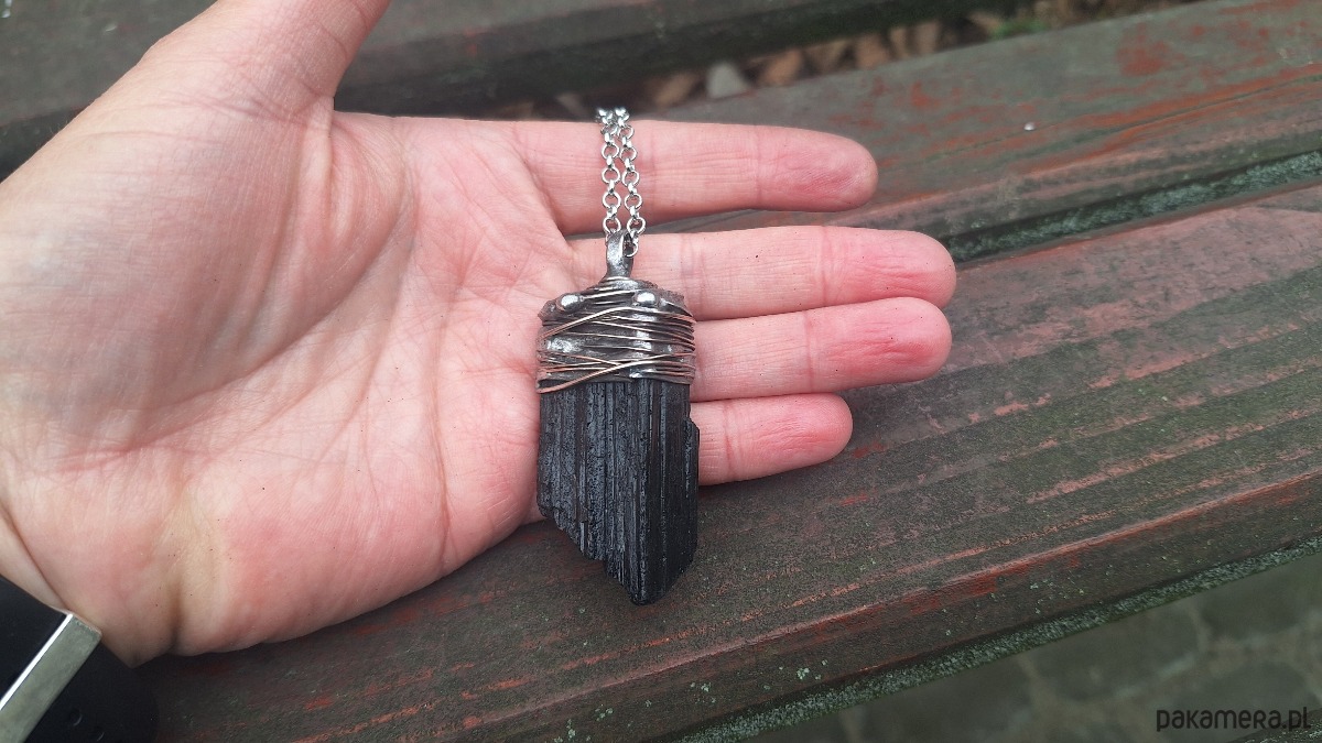Wisiorek wykonany z miedzi, cyny i surowego, czarnego turmalinu. Wymiary ok. 5 na 2.5 cm. Łańcuszek o długości ok. 50 cm.